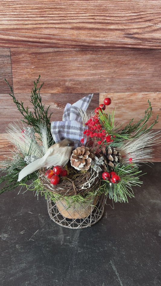 Winter Bird’s Nest Arrangement | Preserved Holiday Greenery & Snow-Kissed Cottage Decor