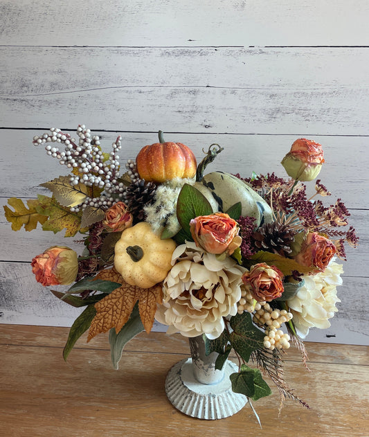 Fall Floral Arrangement with Gourds, Peonies & Pinecones in Vintage Metal Vase – Autumn Table or Mantel Decor