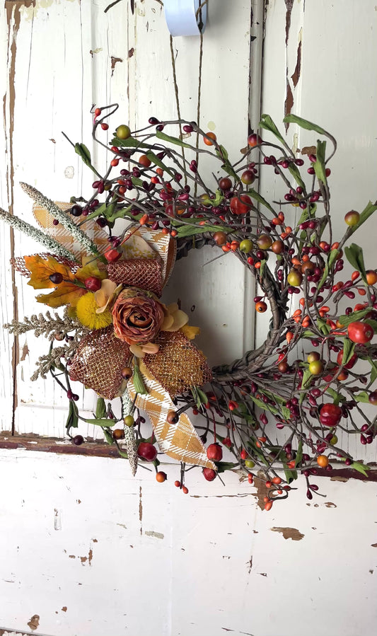 Small Fall Berry Wreath – Orange Roses with Plaid & Glitter Ribbon Accents