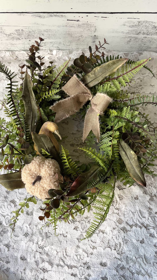 Neutral Fall Wreath with Faux Ferns, Pumpkins & Burlap Bow – Rustic Autumn Door Decor
