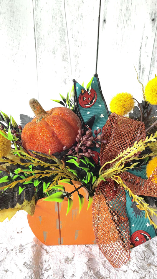 Whimsical Pumpkin Fall Floral Arrangement with Vintage-Inspired Halloween Ribbon