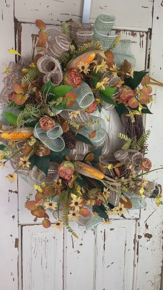 Fall Harvest Corn Wreath – Grapevine Base with Golden Florals & Seasonal Texture