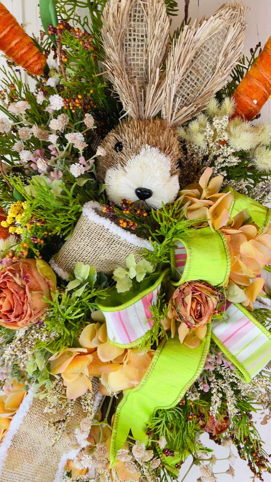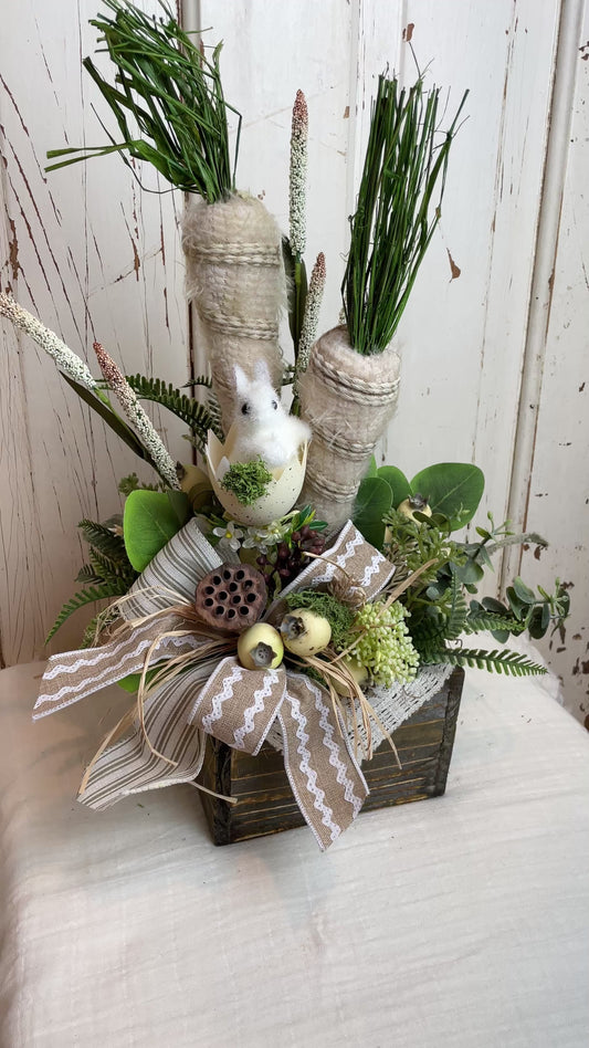 Neutral Cottage & Farmhouse Floral Arrangement with Bunny and Faux Fabric Carrots – Year-Round Centerpiece