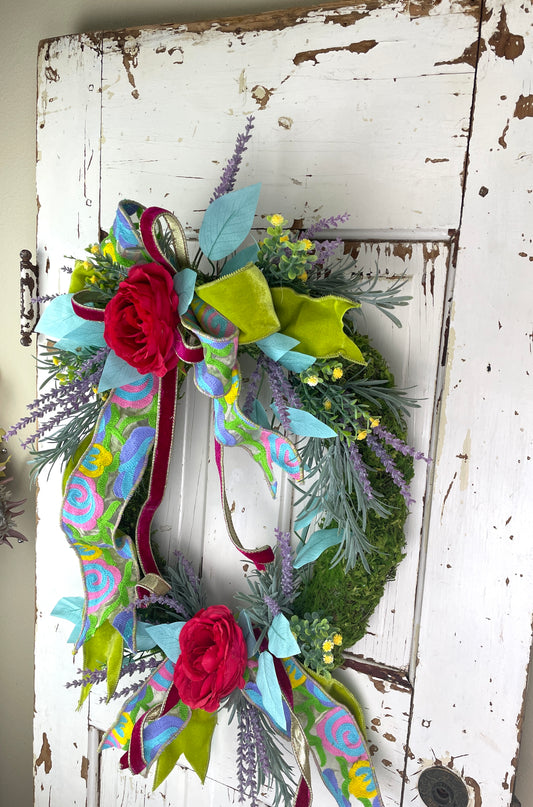 Colorful floral wreath with tapestry ribbon