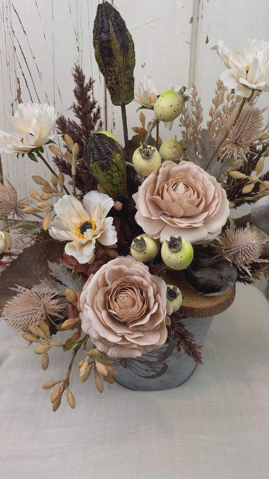 Dried floral arrangement with roses and birds nest