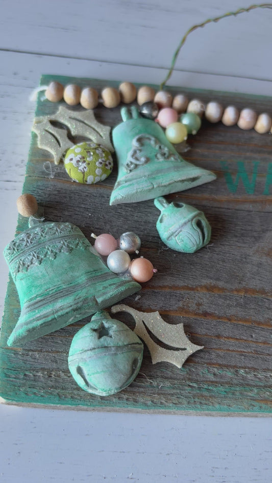 “Warm Winter Wishes” Upcycled Christmas Sign | Mixed Media Holiday Decor with Vintage Beads & Handmade Clay Accents