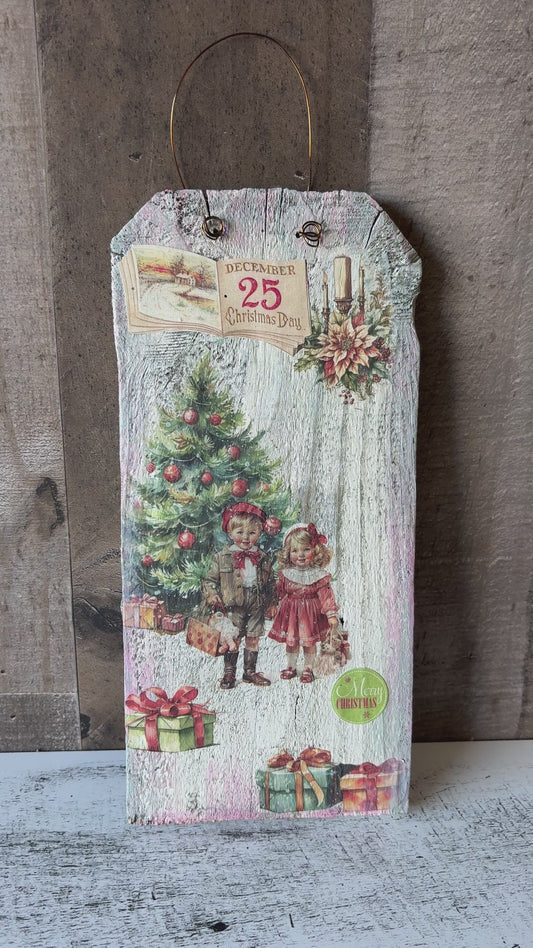 Vintage Christmas Wall Art | Upcycled Wooden Fence Piece with Decoupaged Holiday Scene