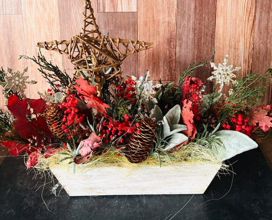 Preserved Woodland Star Holiday Arrangement – Rustic Botanical Christmas Centerpiece with Wood Star