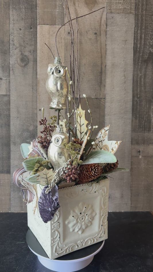 Winter Woodland Owl Arrangement – Metallic Owls, Velvet Ribbon & Holiday Greens