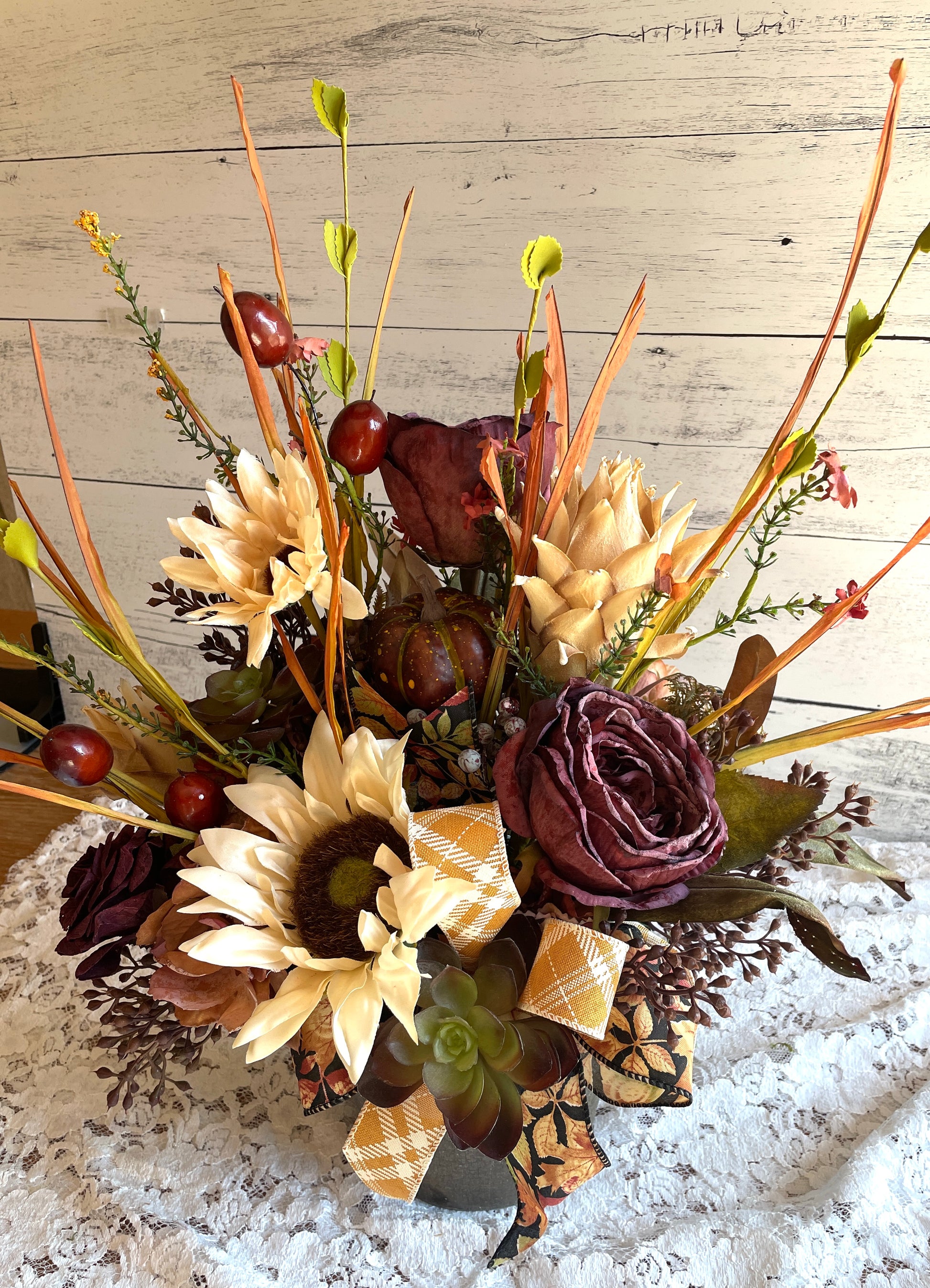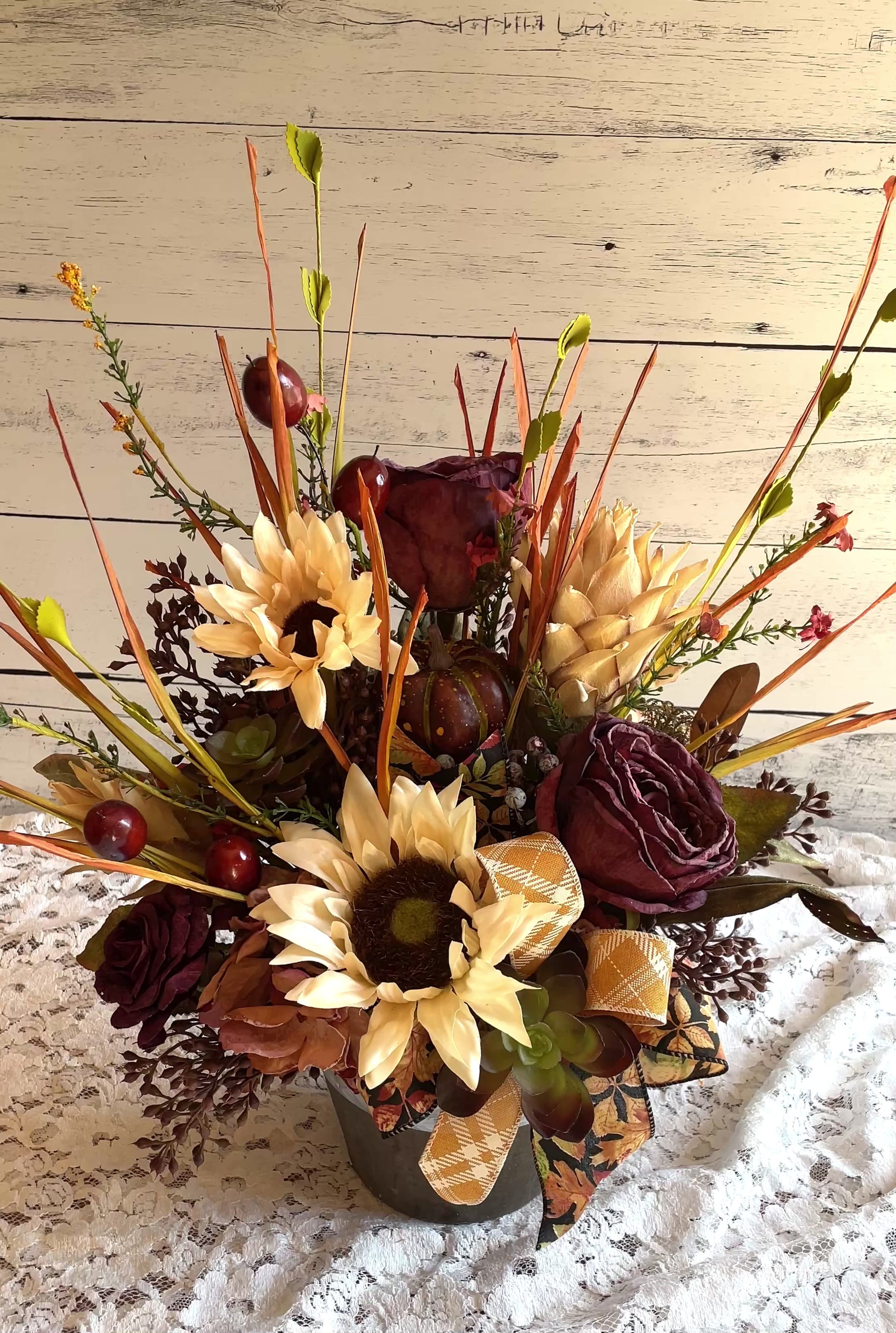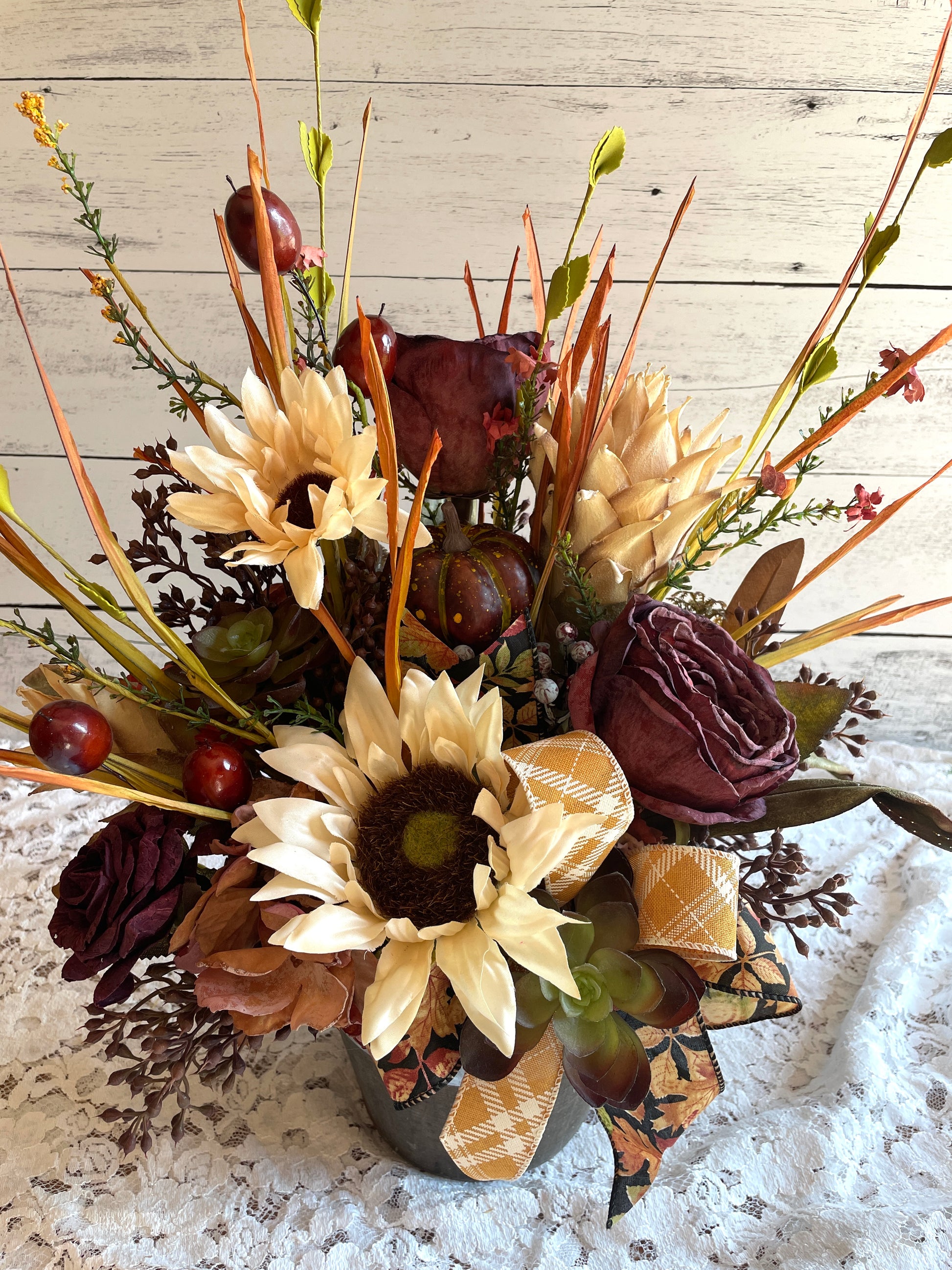 Includes pumpkins, sunflowers, burgundy roses, faux succulents, and fall foliage