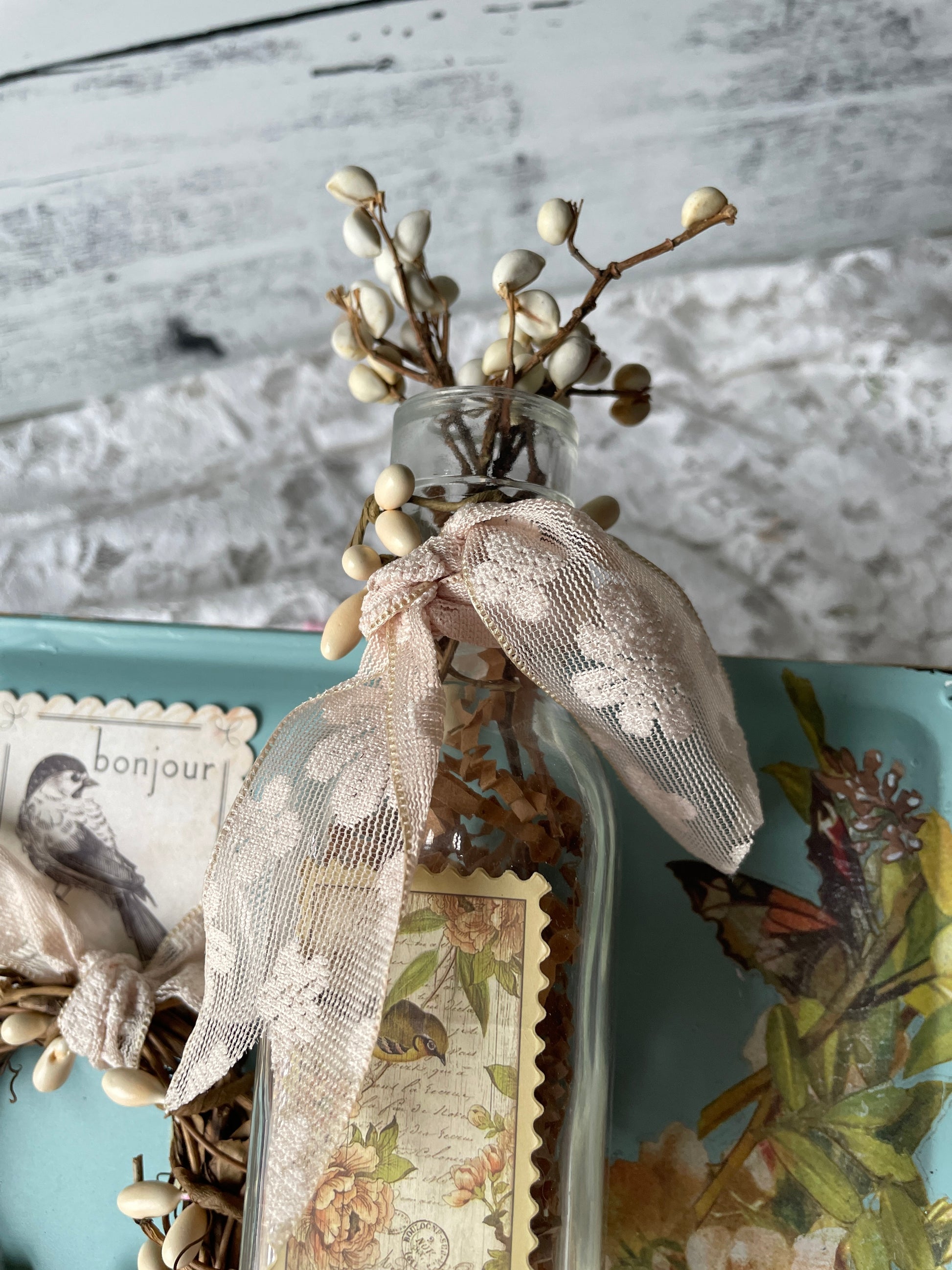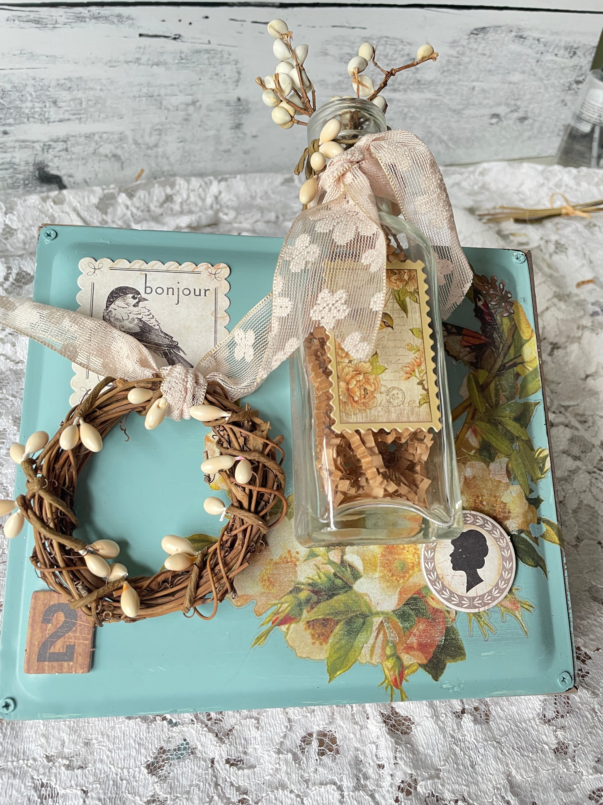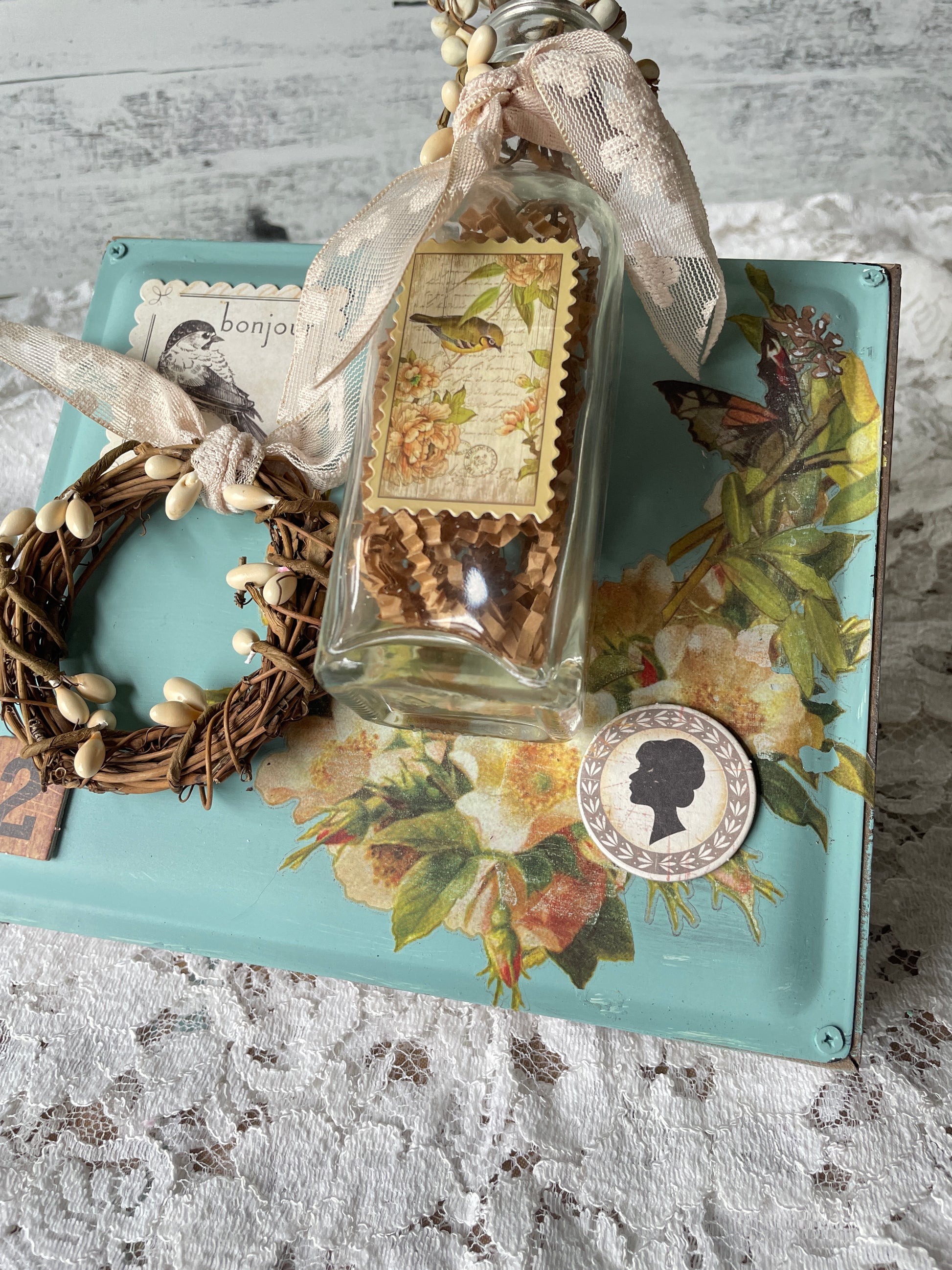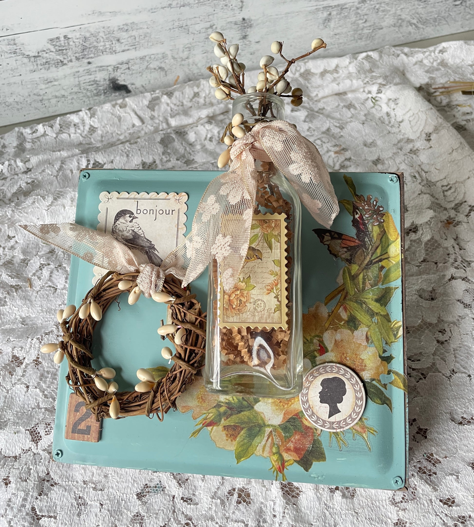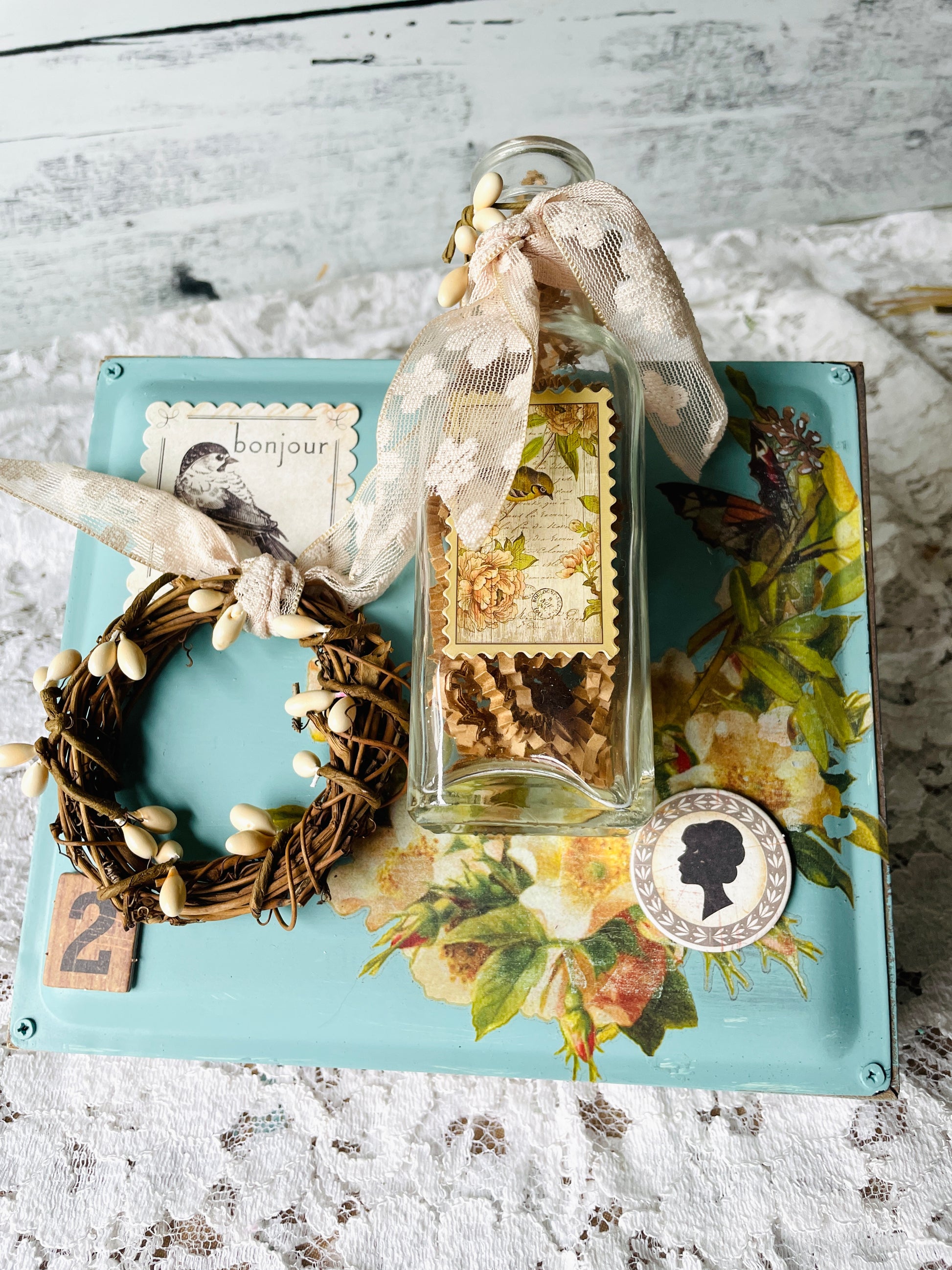 Add a touch of vintage whimsy to your home with this one-of-a-kind nature-inspired assemblage art piece by Lavender Blue Floral Artistry. Styled on a soft aqua shadow box, this layered vignette features a delicate glass bottle filled with vintage-style paper ephemera and topped with creamy berry sprigs and a soft lace ribbon. A tiny wreath of grapevine and pods adds earthy texture, while botanical prints and antique-style silhouettes lend a nostalgic French country charm.