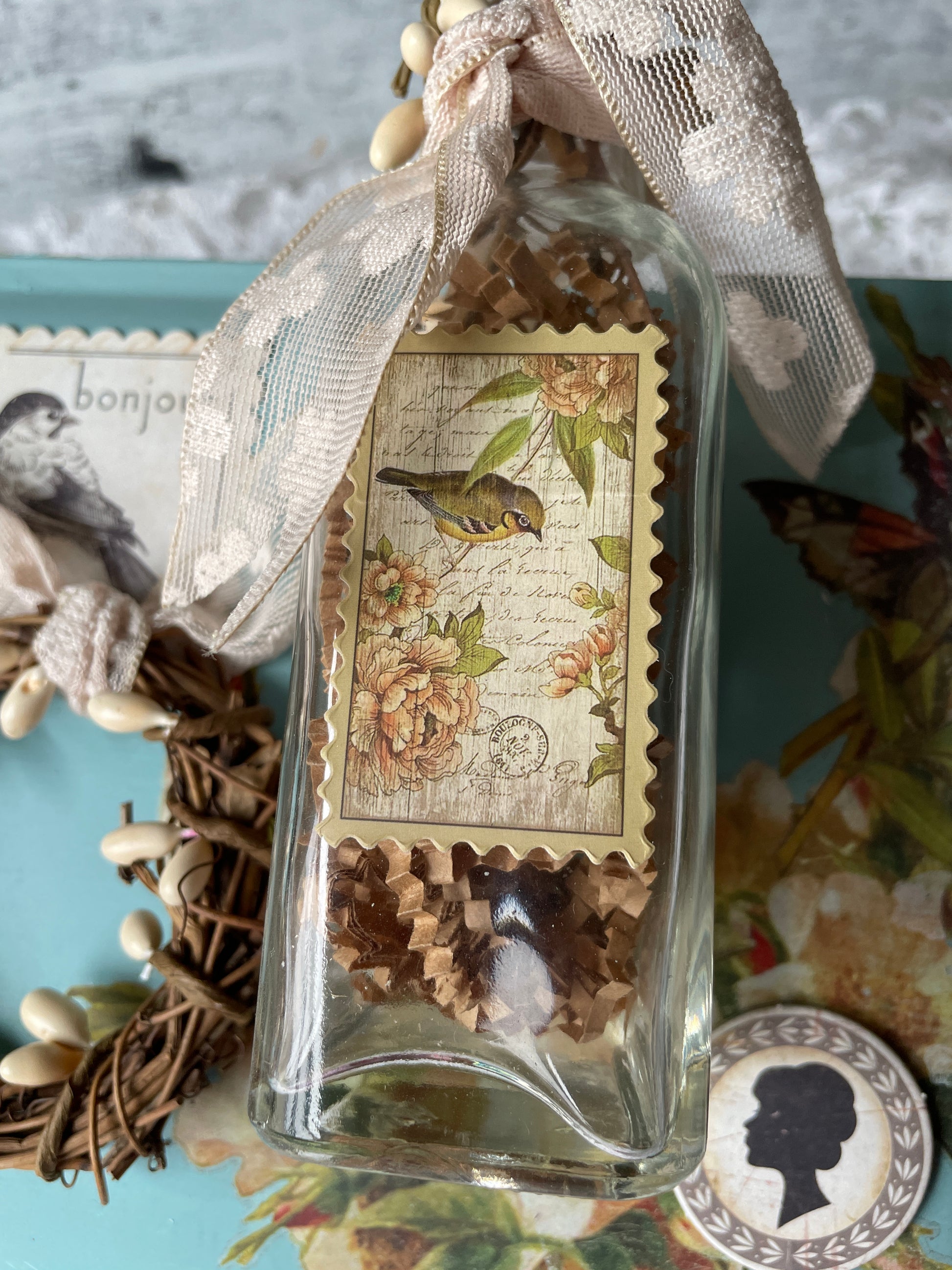 • Decorated with real botanicals, paper ephemera, ribbon & glass bottle