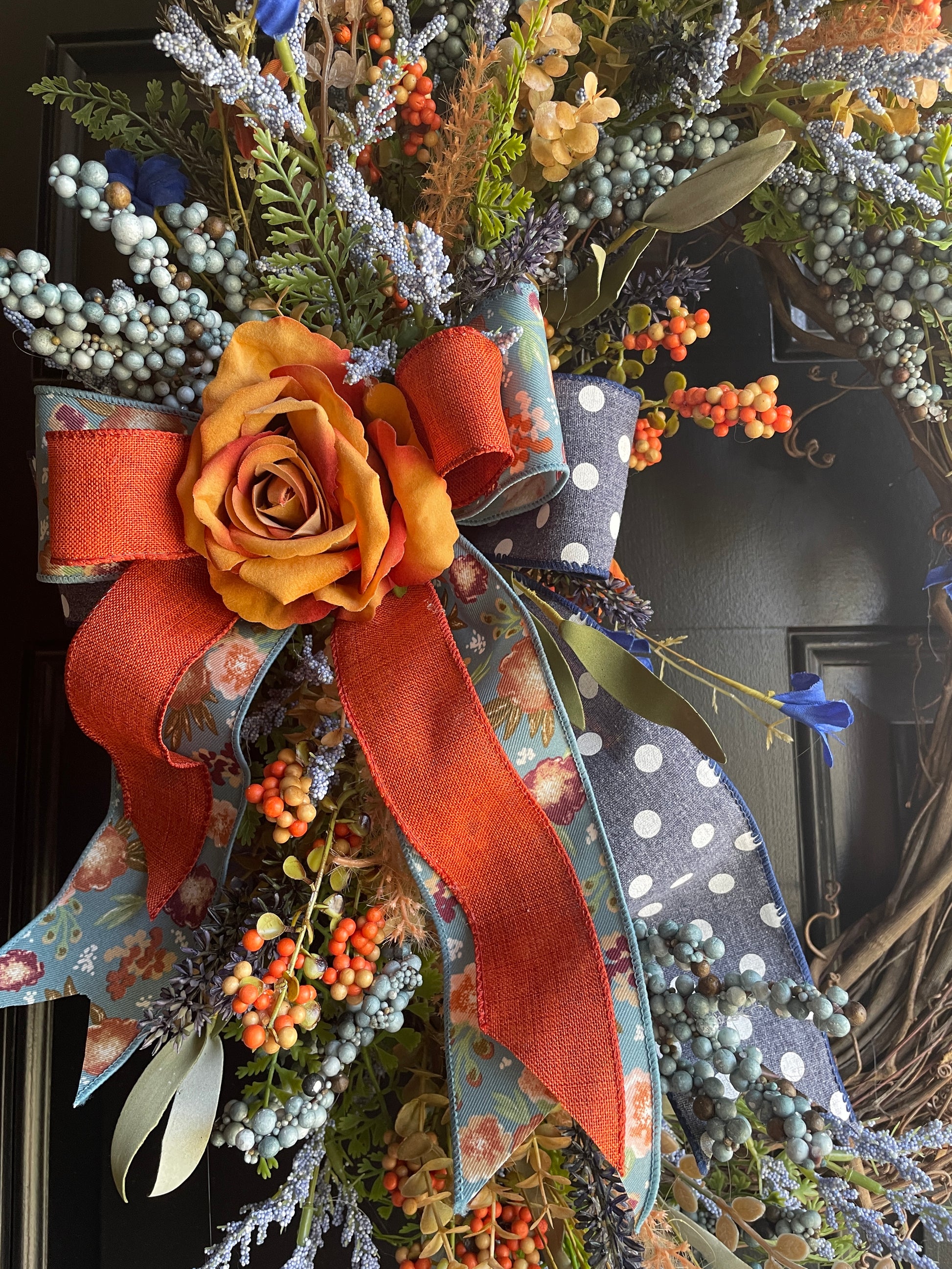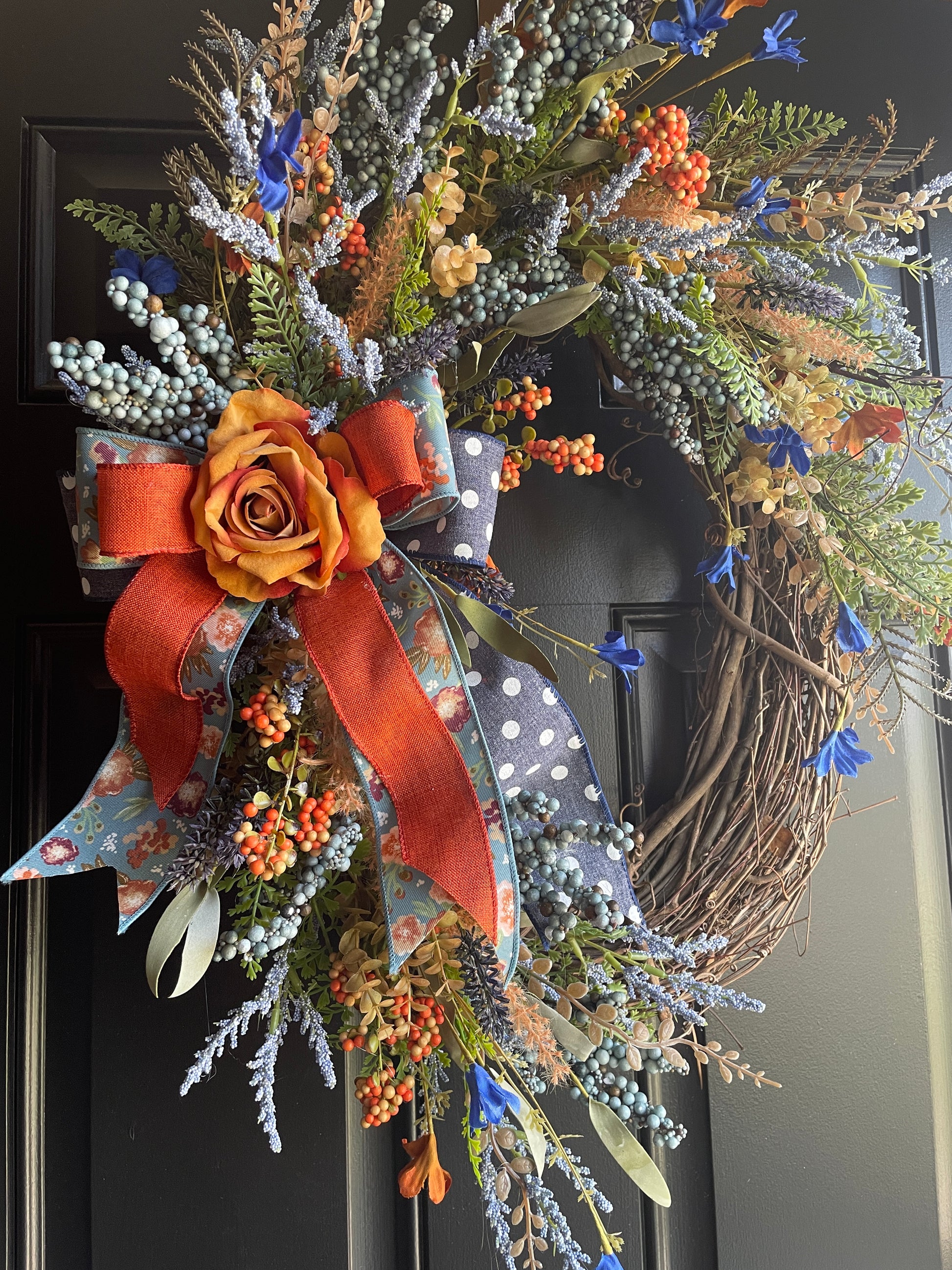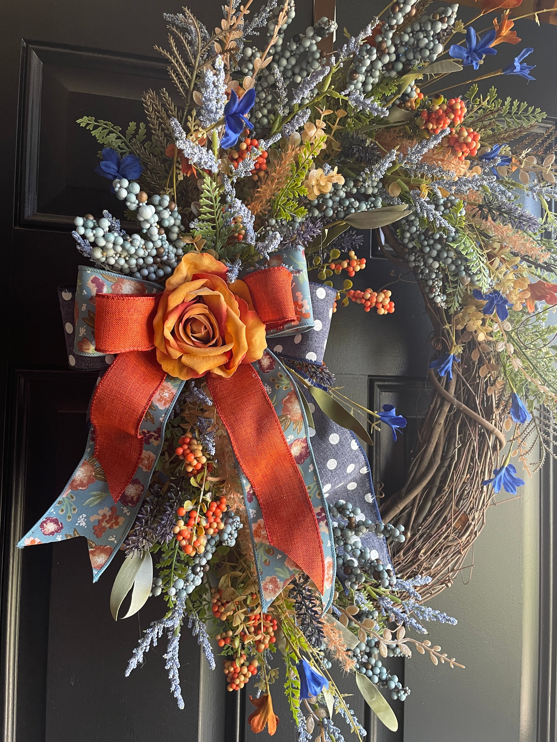 This handcrafted oval grapevine wreath features a delightful mix of orange roses, blue lavender, and vibrant berries, all carefully arranged on a rustic grapevine base. Accented with a luxurious floral ribbon, this wreath captures the essence of fall and Thanksgiving, making it a perfect addition to your seasonal decor.