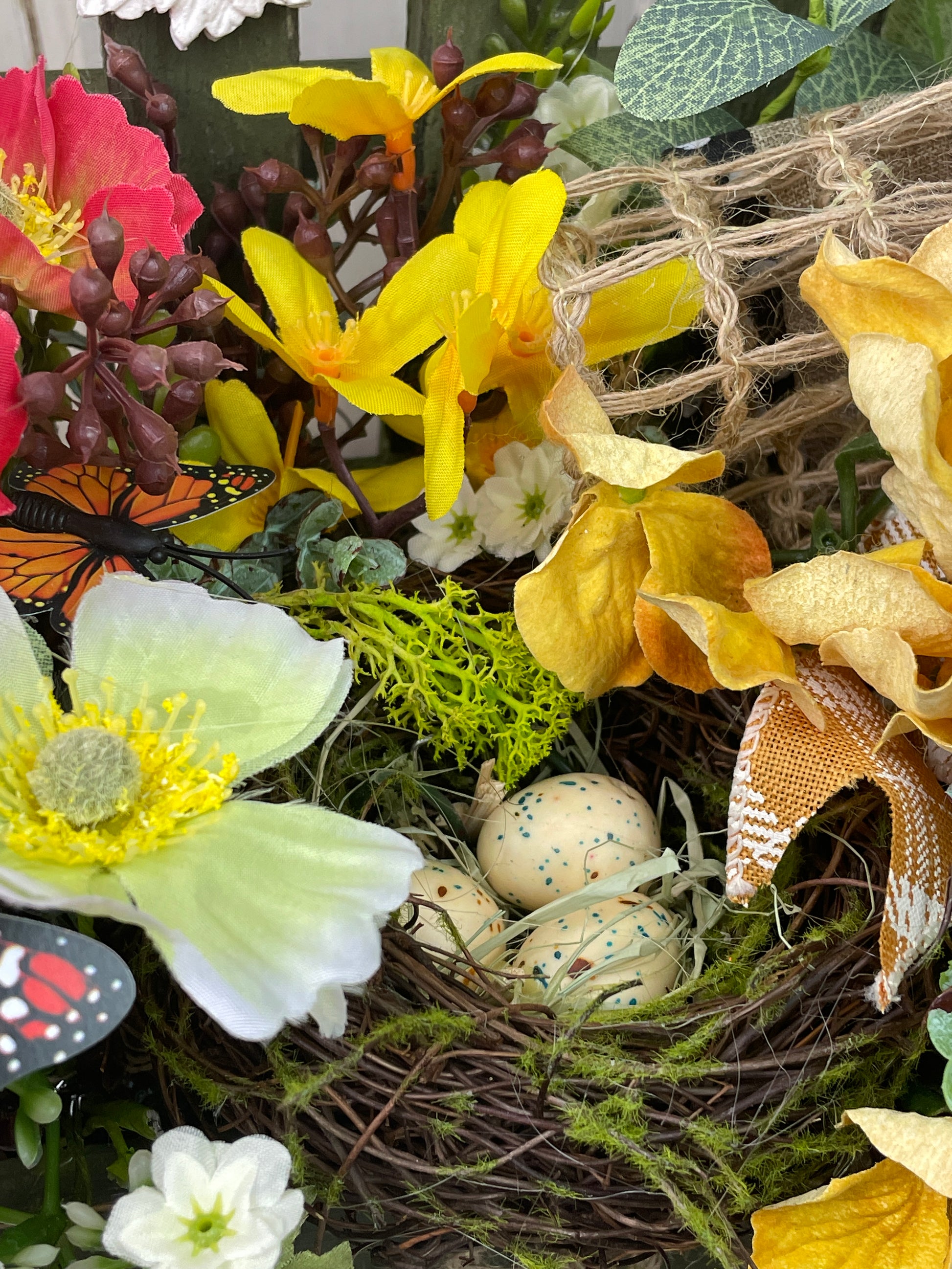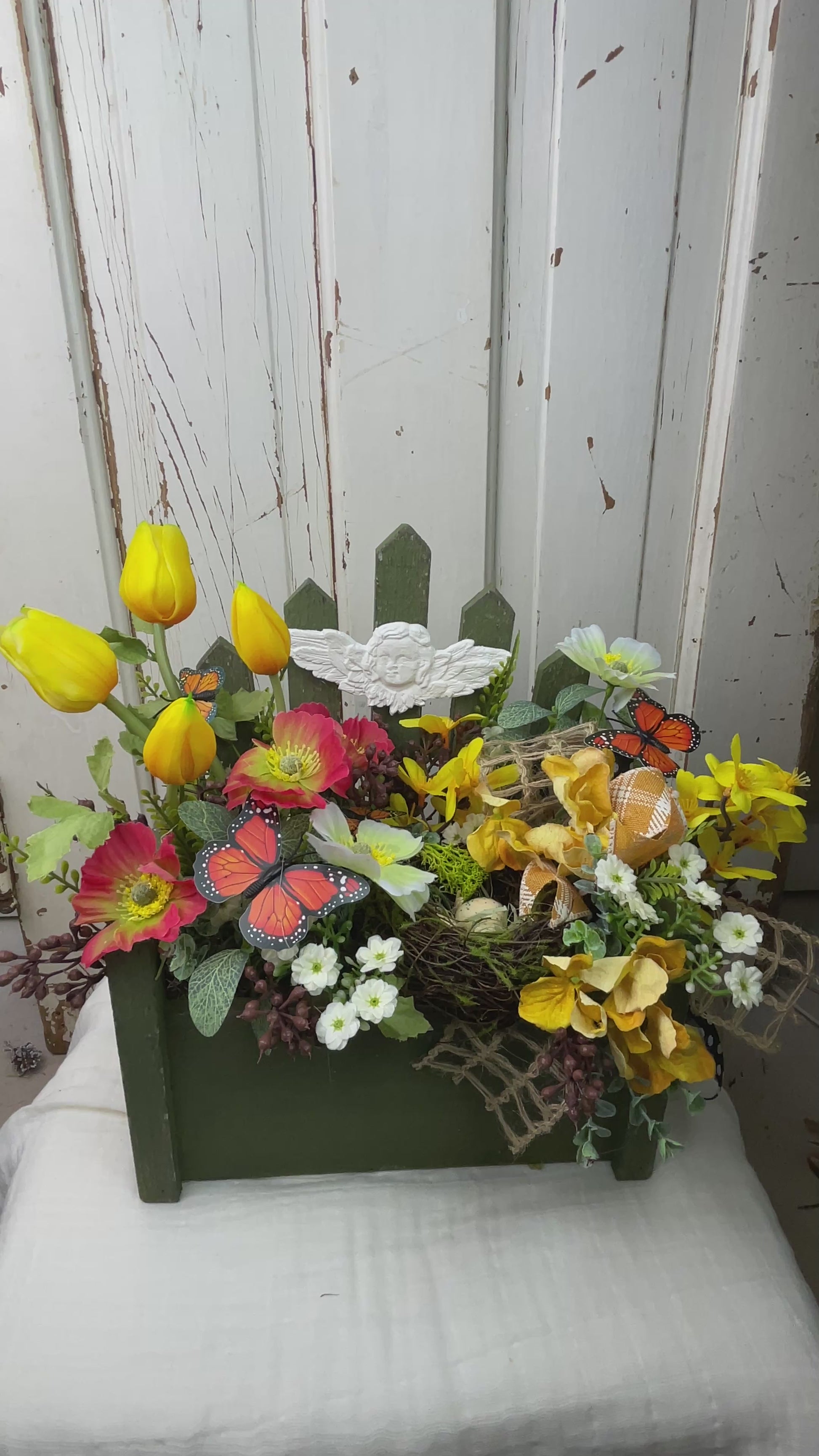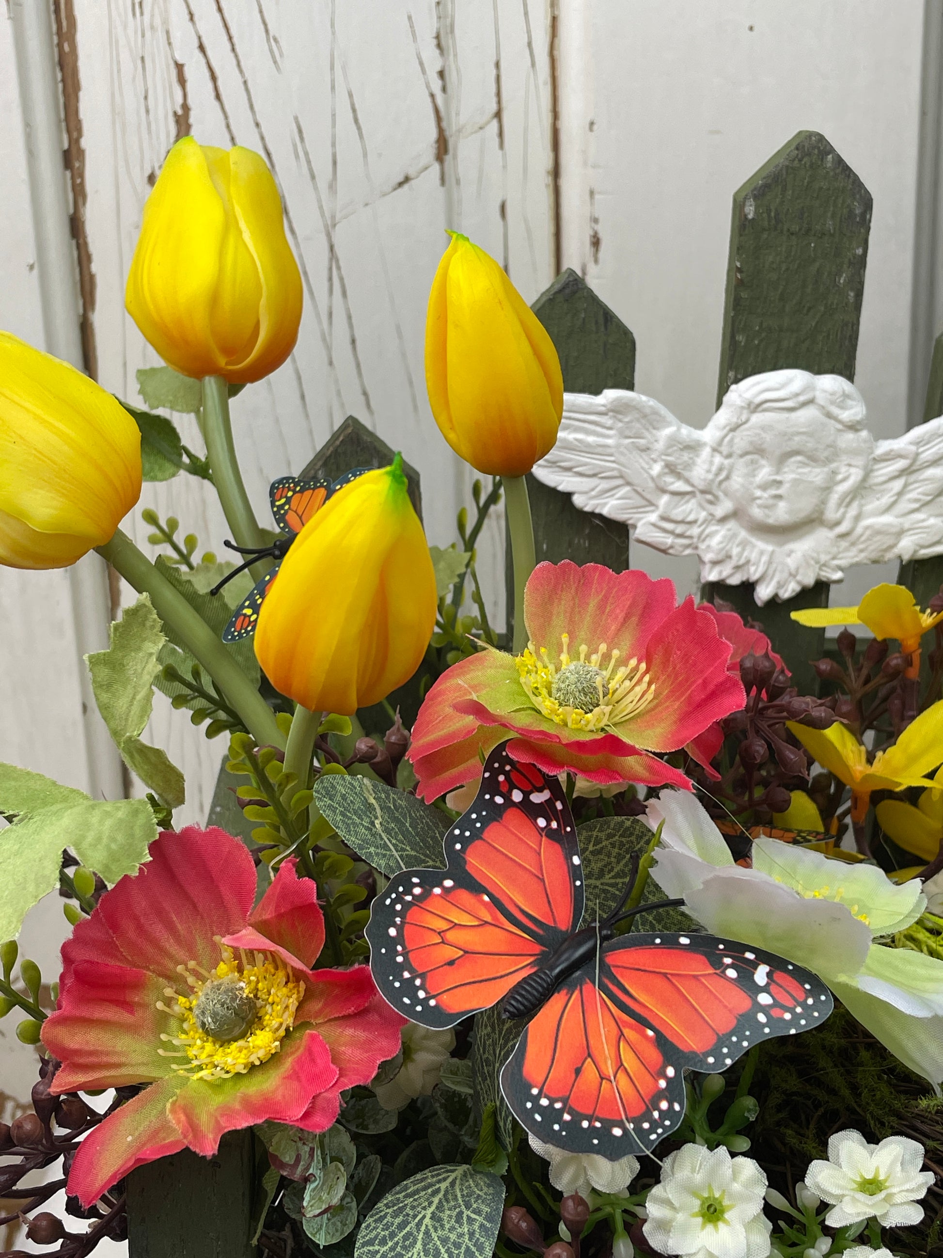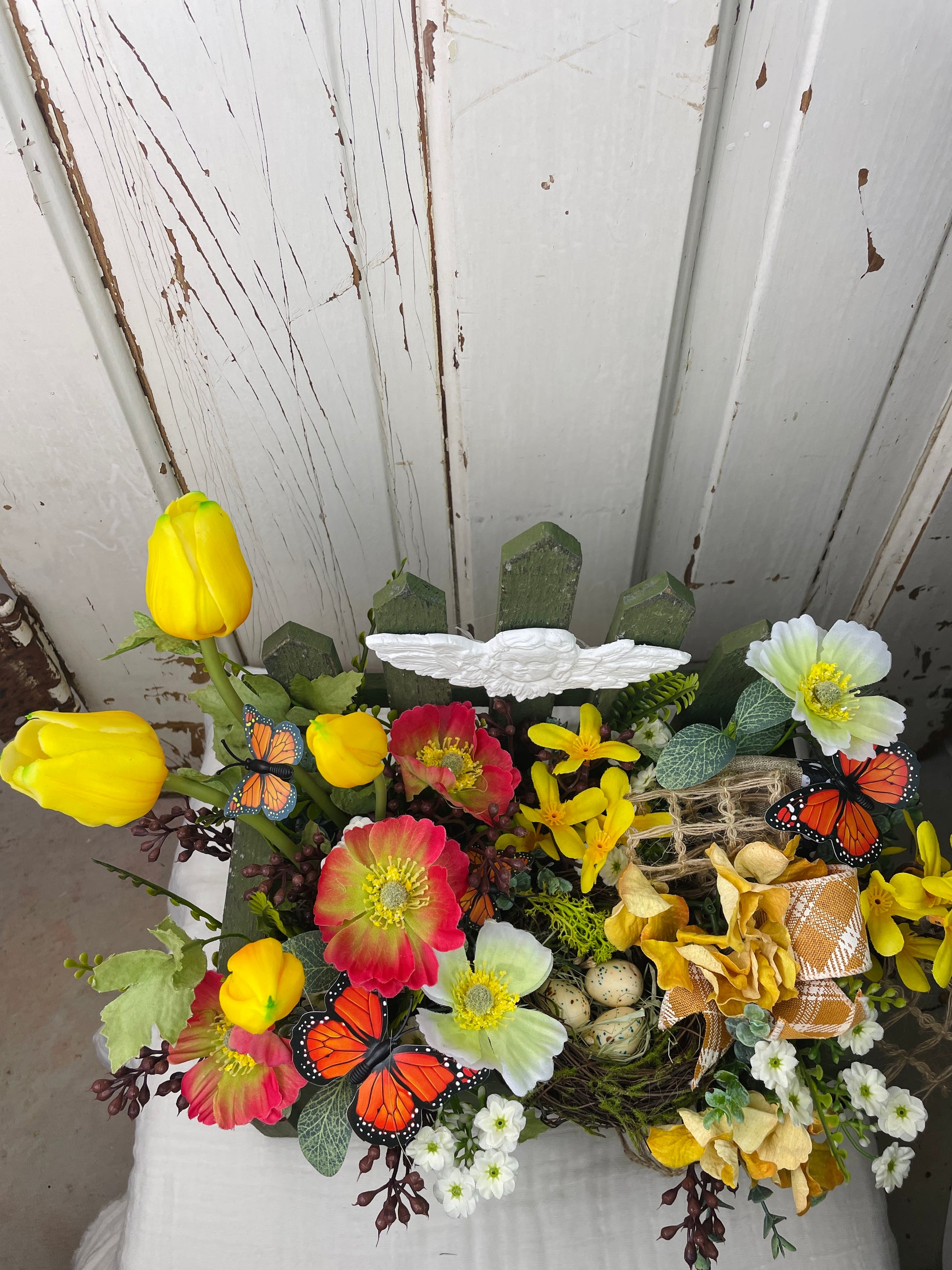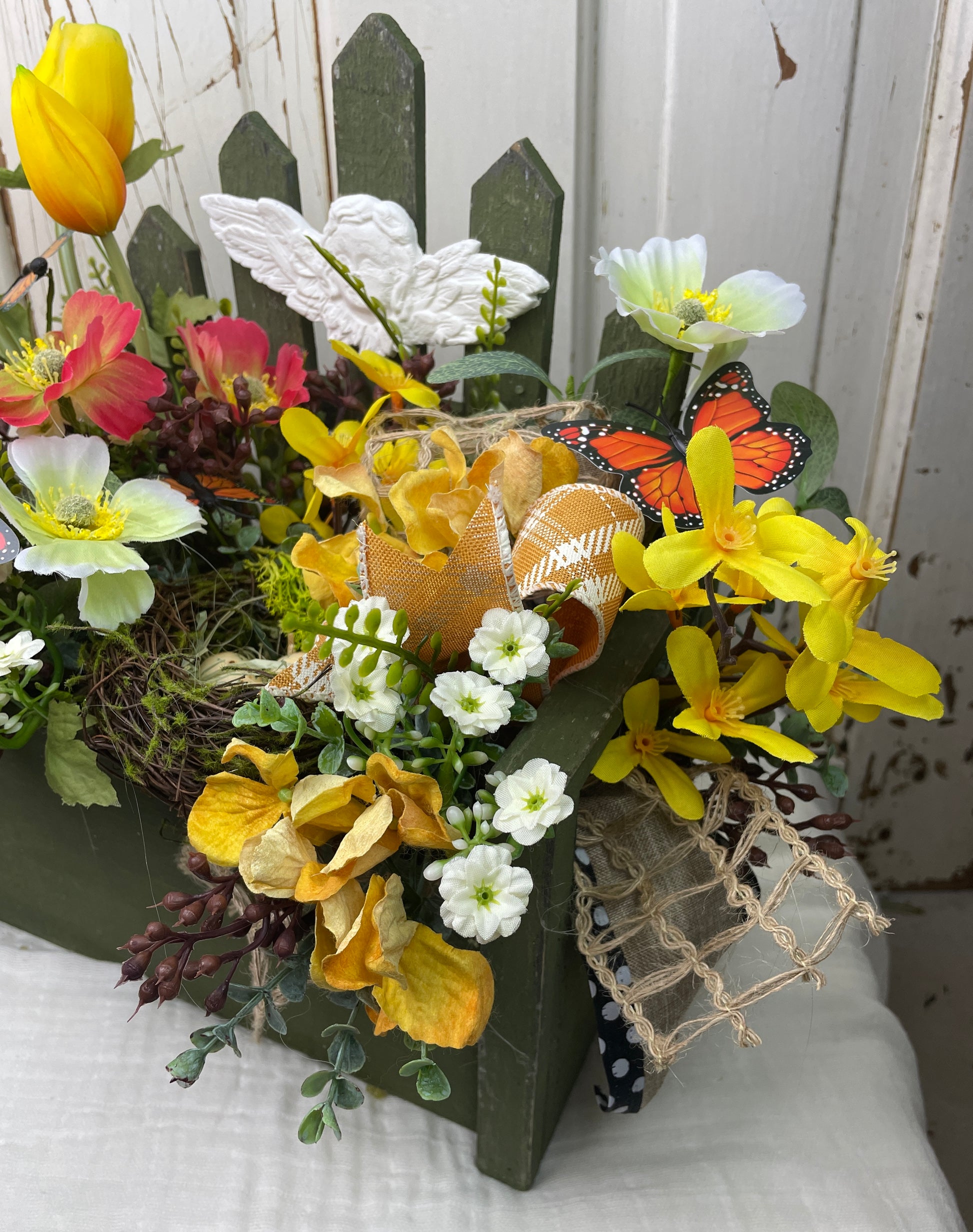 Bring the warmth of spring and summer into your home with this stunning silk floral arrangement! Featuring vibrant yellow and orange flowers, this handcrafted piece is nestled in a charming rustic-style picket fence container, making it a perfect addition to any farmhouse decor.