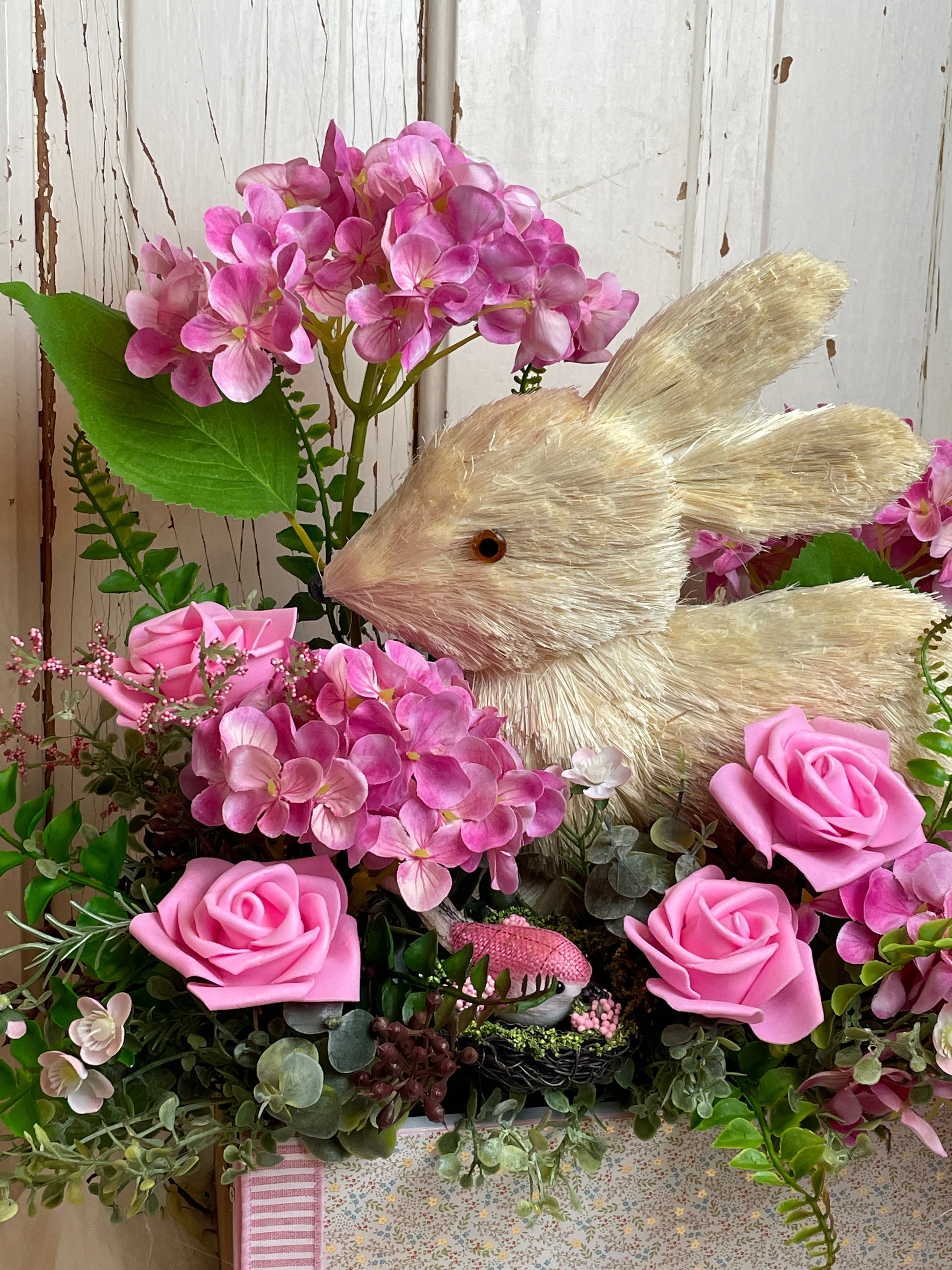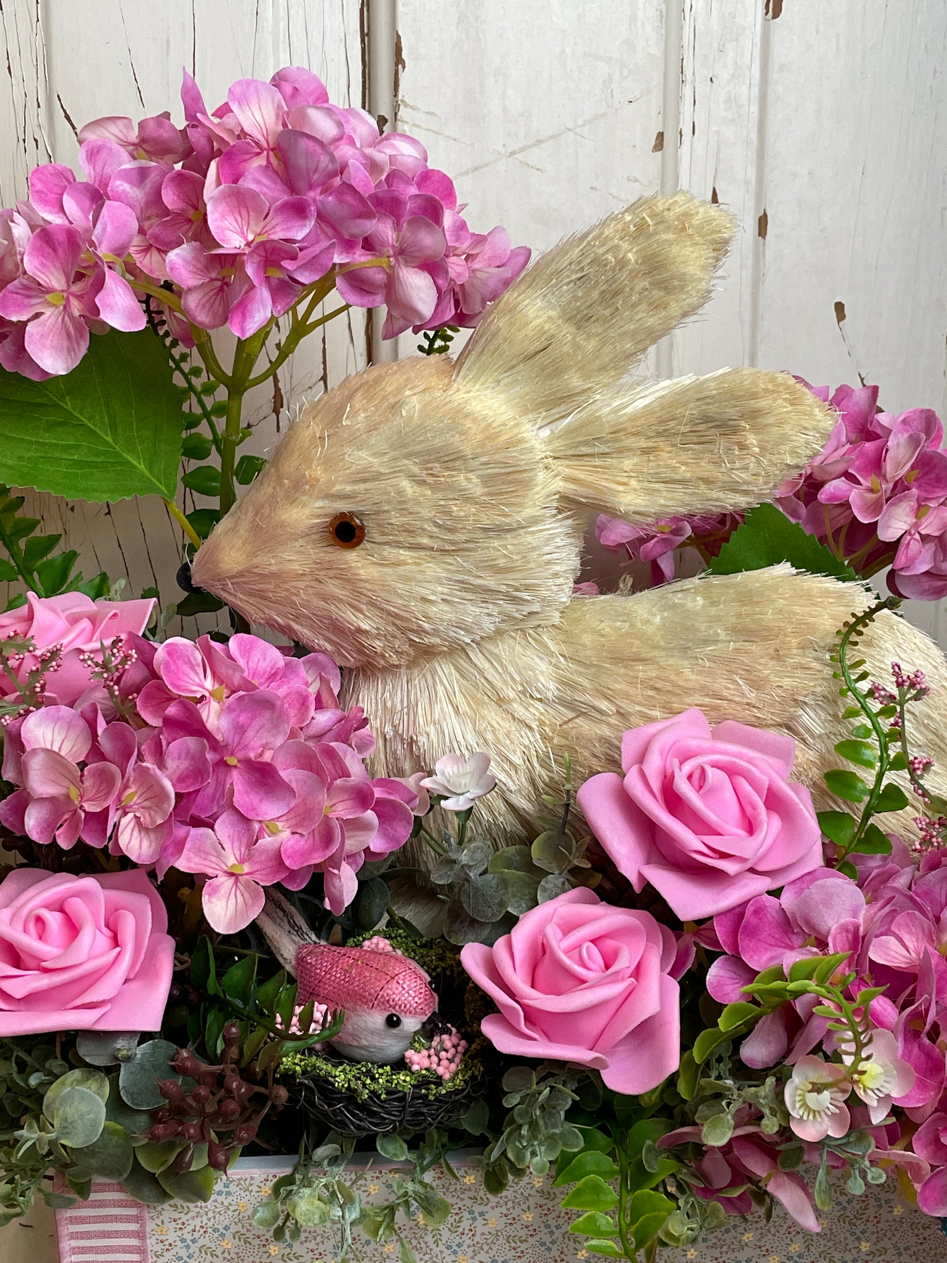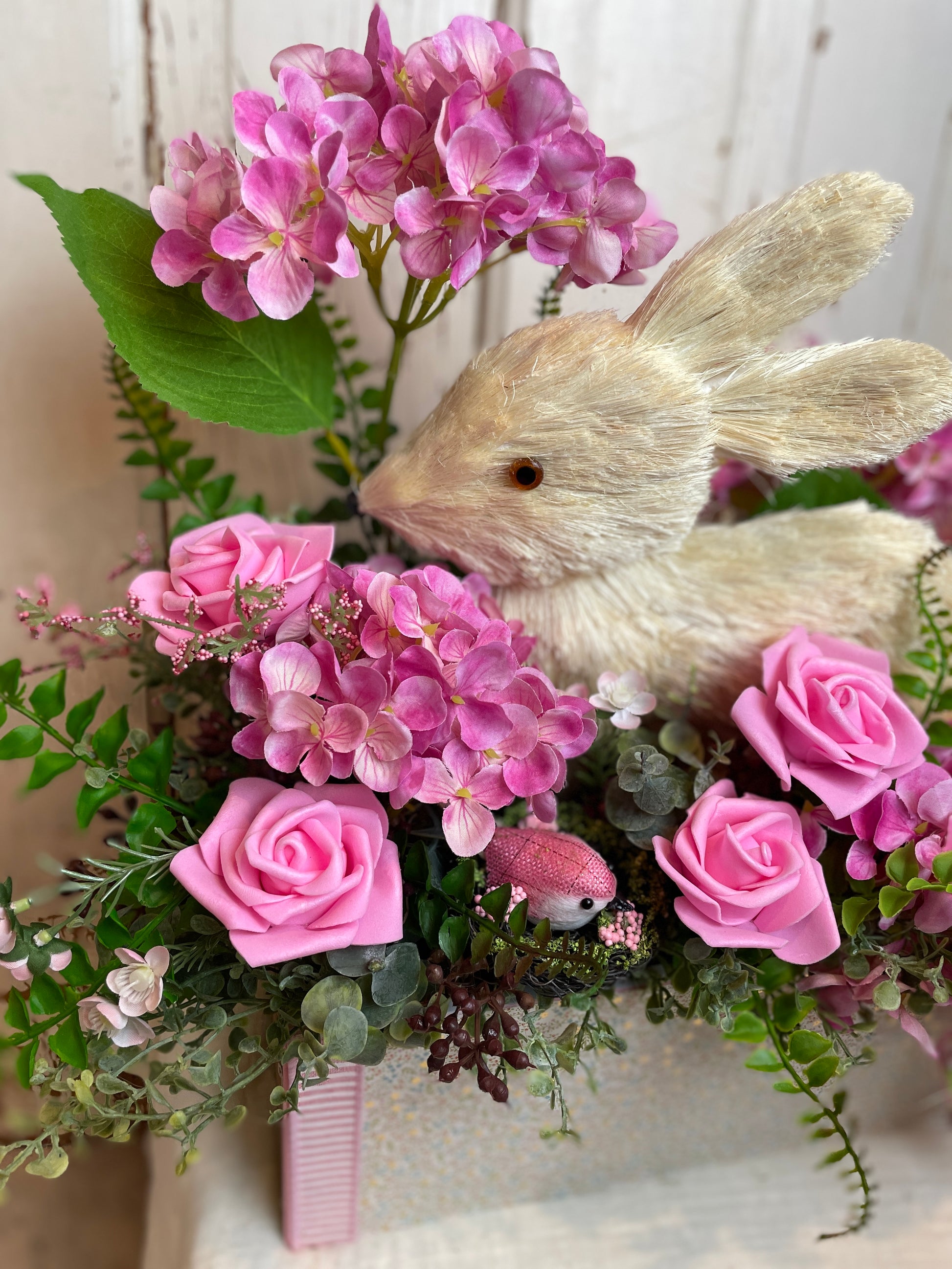 Bring a touch of rustic charm and cottage elegance to your home with this enchanting bunny floral centerpiece. Overflowing with lush pink roses, vibrant hydrangeas, and soft greenery, this handmade arrangement is the perfect statement piece for any shabby chic or cottage-inspired setting. Nestled among the florals is a sweet faux fur bunny made of sisal, adding a whimsical, yet sophisticated touch to your decor.