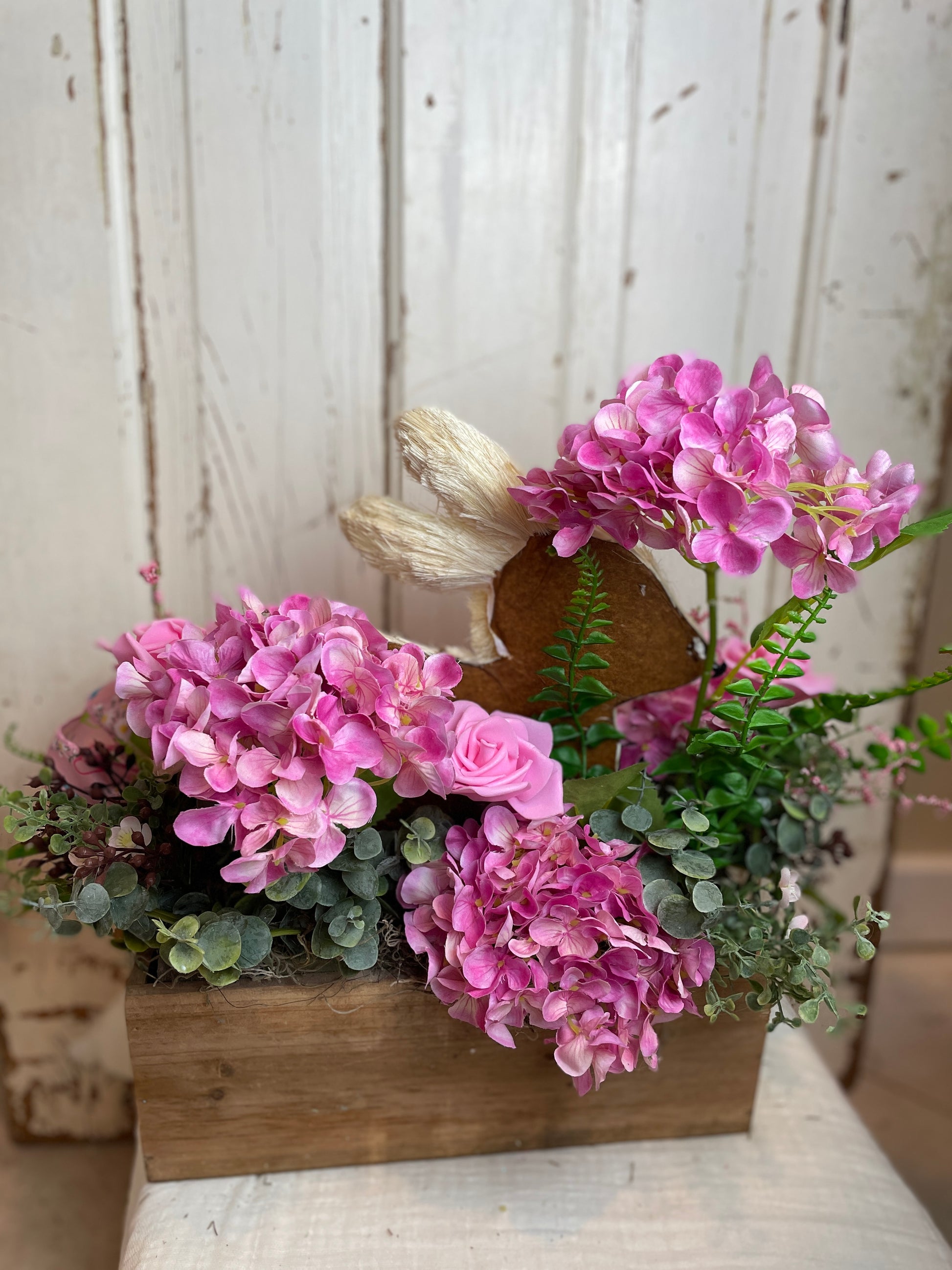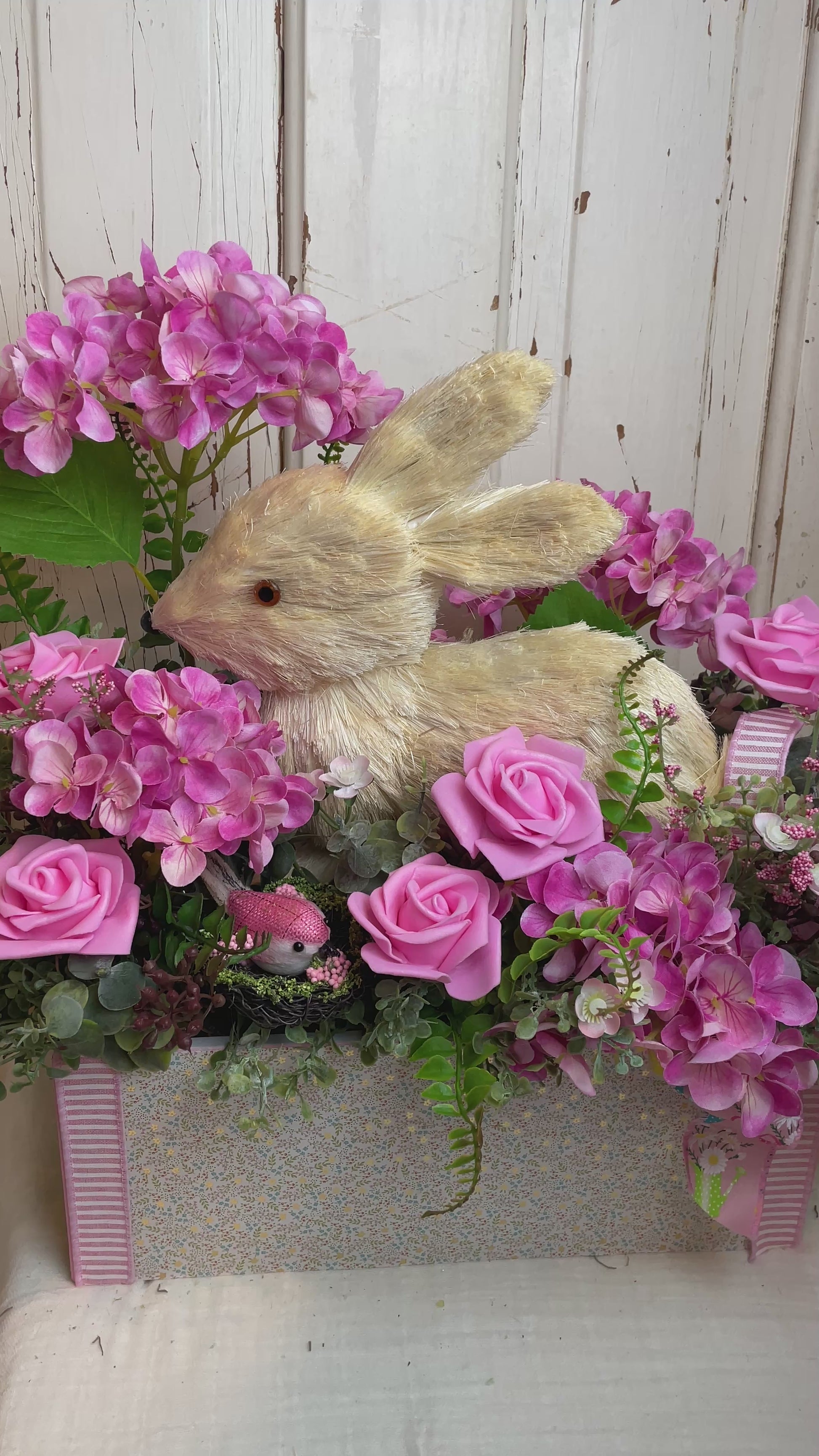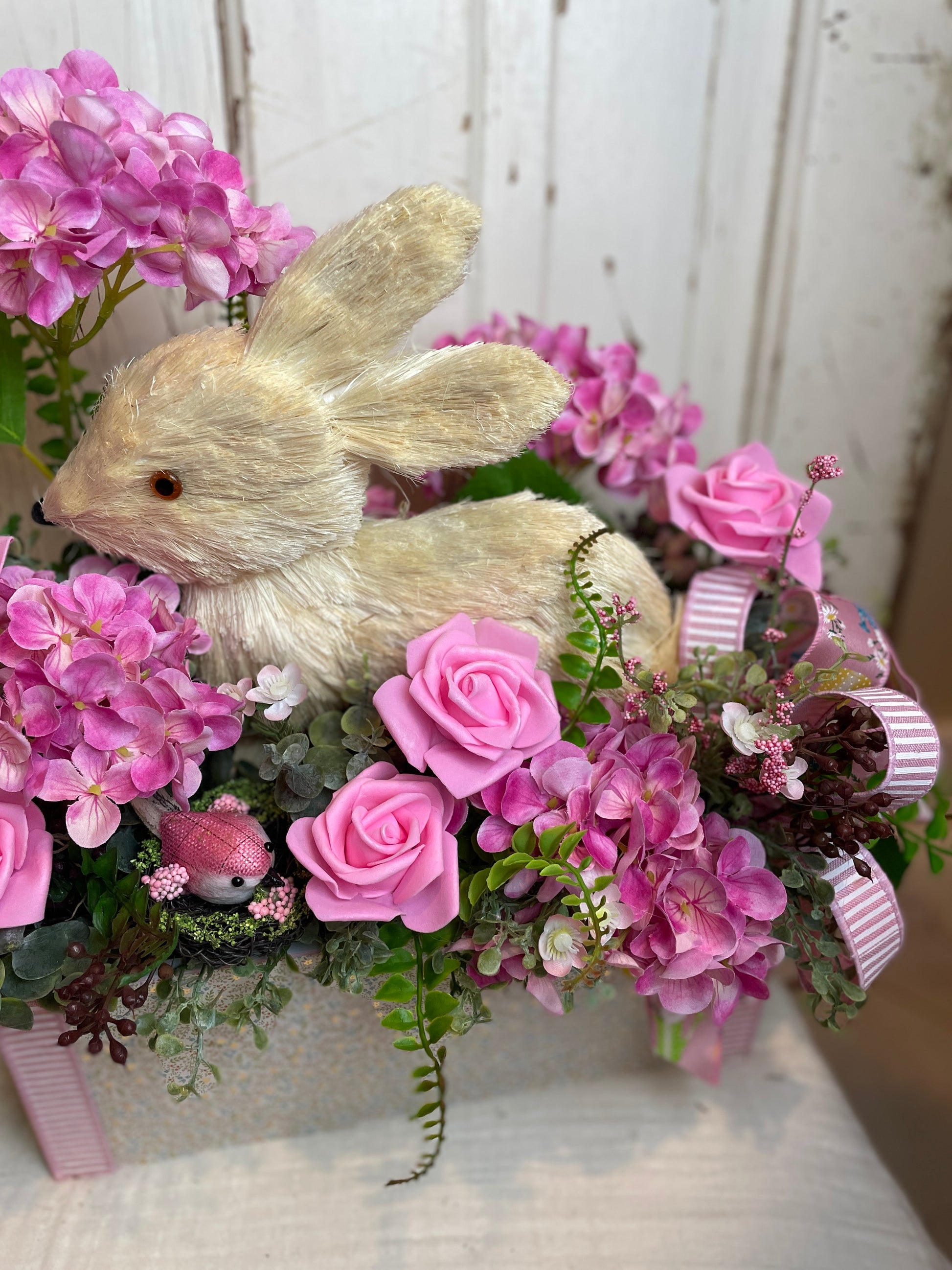 Bring a touch of rustic charm and cottage elegance to your home with this enchanting bunny floral centerpiece. Overflowing with lush pink roses, vibrant hydrangeas, and soft greenery, this handmade arrangement is the perfect statement piece for any shabby chic or cottage-inspired setting. Nestled among the florals is a sweet faux fur bunny made of sisal, adding a whimsical, yet sophisticated touch to your decor.
