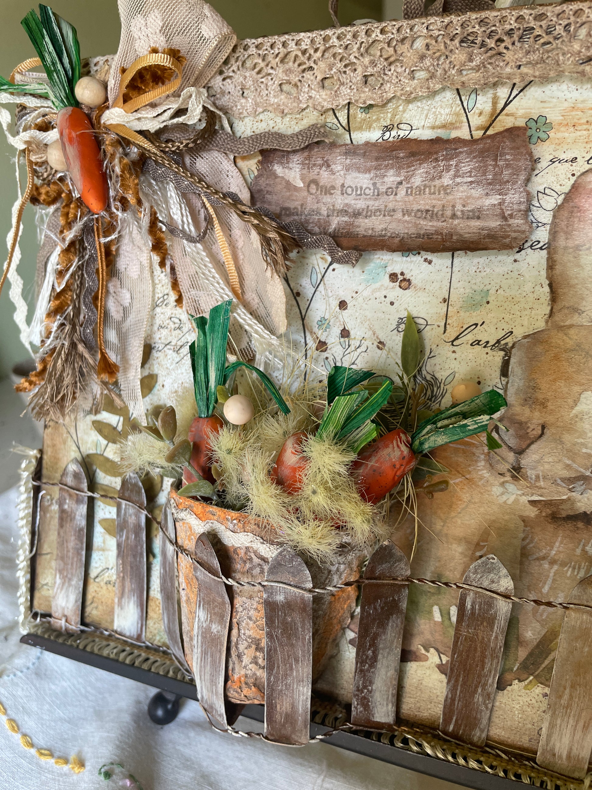 The design includes a handmade wooden picket fence, a textured garden pot filled with fuzzy carrots and greenery, and a fabric and lace bow adorned with a tiny rustic carrot. A distressed wooden sign reads, "One touch of nature makes the whole world kin," adding a heartwarming touch.