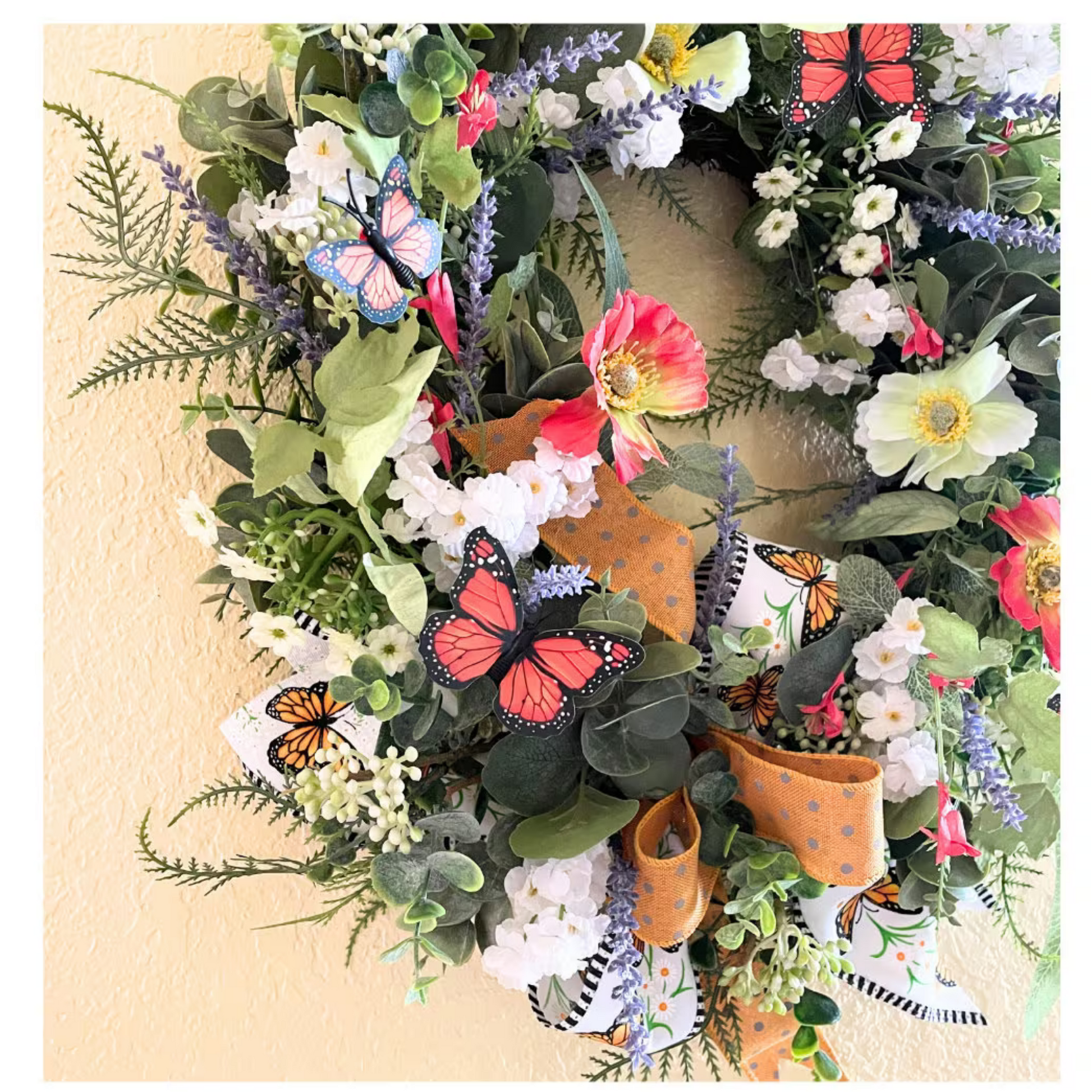 Introducing our enchanting Orange Butterfly everyday wreath, a burst of vibrancy and warmth for your indoor spaces. This unique oval wreath is a delightful fusion of bright butterflies and cheerful florals, designed to bring a touch of whimsy to your walls.