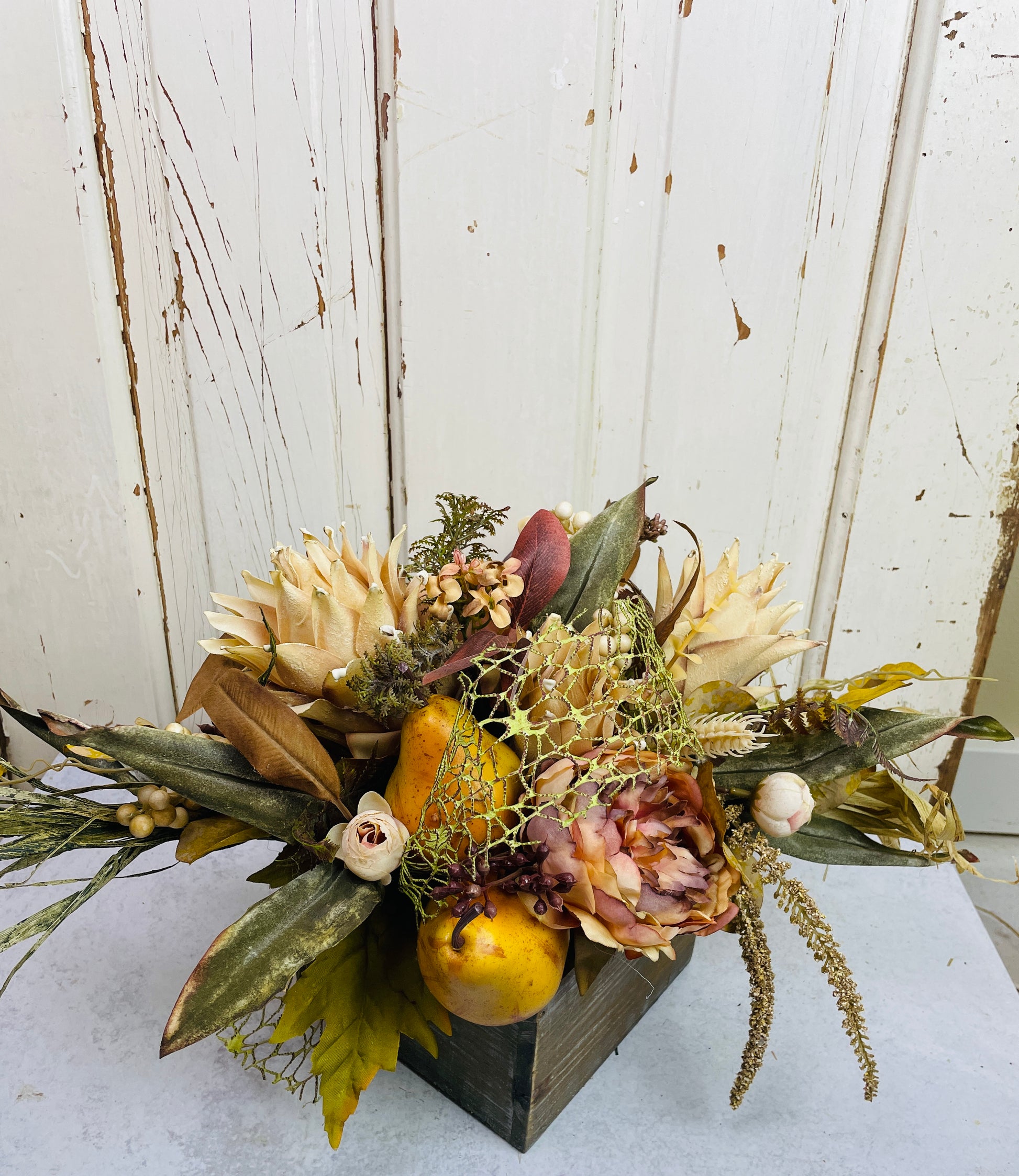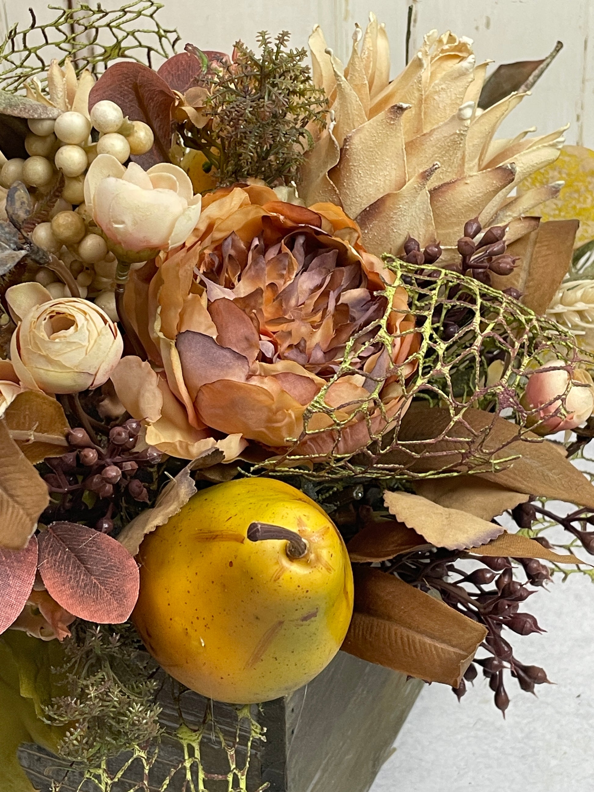 A stunning neutral toned silk floral design featuring protea and natural looking stems and vines , with golden eucalyptus and pears