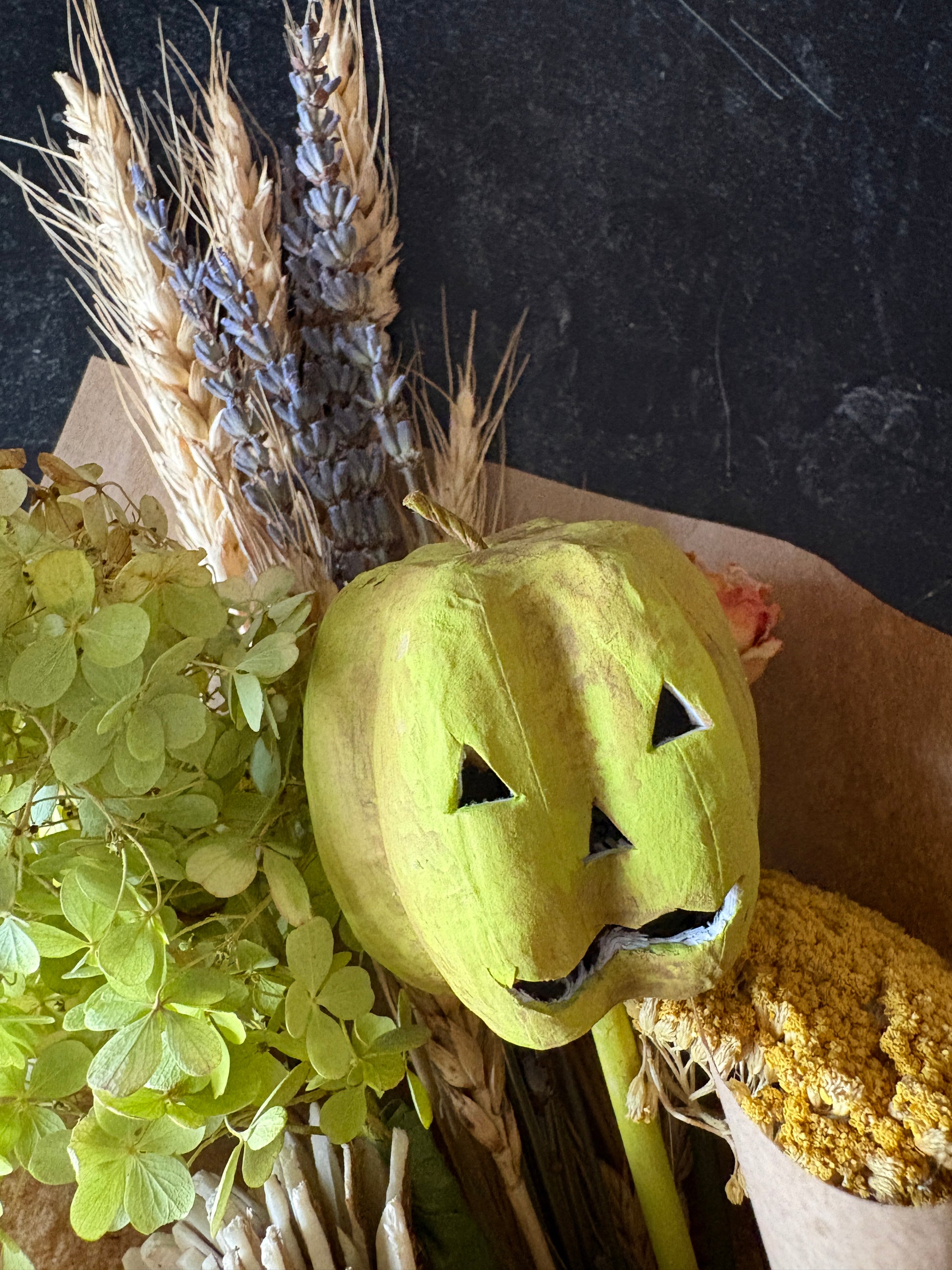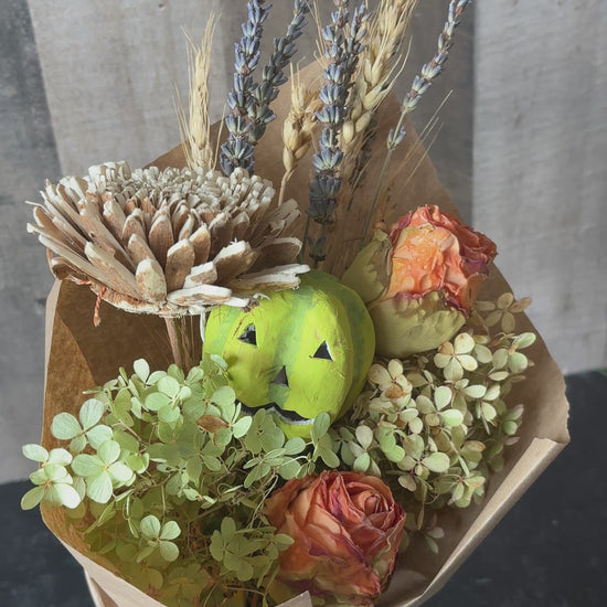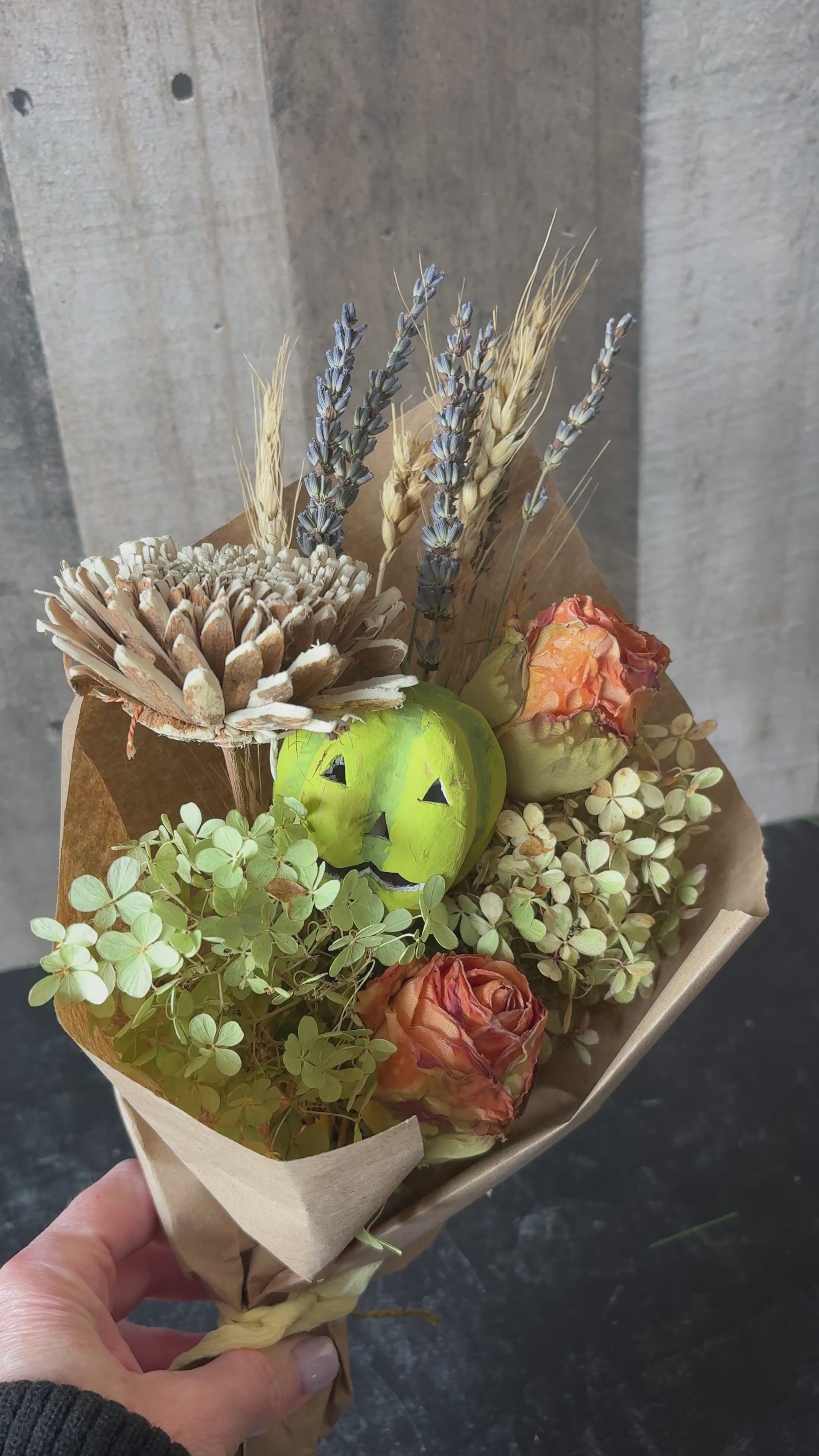 This handcrafted dried fall floral bouquet brings warm seasonal charm to your home with a beautiful mix of dried lavender, wheat, hydrangea, and preserved florals, finished with a whimsical pumpkin accent for a subtle Halloween-to-Thanksgiving transition.