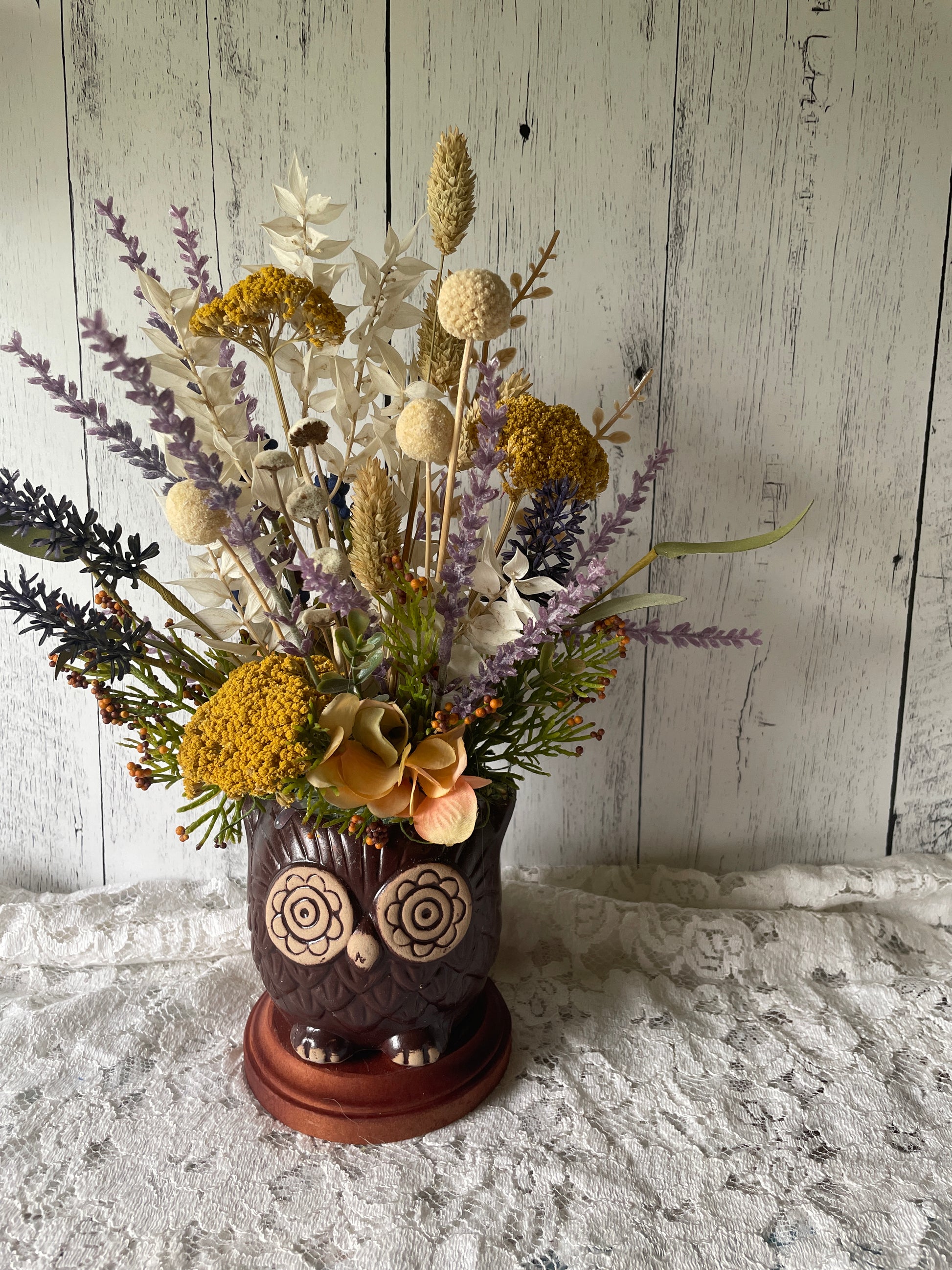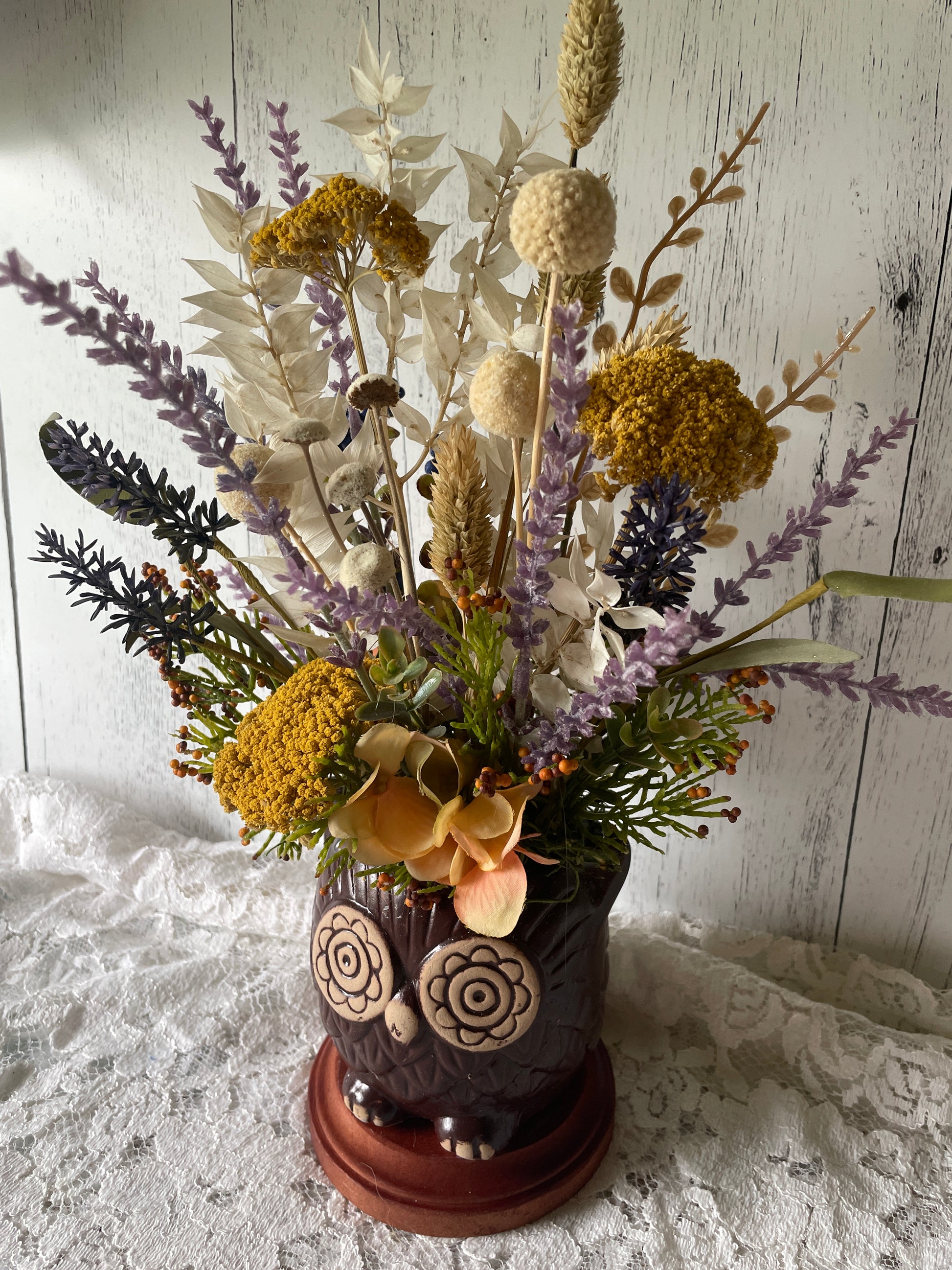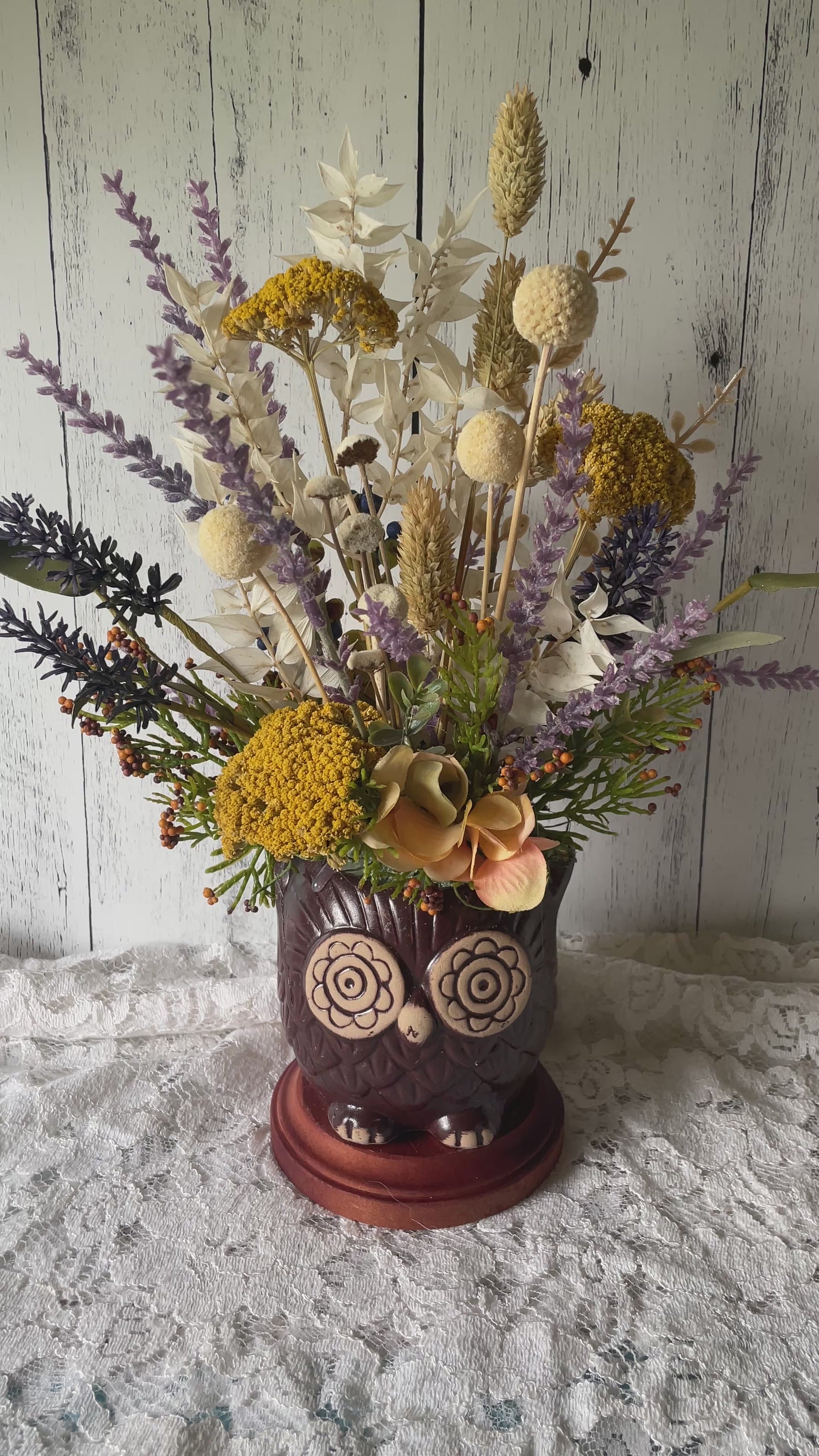 Add a touch of woodland whimsy to your home with this one-of-a-kind dried floral arrangement, artfully designed in a charming ceramic owl vase. Featuring a soft blend of lavender sprigs, golden yarrow, billy balls, creamy preserved leaves, and wheat stems, this nature-inspired piece brings cozy cottage charm and earthy texture to any room.