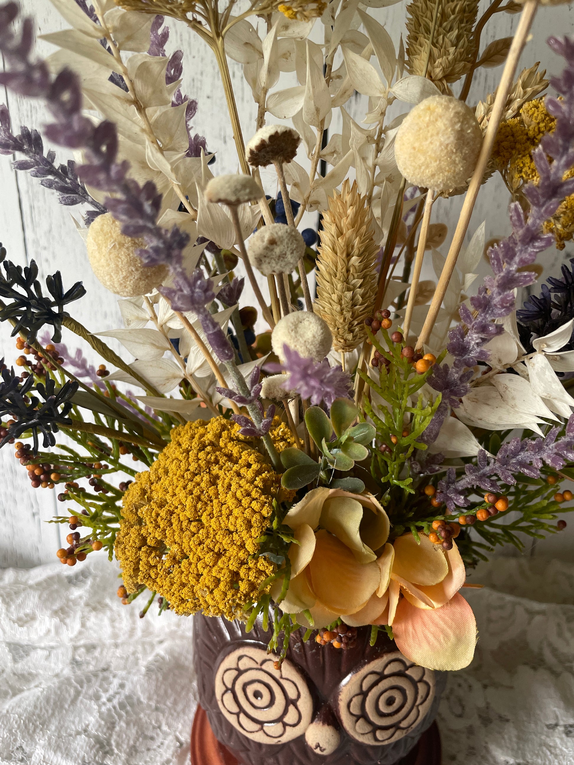 Dried Floral Arrangement in Ceramic Owl Vase –Boho style table decor, Nature-Inspired Home Decor – Fall Table Centerpiece, Owl lovers gift