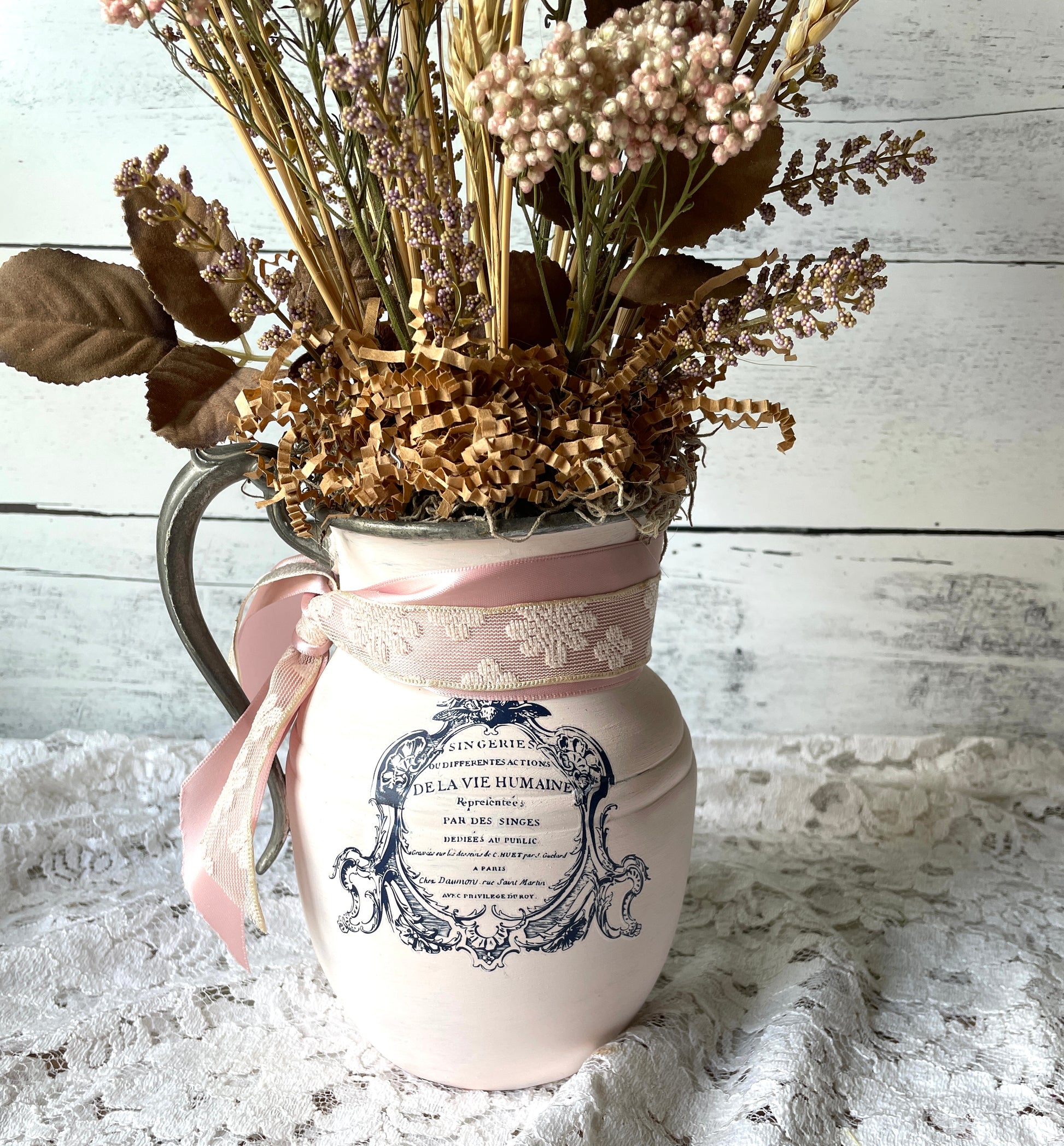 The soft blush tones and delicate details make it a standout centerpiece for a dining table, mantel, or sideboard. The pewter-look pitcher features an ornate vintage-style French label and a soft pink satin ribbon for added charm.