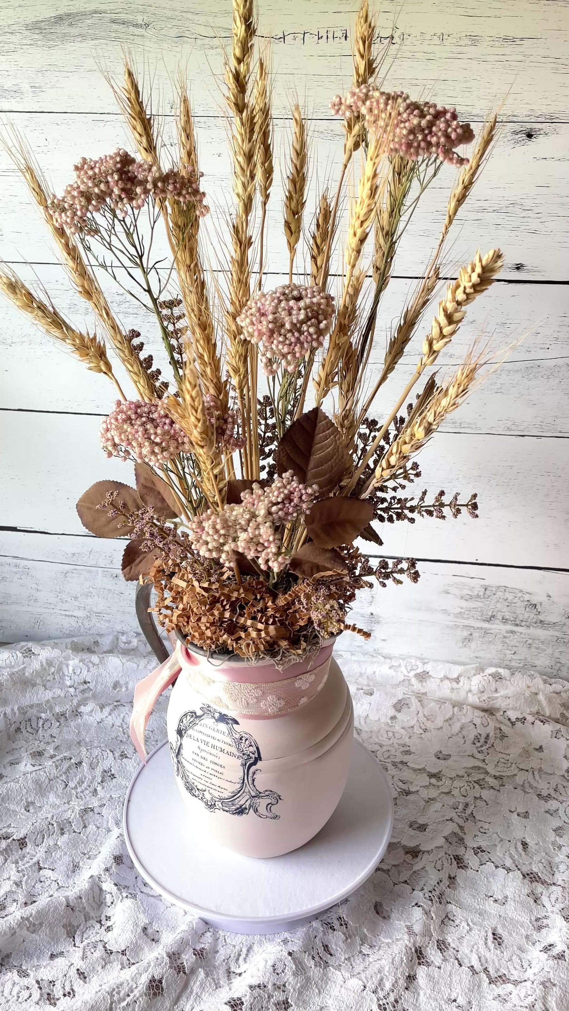 Bring timeless French charm to your space with this one-of-a-kind dried floral arrangement, artfully styled in a vintage-inspired pewter pitcher. Featuring soft pink blooms, dried wheat stems, and natural textures, this piece blends elegance and rustic beauty—perfect for cottage, farmhouse, or romantic French country décor.