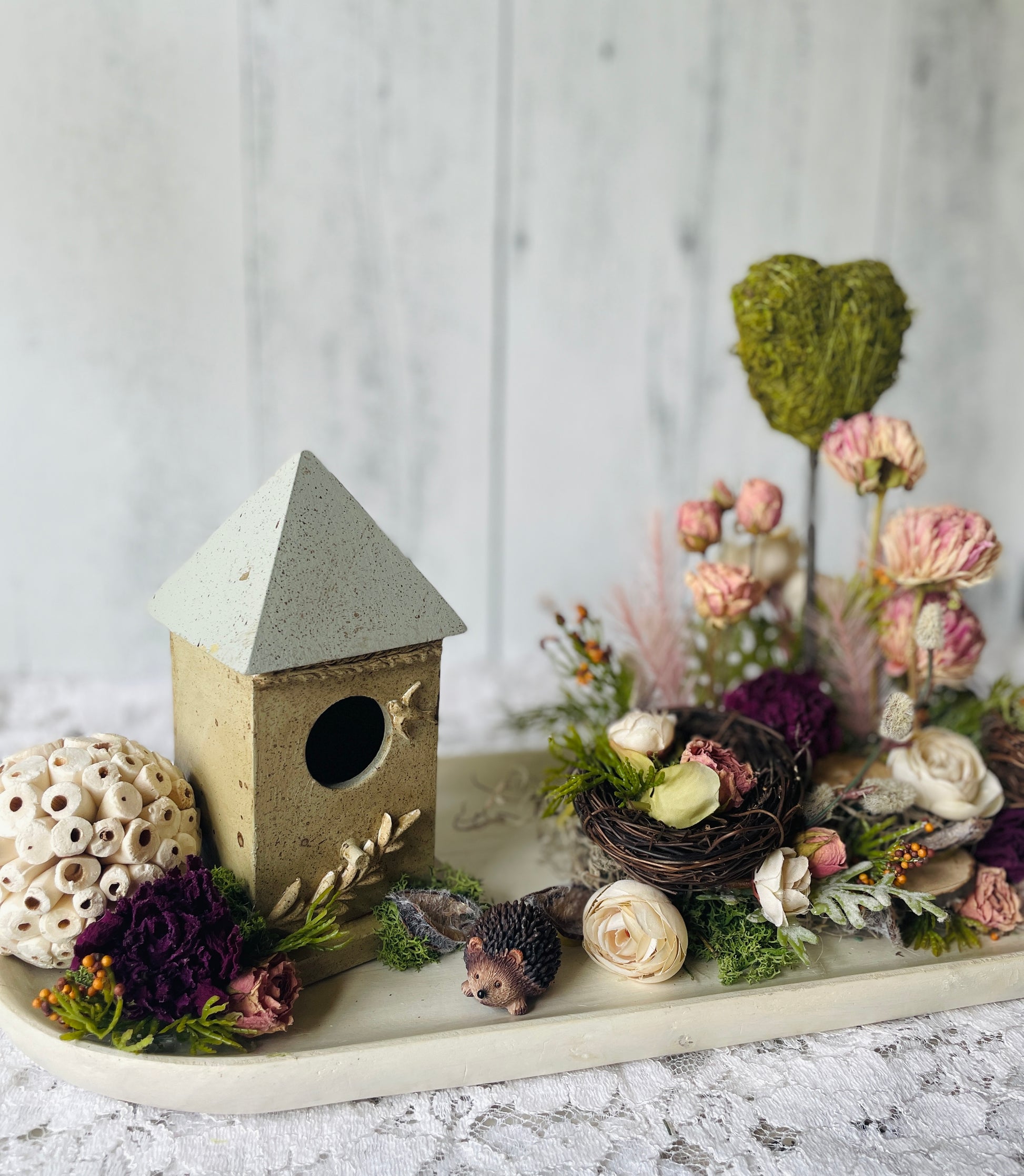 Step into a storybook garden with this whimsical dried floral arrangement, designed as a nature-inspired vignette full of charm and detail. Featuring a rustic birdhouse, grapevine nests, preserved blooms, moss, and a sweet little hedgehog, this one-of-a-kind piece brings woodland wonder to any shelf, table, or seasonal display.