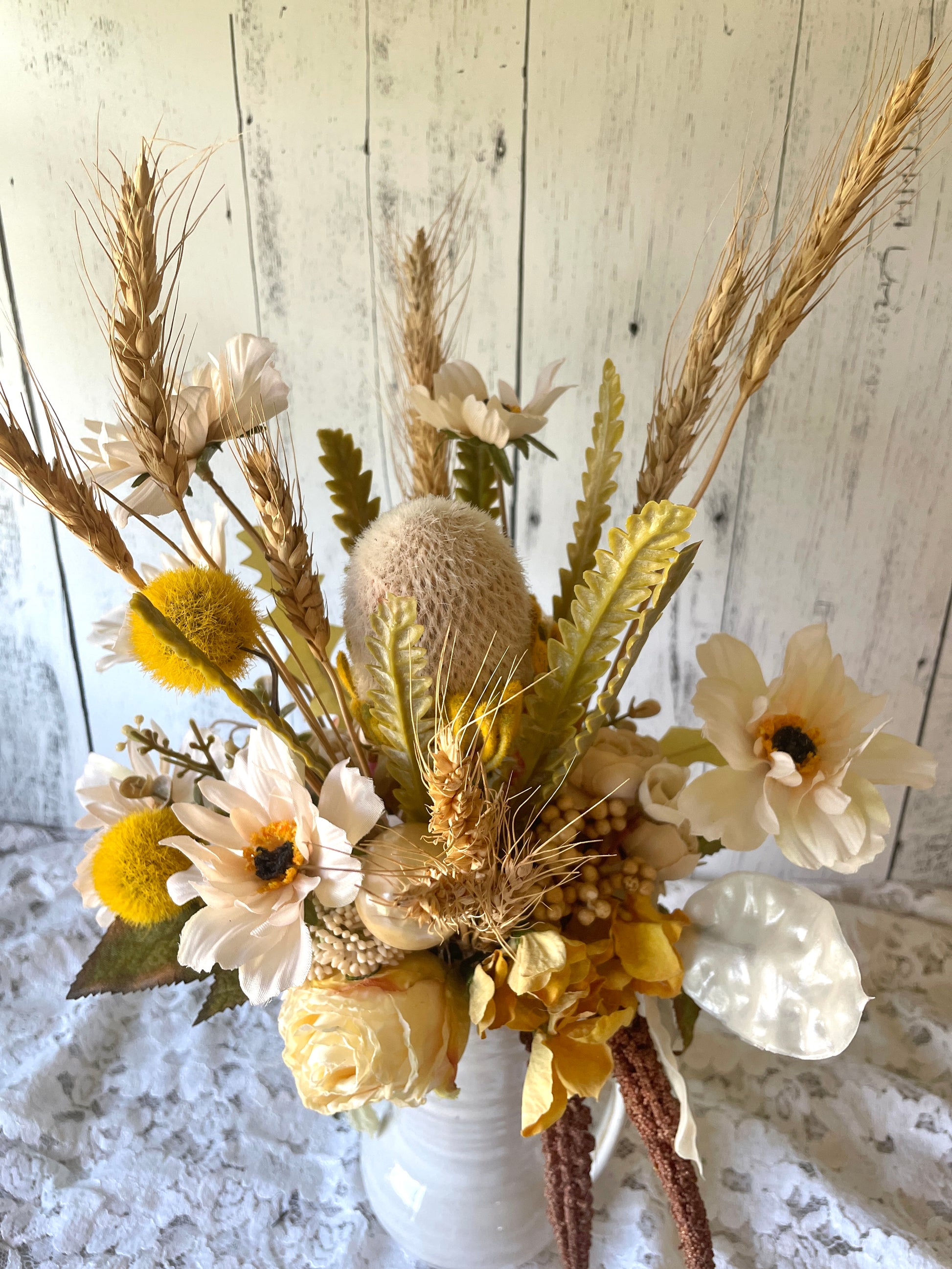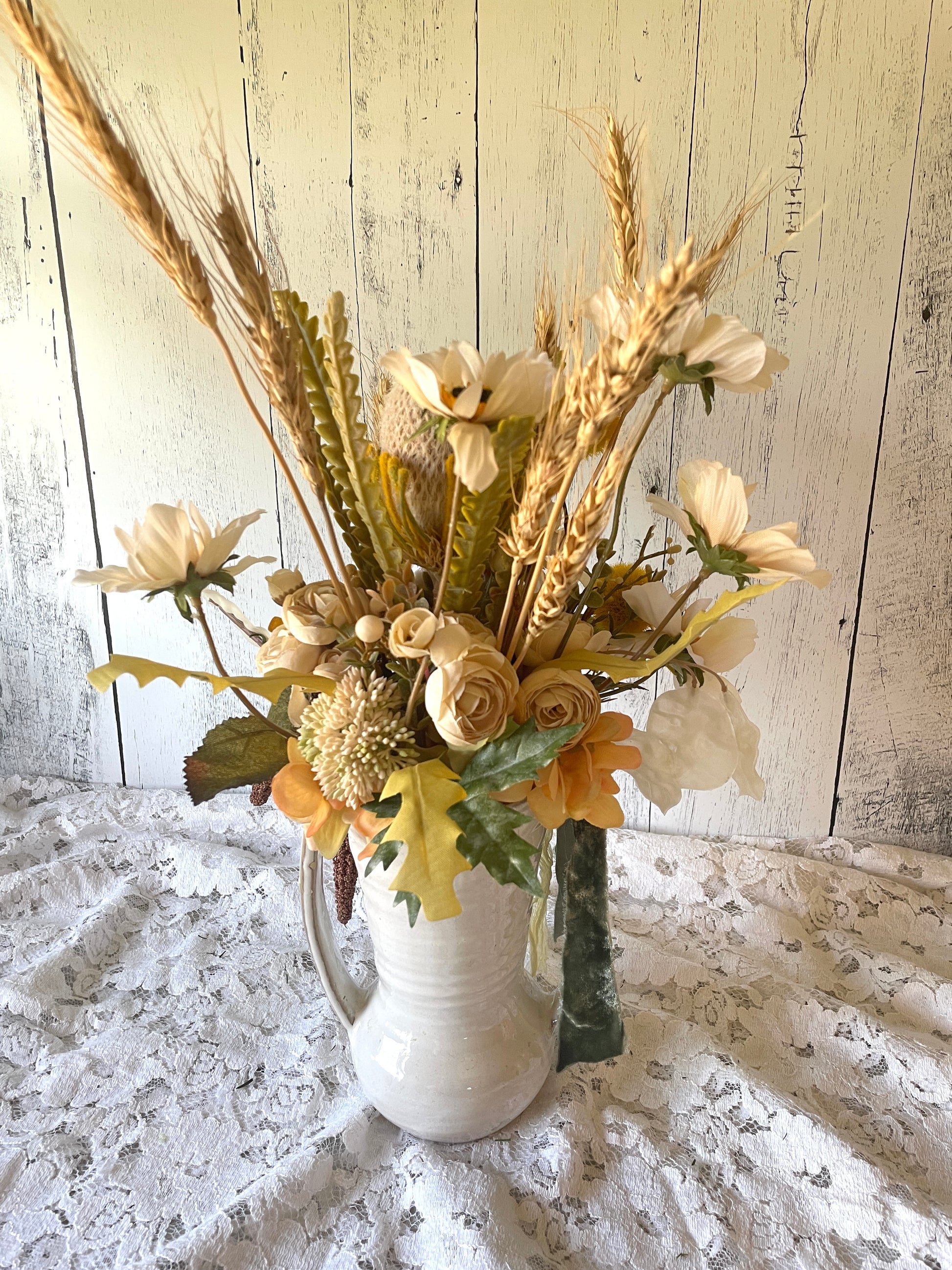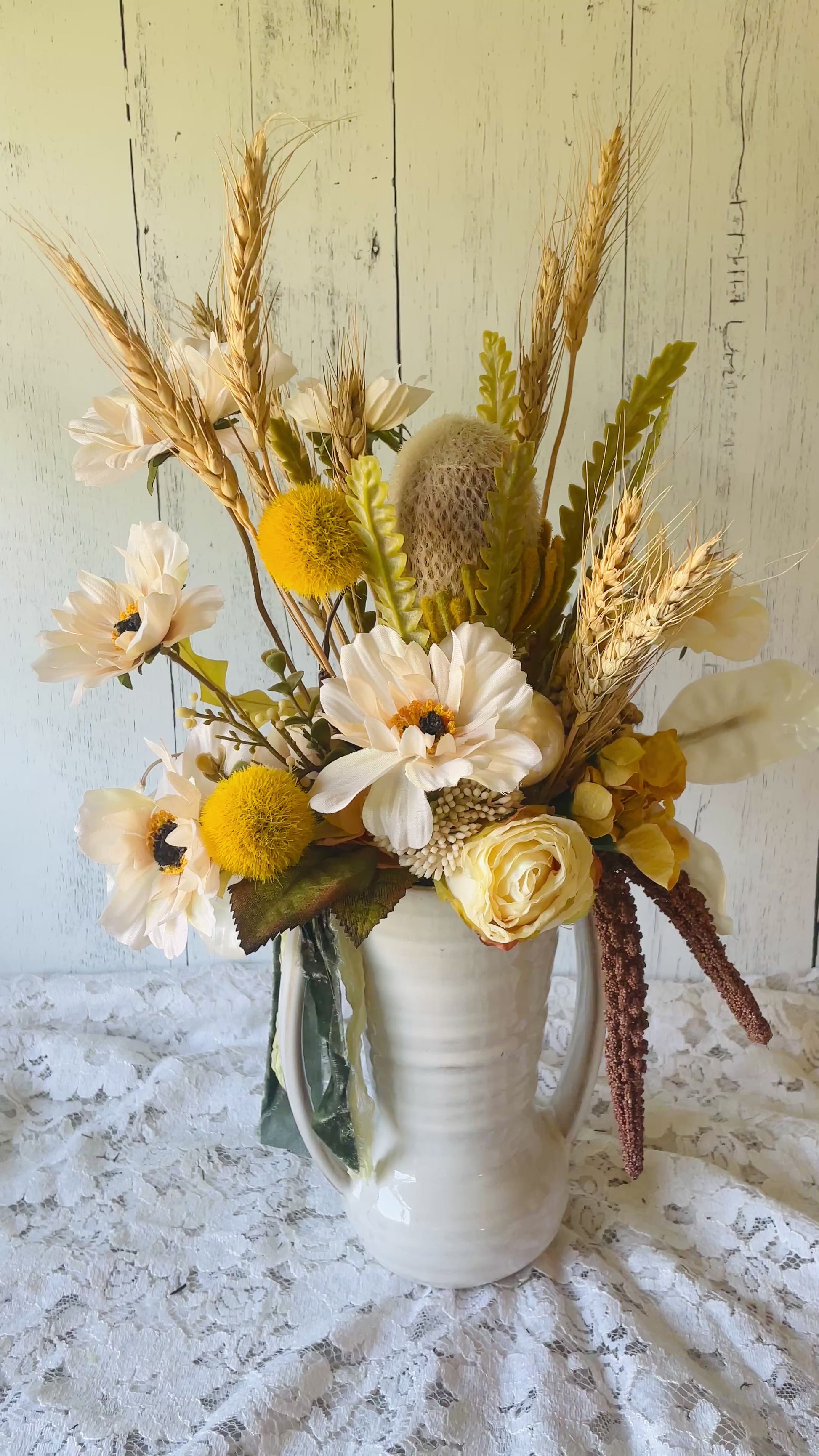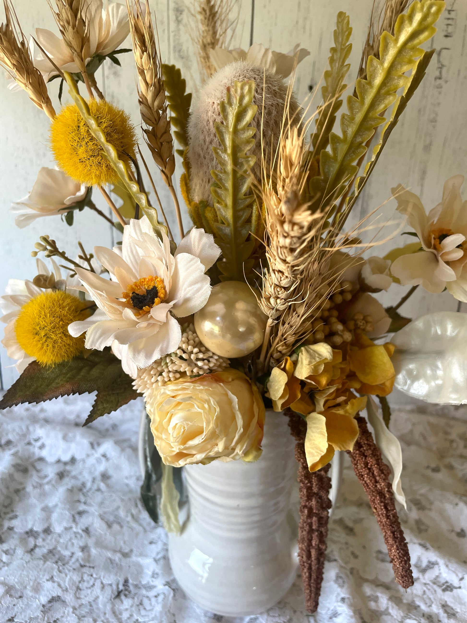 Bring the beauty of the harvest indoors with this naturally elegant dried floral arrangement, artfully styled in a creamy ceramic pitcher. Featuring soft ivory blooms, golden billy buttons, preserved wheat stalks, and textured botanicals, this design radiates warmth, movement, and countryside charm.