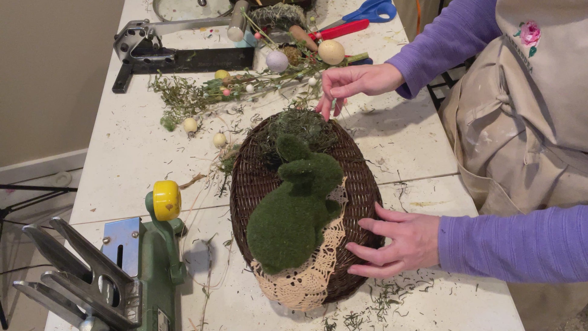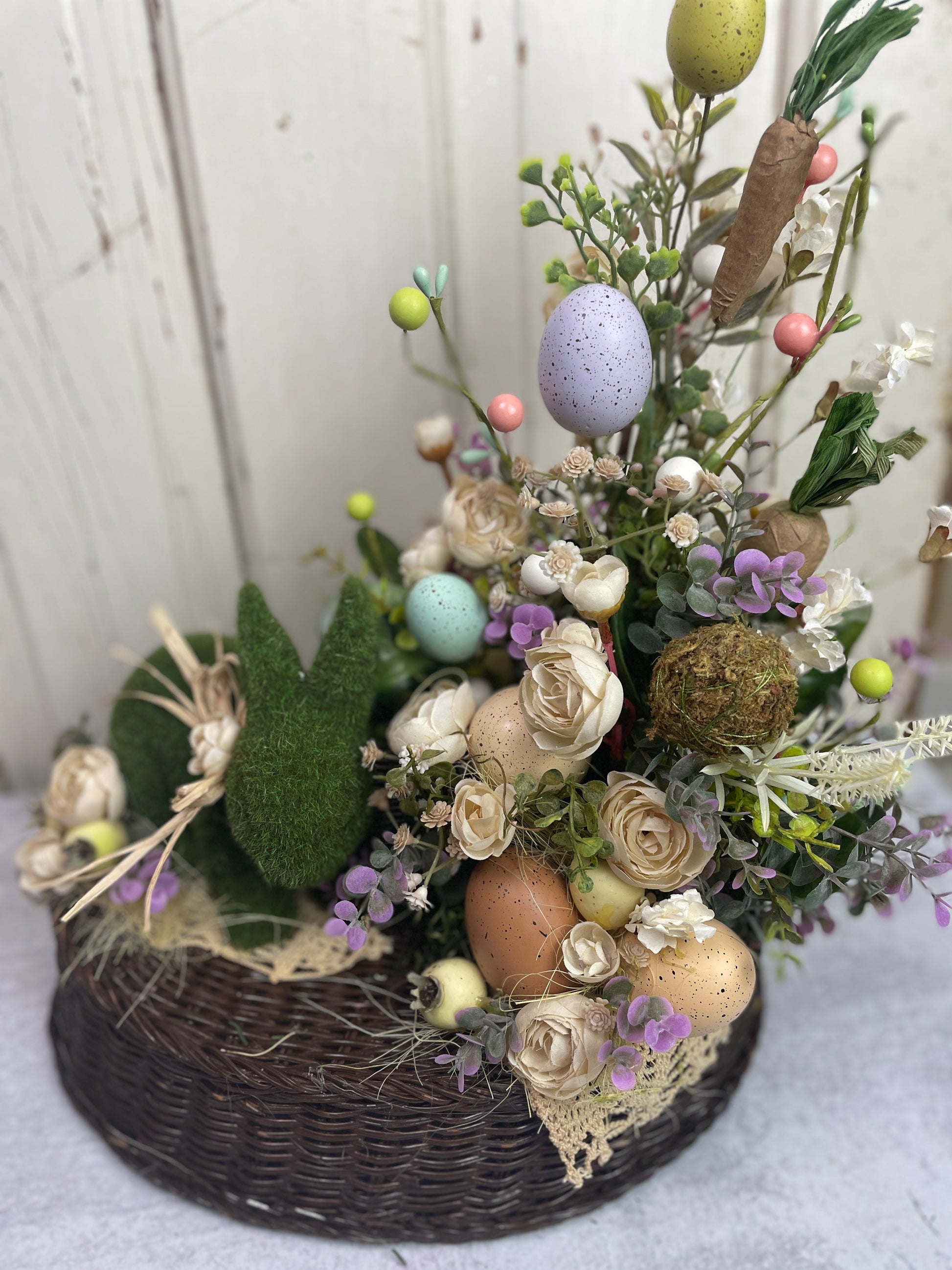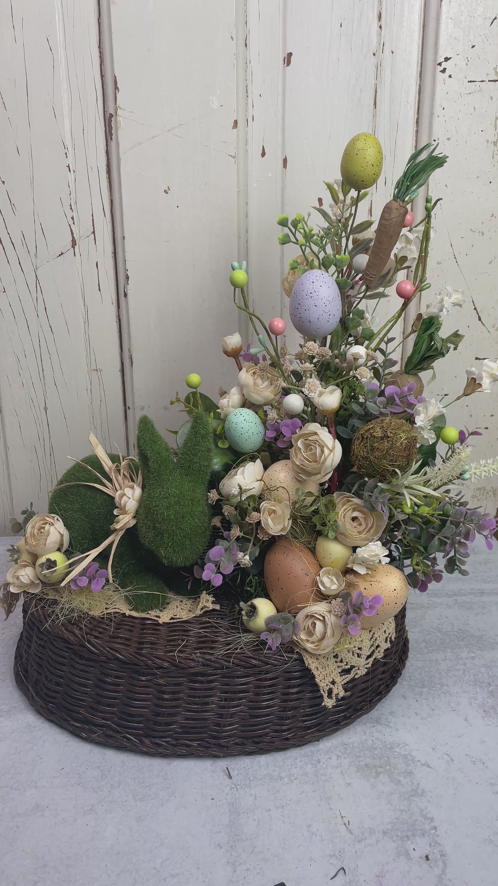 Celebrate the beauty of spring with this enchanting Easter Bunny Centerpiece, a perfect blend of farmhouse charm and vintage elegance! This handcrafted arrangement features a moss-covered bunny nestled among delicate silk florals, pastel speckled eggs, and whimsical greenery, all set in a woven basket with vintage lace accents.