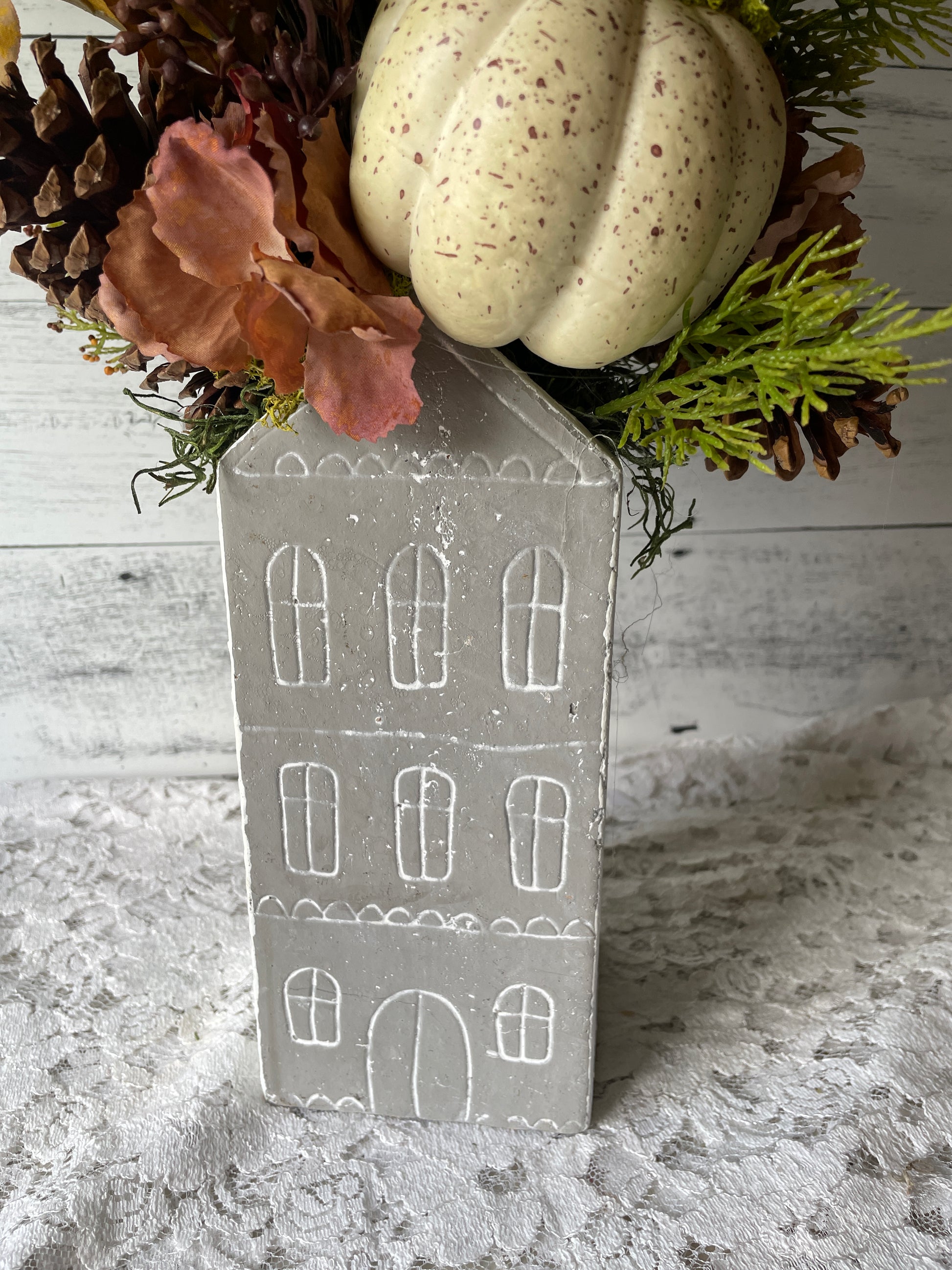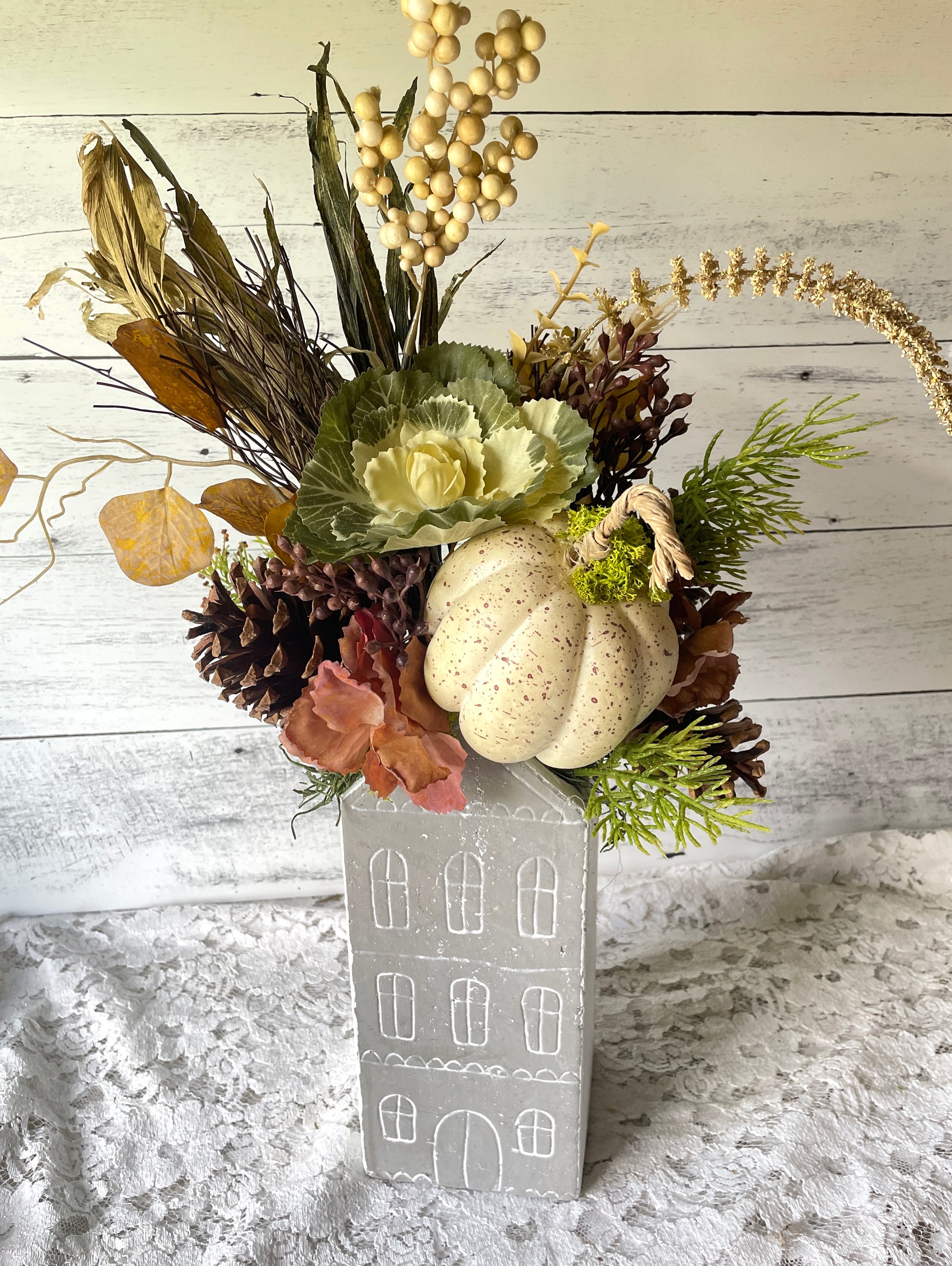 • Faux pumpkin, cabbage, berries, pinecones, and fall leaves