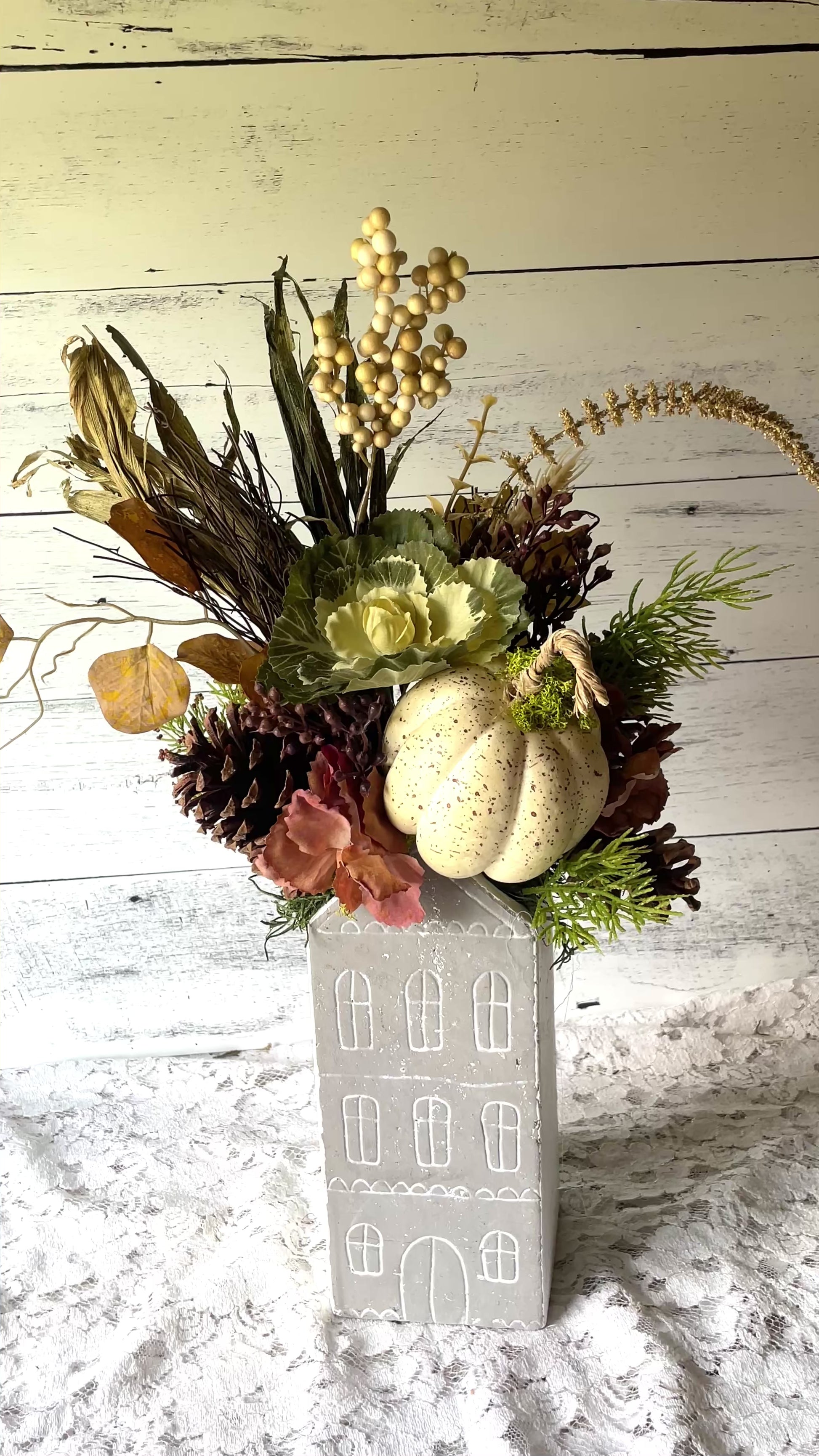 The neutral pottery vase with hand-drawn house details adds a storybook charm and makes this arrangement a standout for your autumn decorating.