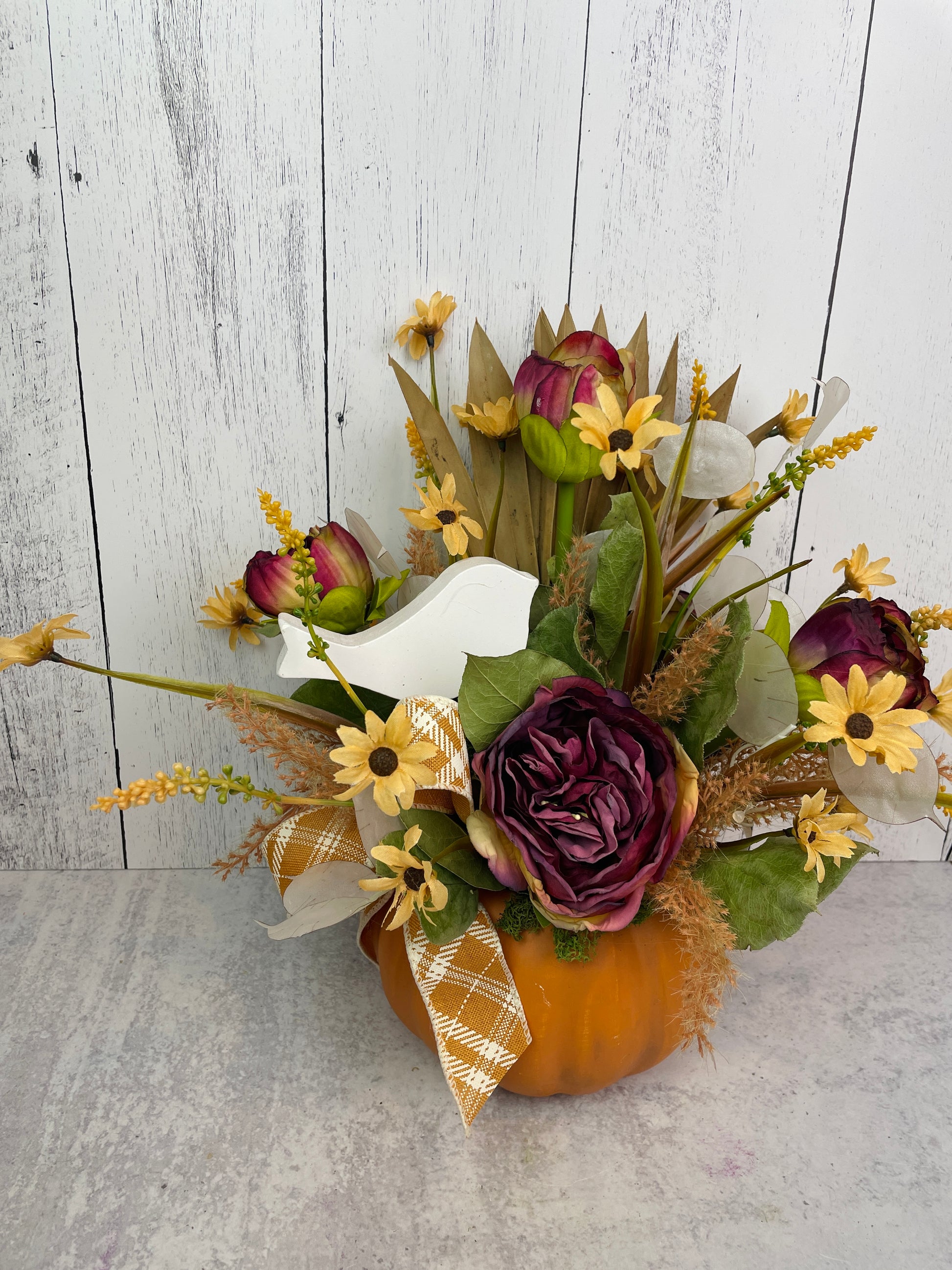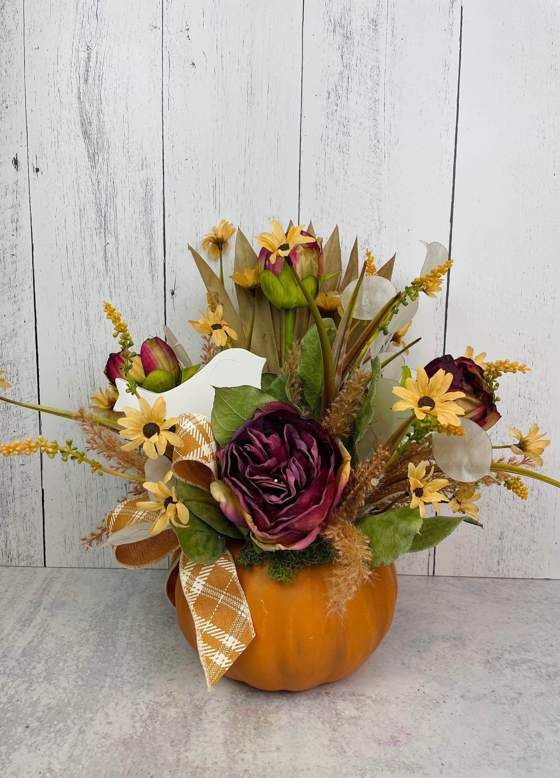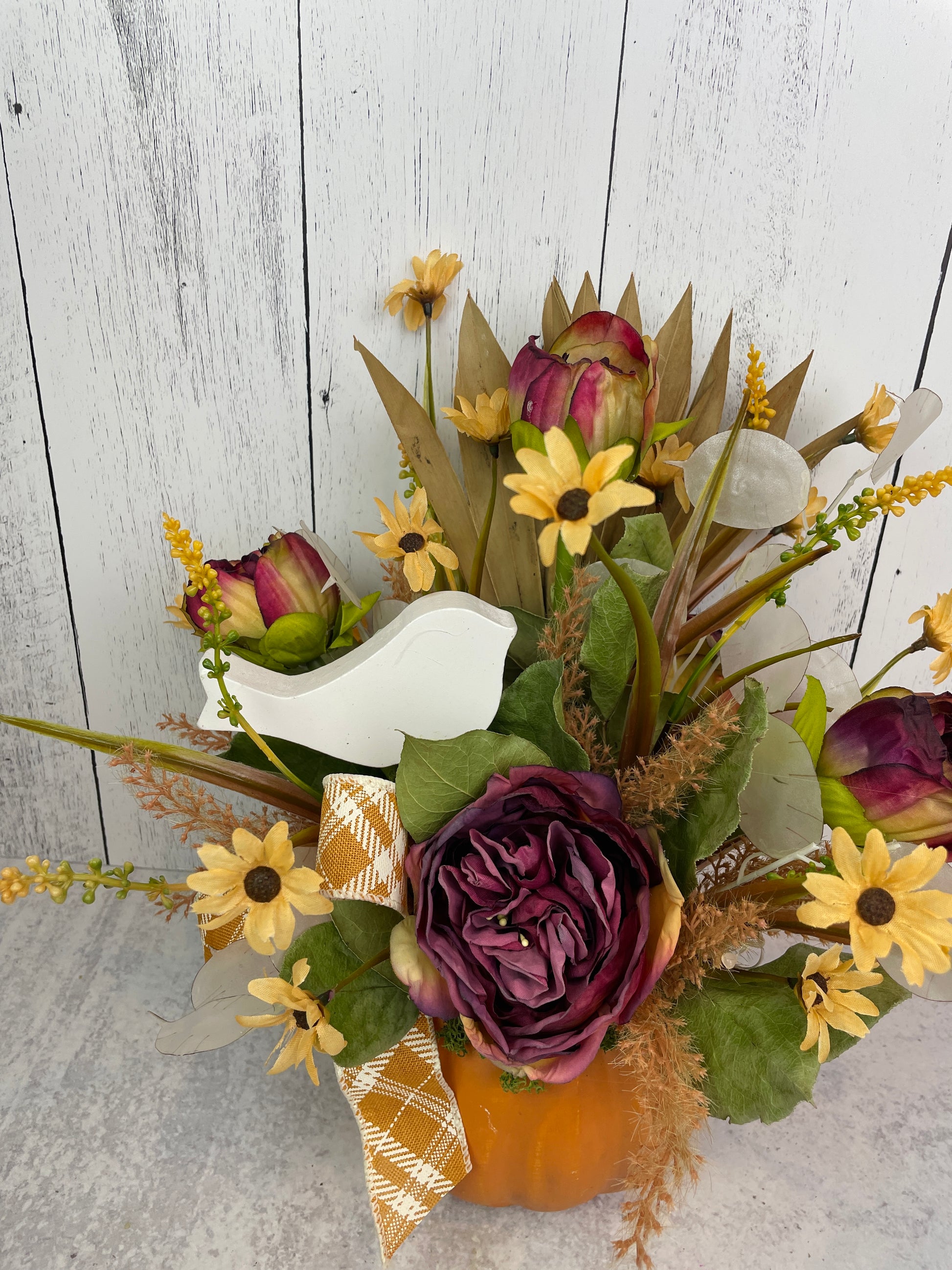 Add a touch of boho elegance to your fall decor with this stunning floral arrangement in a charming pumpkin container. This unique centerpiece features a beautiful mix of dark pink peonies, dried leaves, faux wildflowers, and natural- looking grasses, complemented by textured palm leaves for a perfect boho vibe. The combination of rich fall tones and natural elements makes it an ideal piece to elevate your seasonal decor.