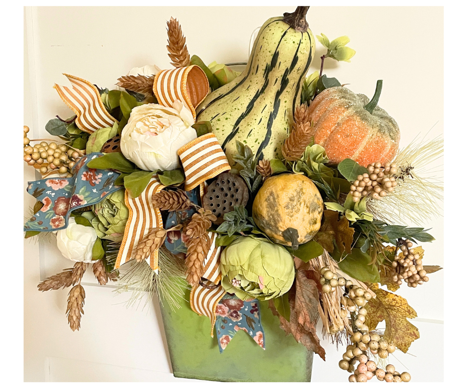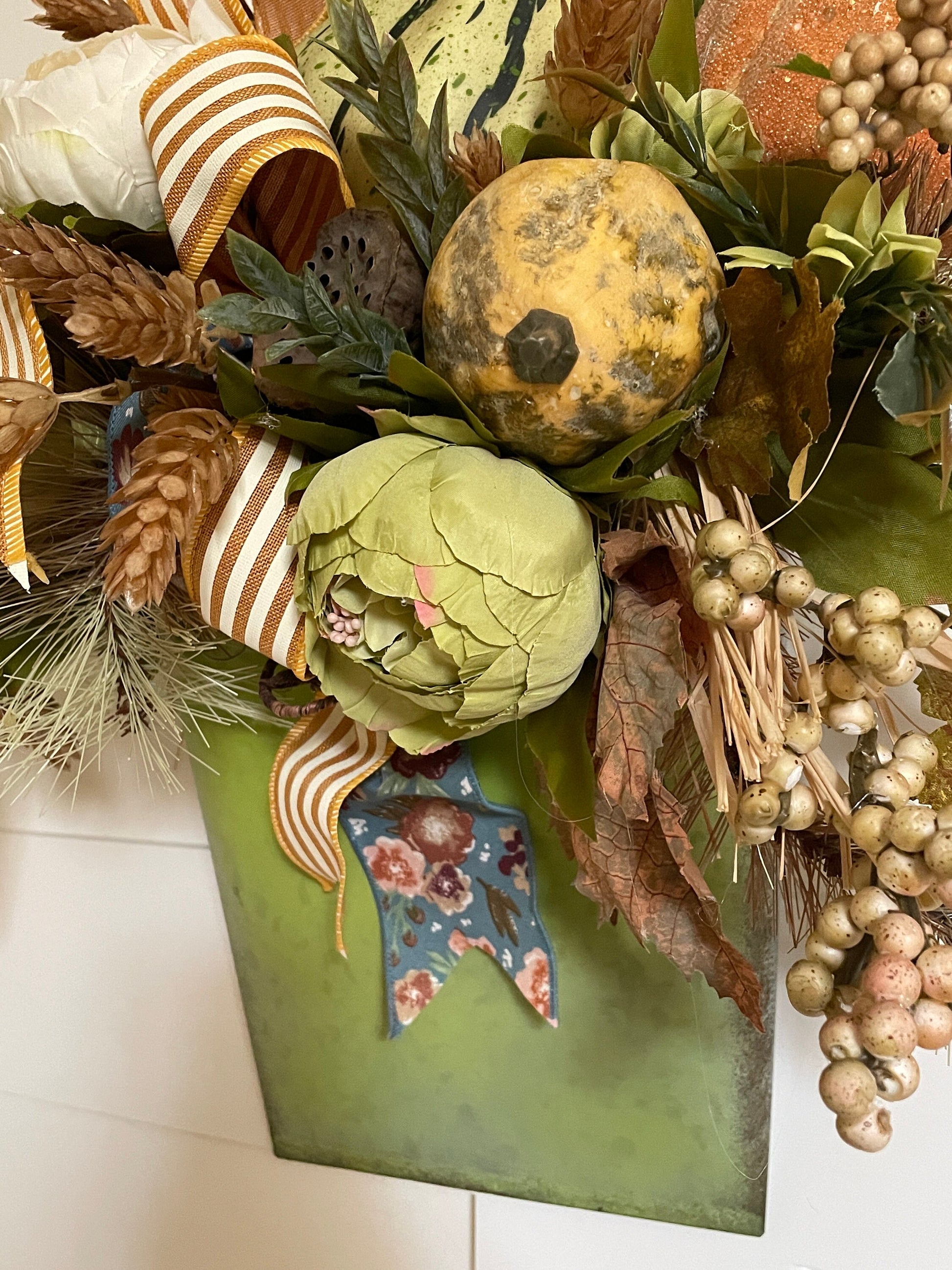 Introducing our exquisite metal wall pocket, a statement piece designed to transform your space into a haven of beauty and sophistication. This large wall pocket is brimming with seasonal delight, featuring lifelike faux pumpkins, gourds, and an abundance of lush green and cream peonies, all accented by touches of graceful greenery.