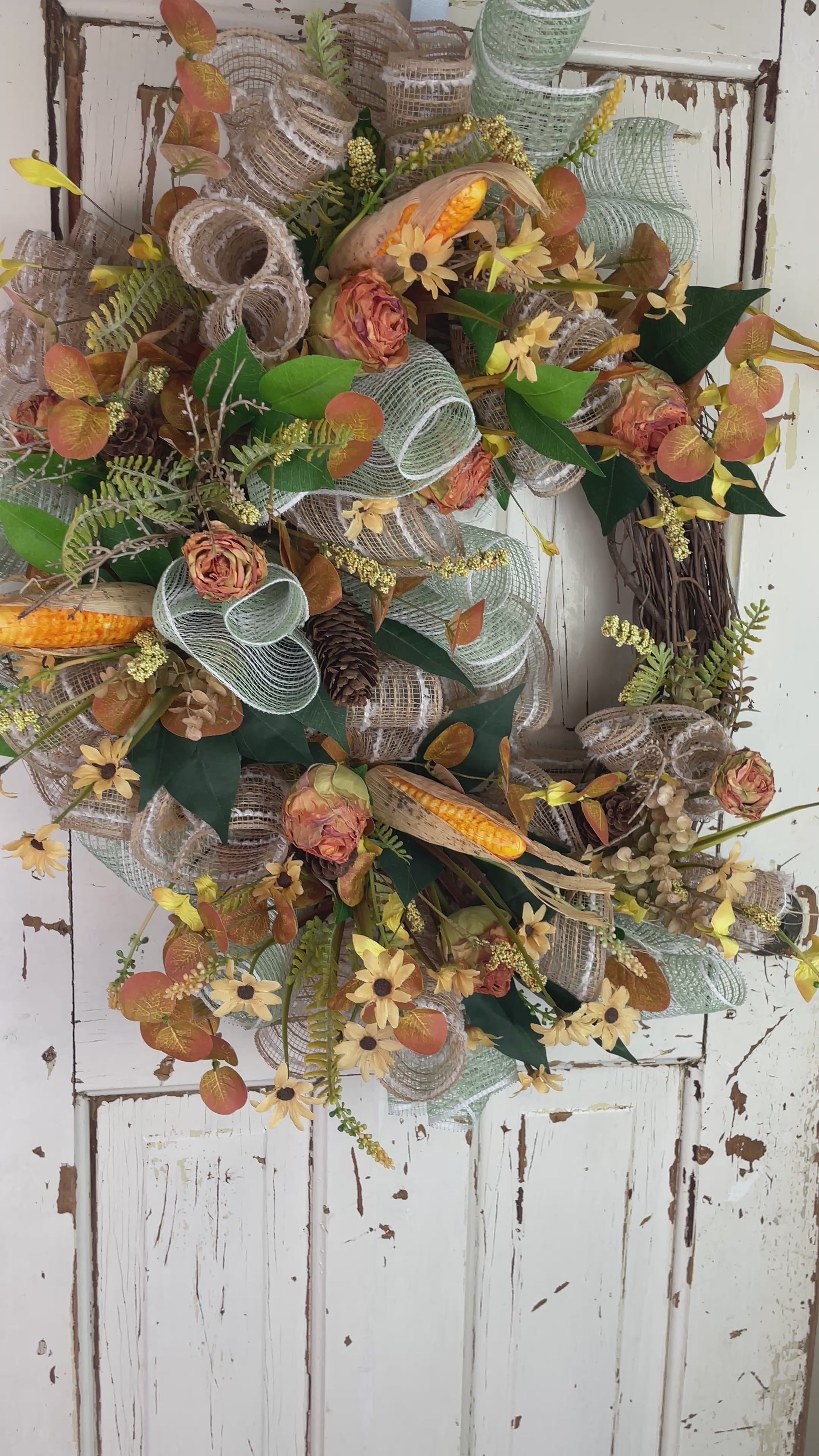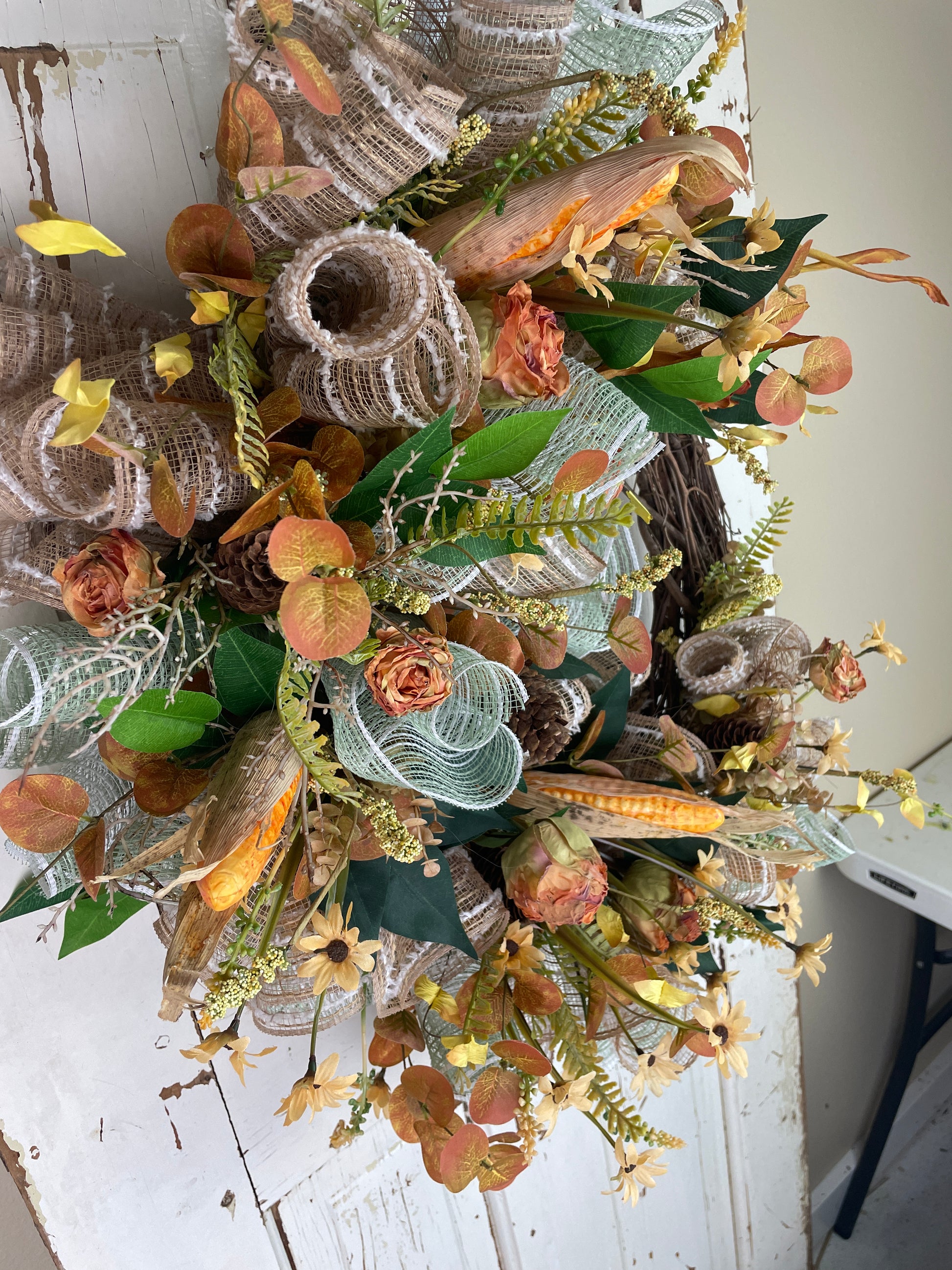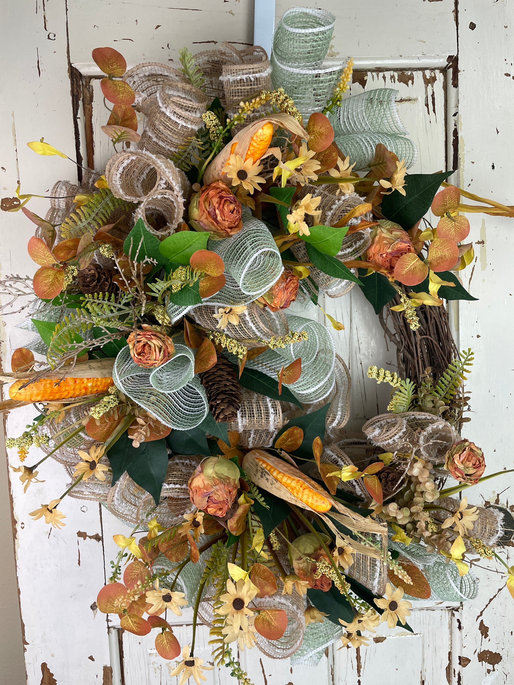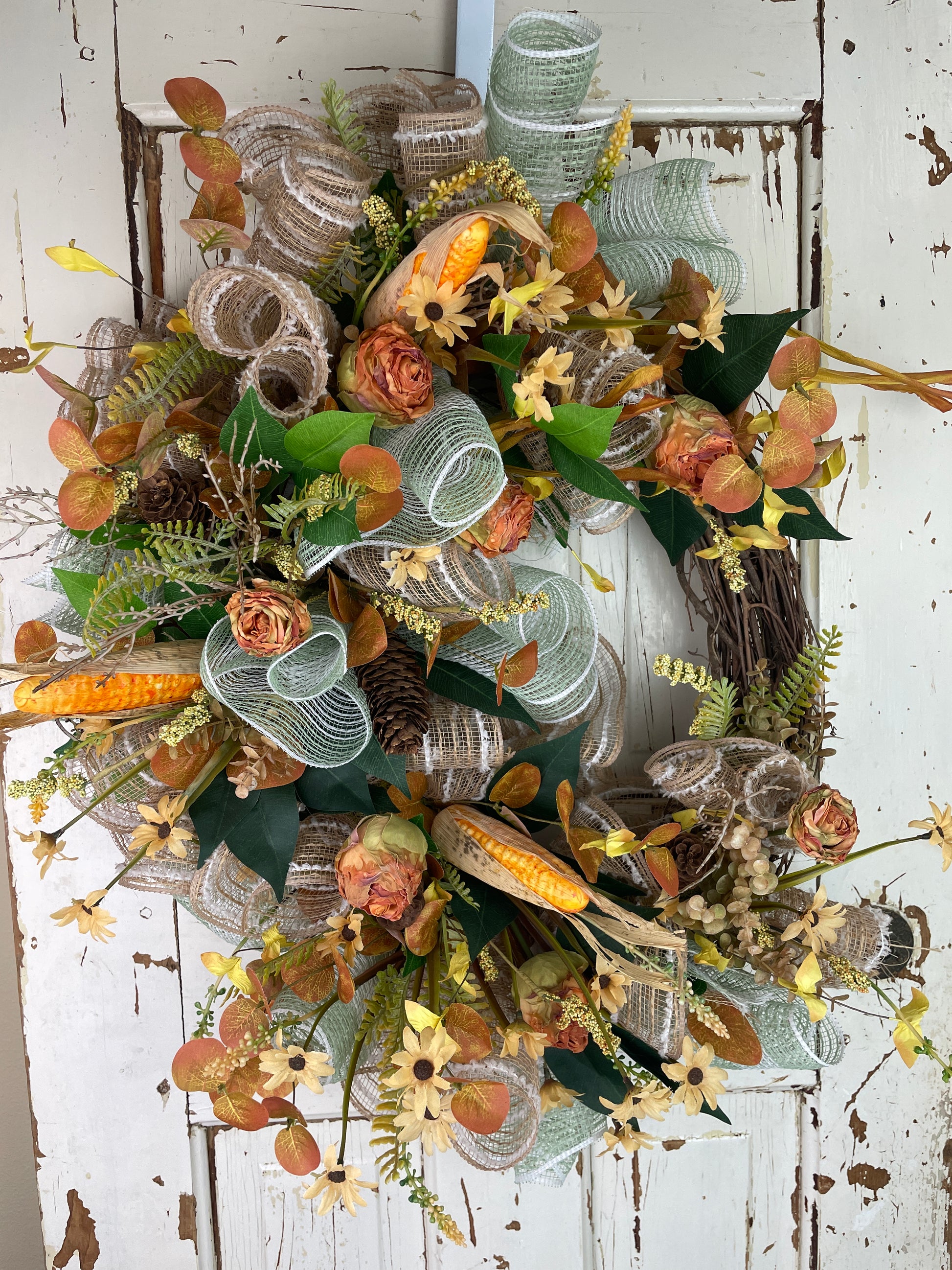 Features faux corn, roses, golden florals, mesh ribbon & greenery