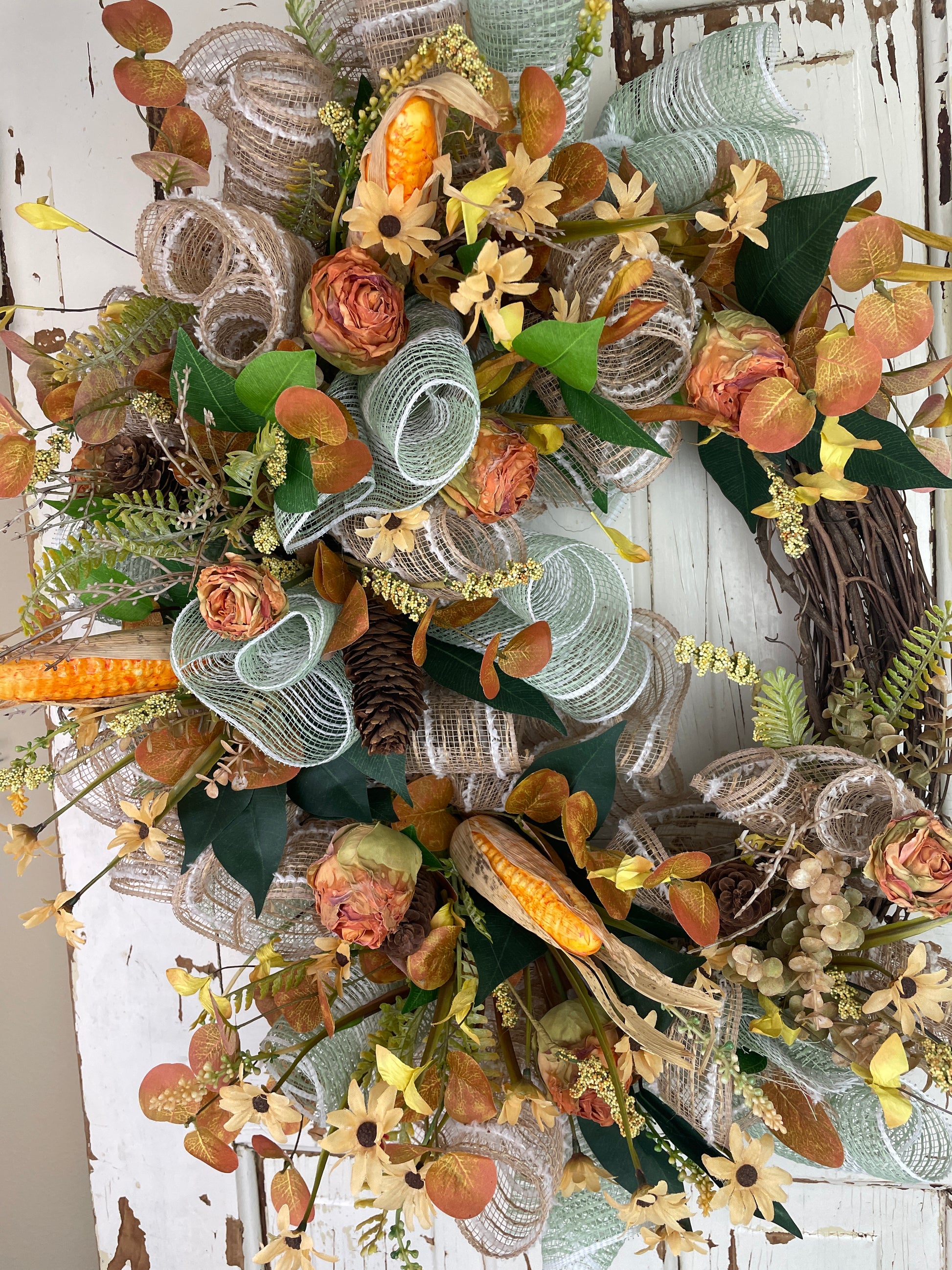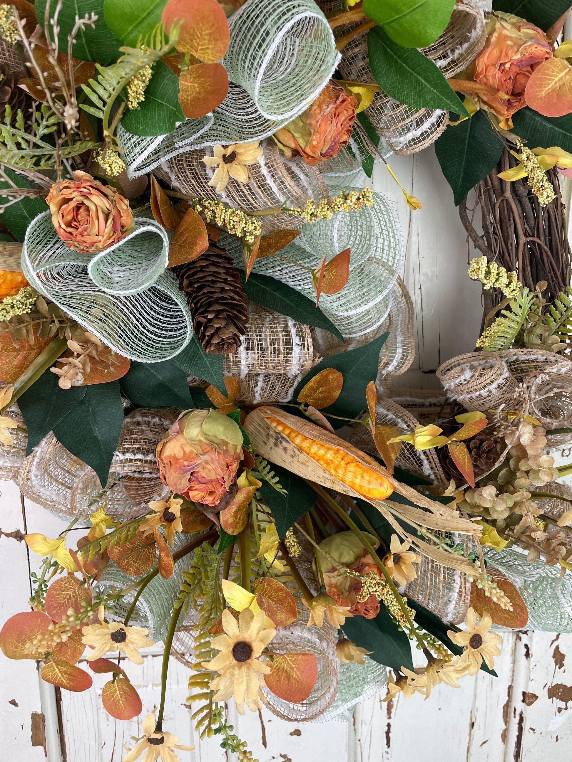 Celebrate the bounty of the season with this handcrafted fall harvest wreath, designed on a natural grapevine base and overflowing with rich autumn texture. Faux golden corn ears take center stage, surrounded by lifelike roses, golden florals, and layered greenery. Loops of rustic mesh ribbon add fullness and movement, while pinecones and foliage create depth and warmth.