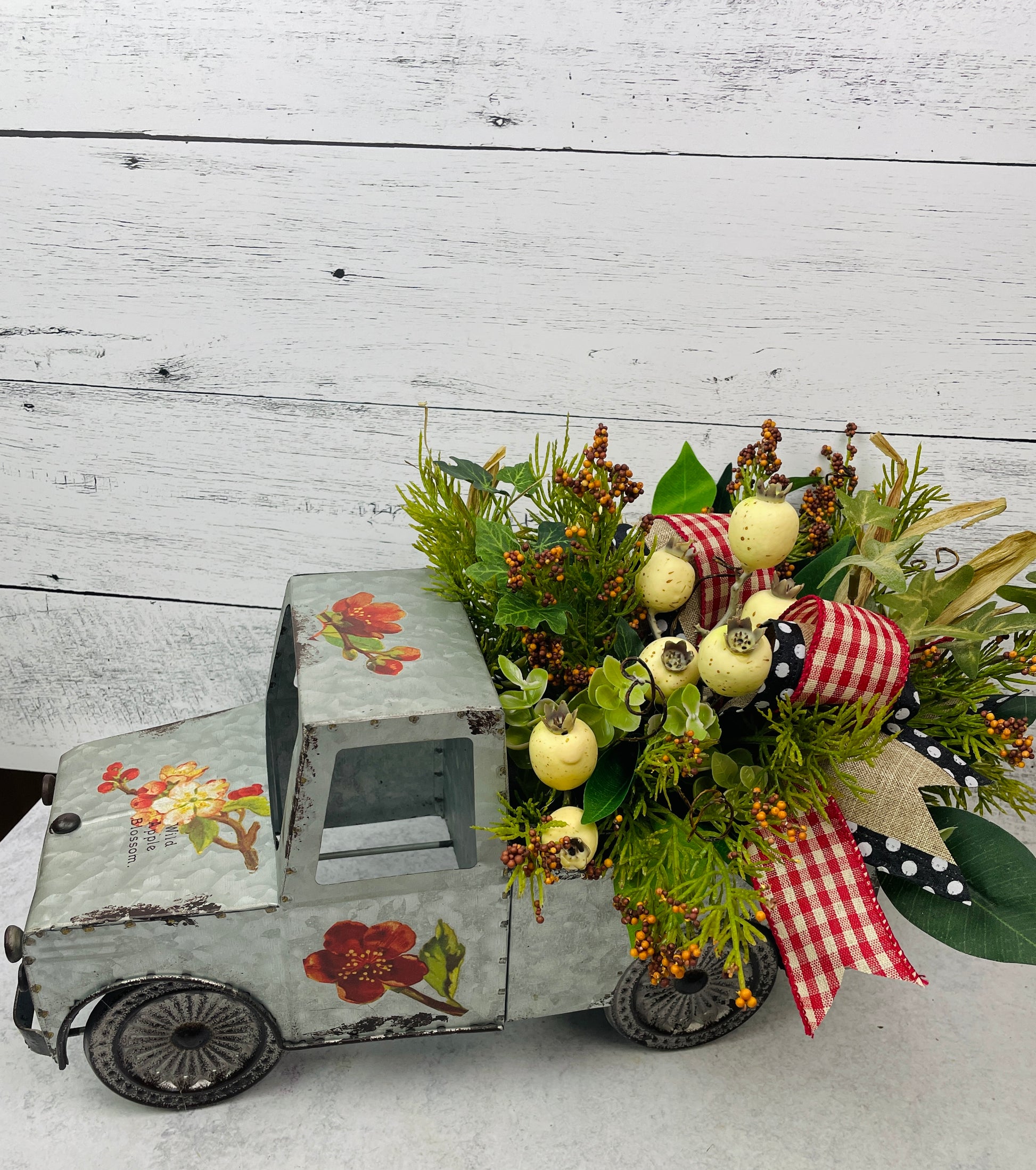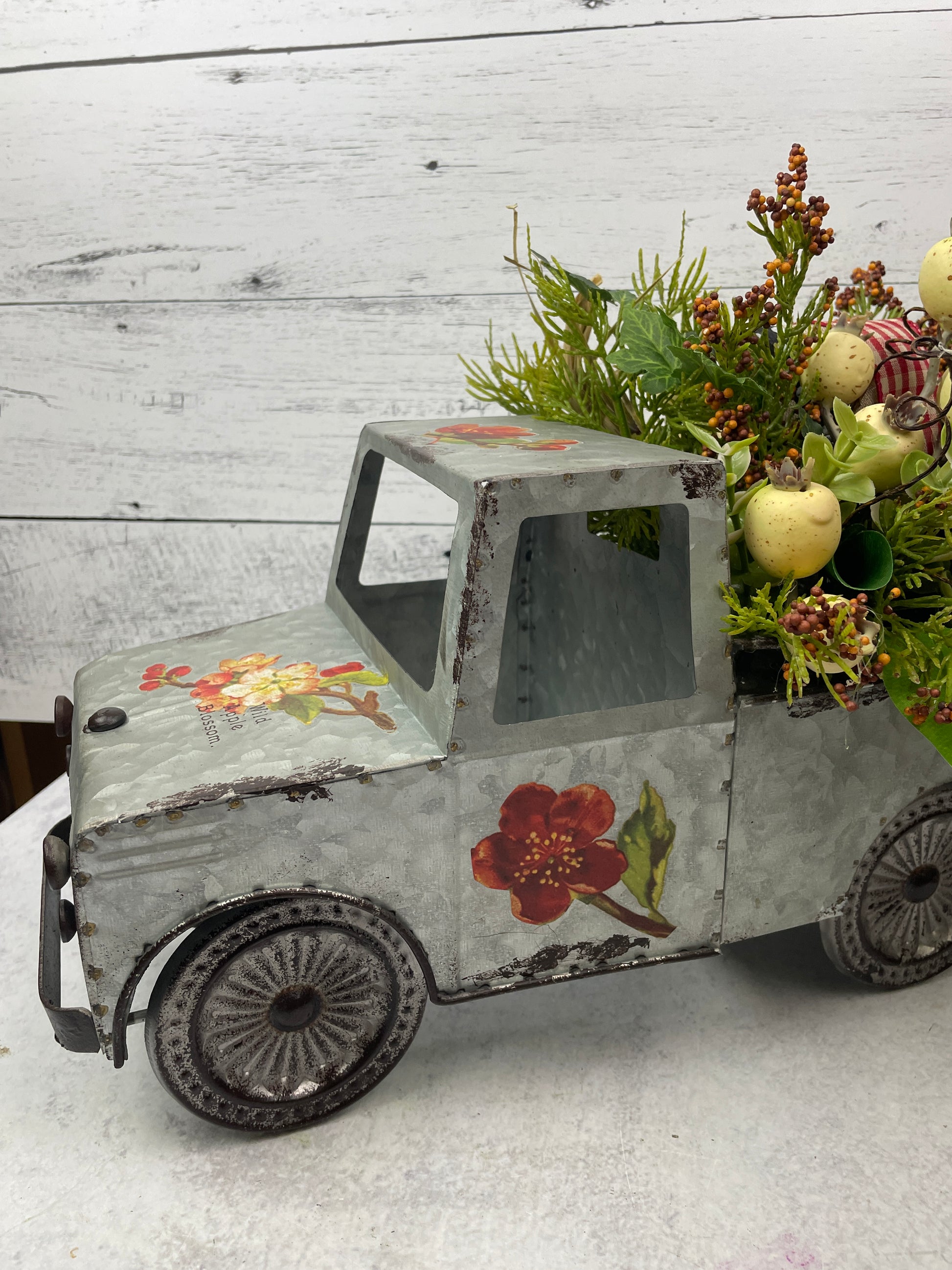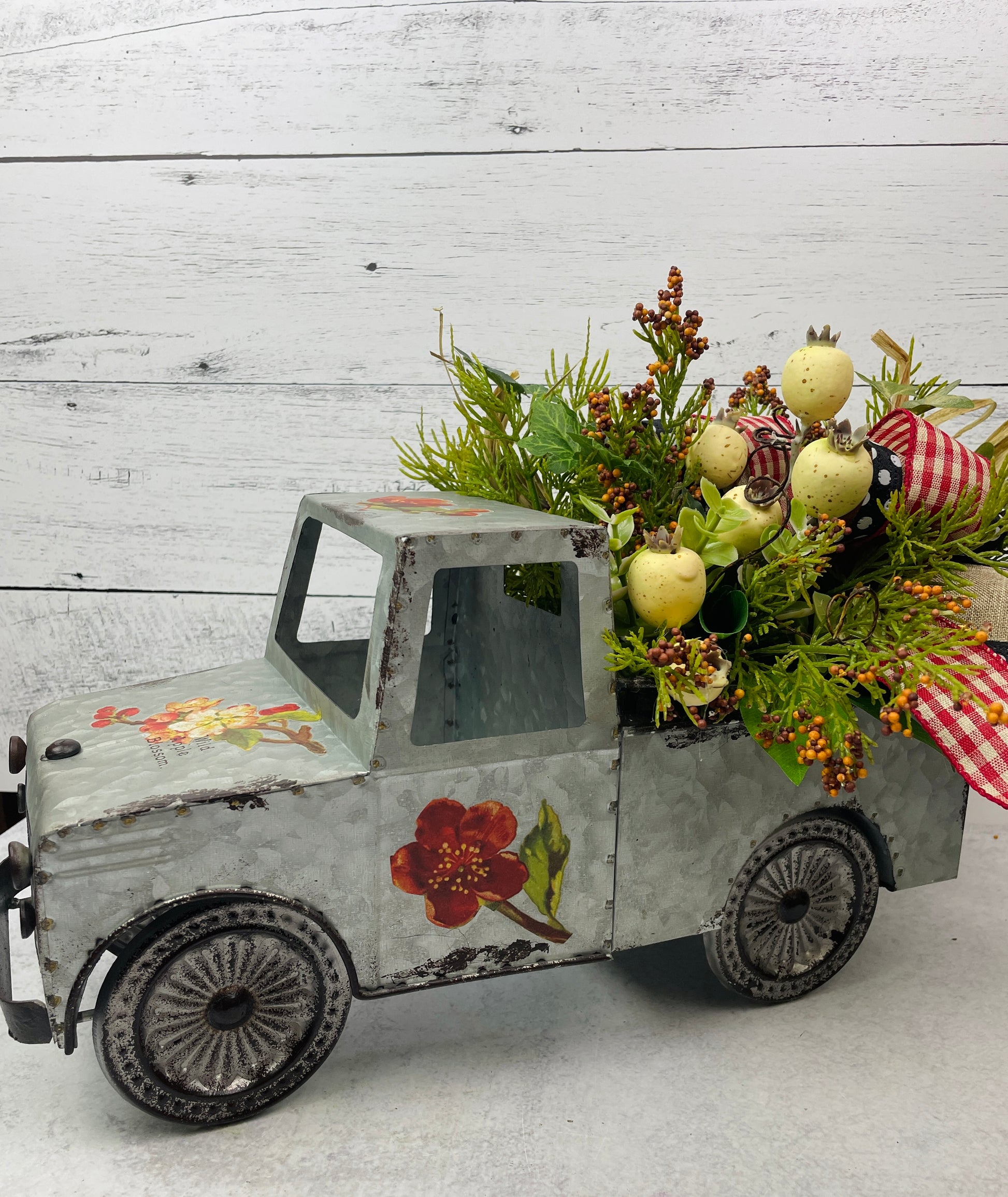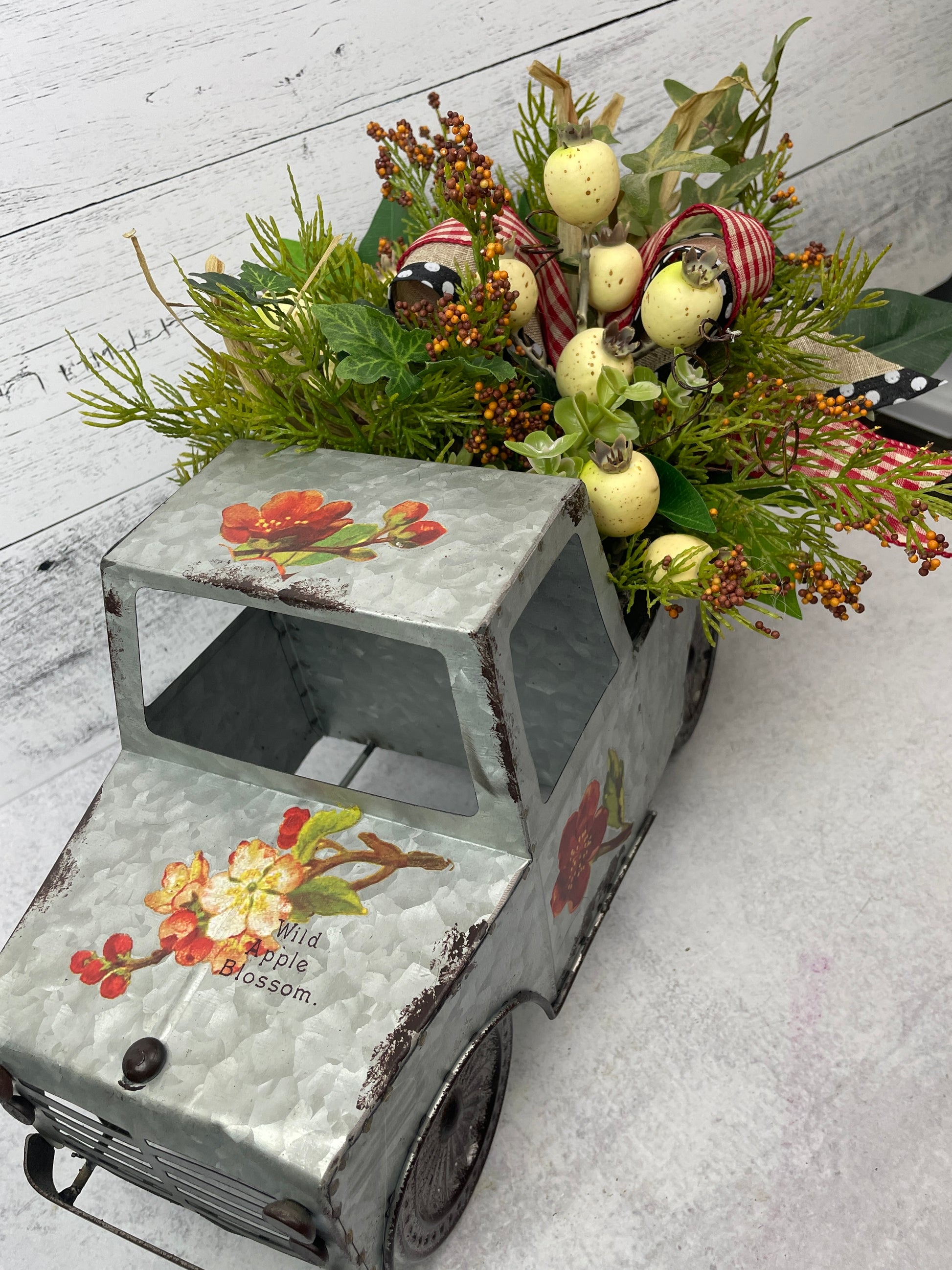 Bring a touch of vintage charm and rustic elegance to your space with this handcrafted metal truck planter, complete with a vibrant fall-inspired floral arrangement. 🛻🌼 The truck features hand-applied painted floral motifs, adding a personal and artistic touch to its rustic metal finish. Nestled in the truck bed is a delightful arrangement of faux greenery, berries, and adorable checkered ribbon accents, perfect for celebrating the cozy and colorful fall season.
