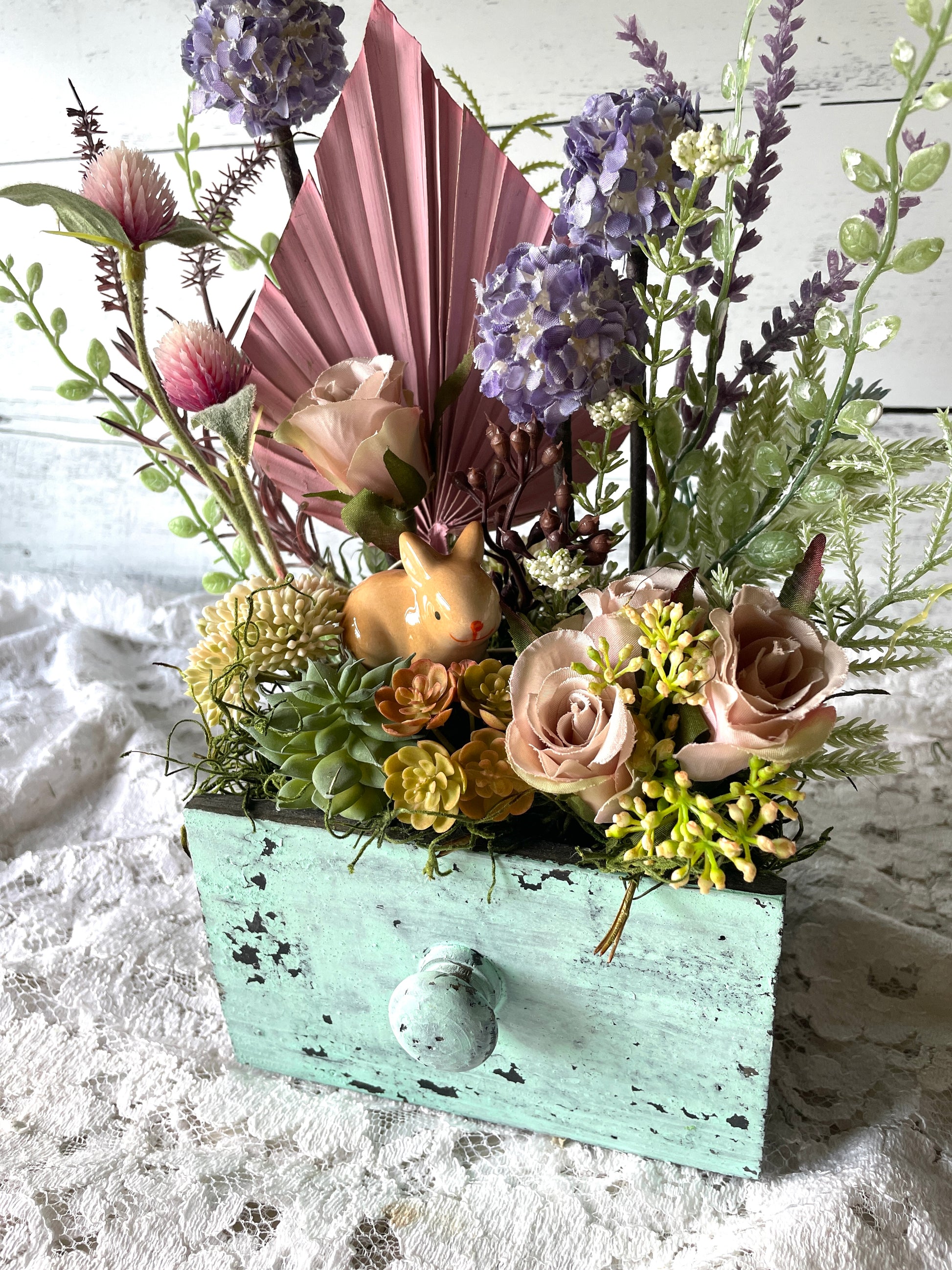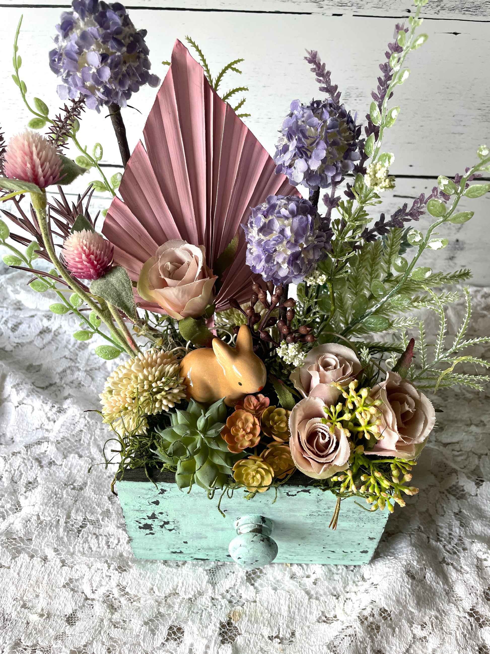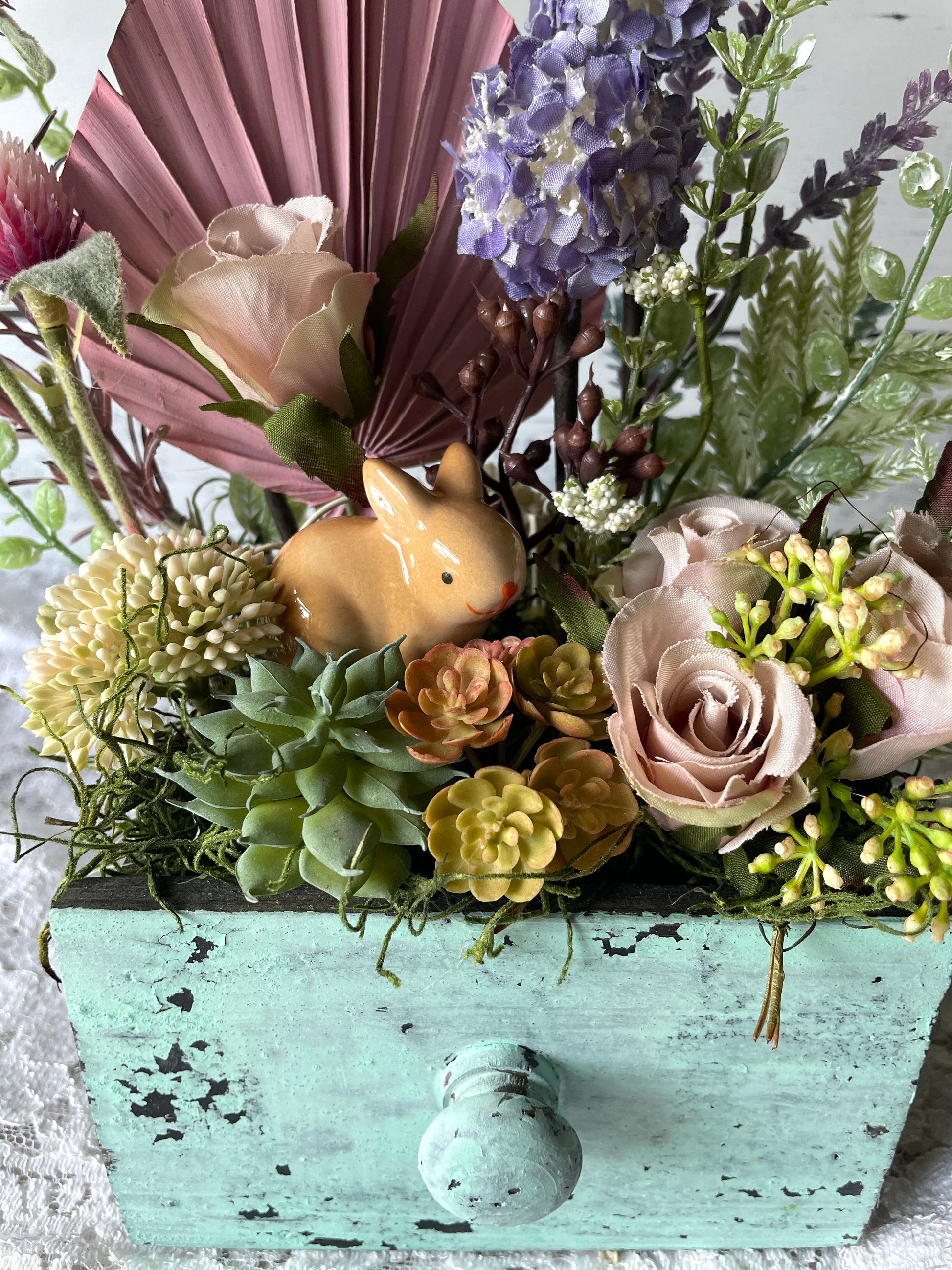 This whimsical floral arrangement is like a peek into a storybook garden—complete with soft silk roses, lifelike succulents, dried botanicals, and a tiny golden rabbit nestled right at home. Designed in a distressed mint drawer with a porcelain knob, this one-of-a-kind piece is perfect for adding a sweet, cottagecore touch to your shelf, entryway table, or spring vignette.