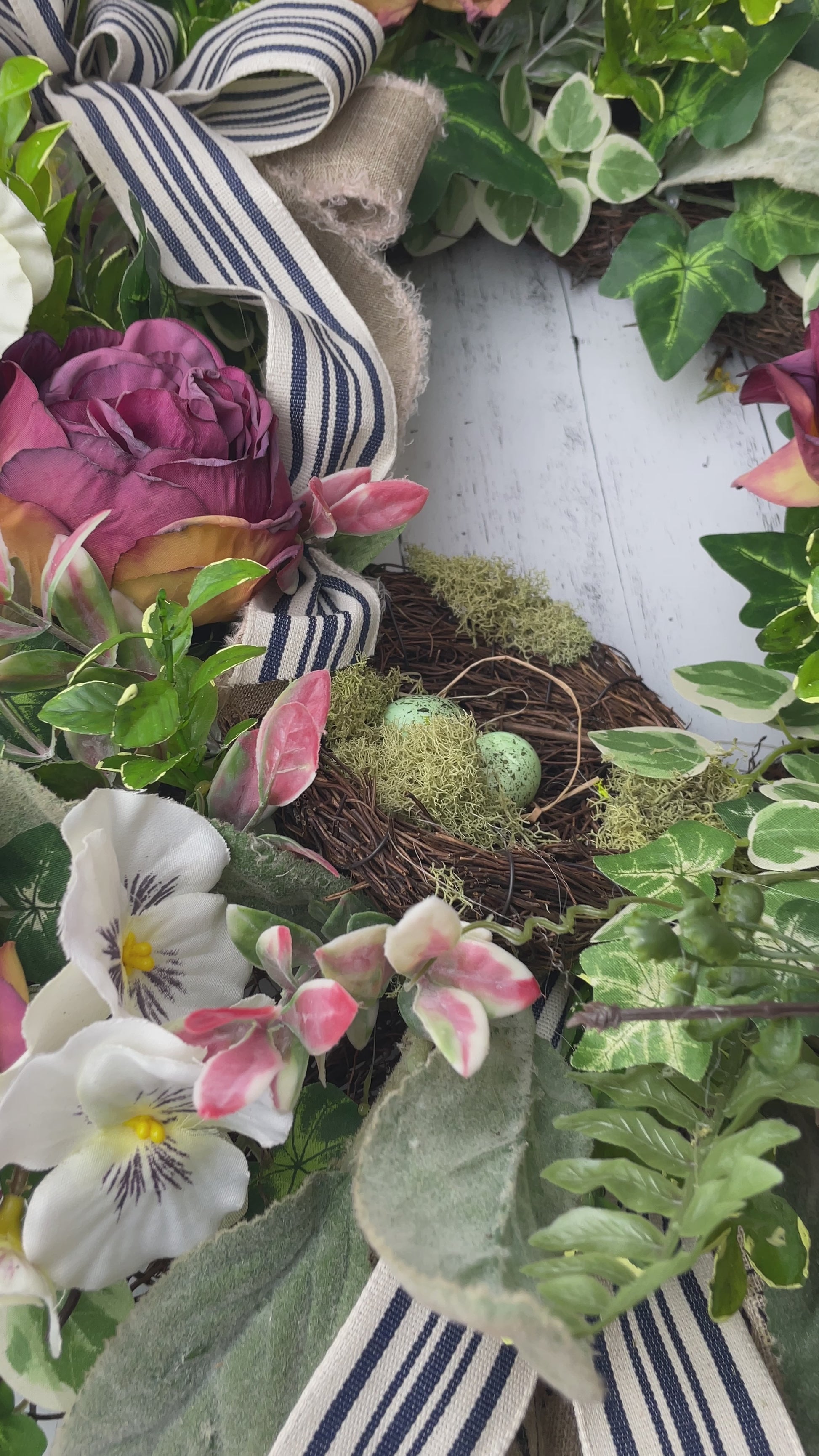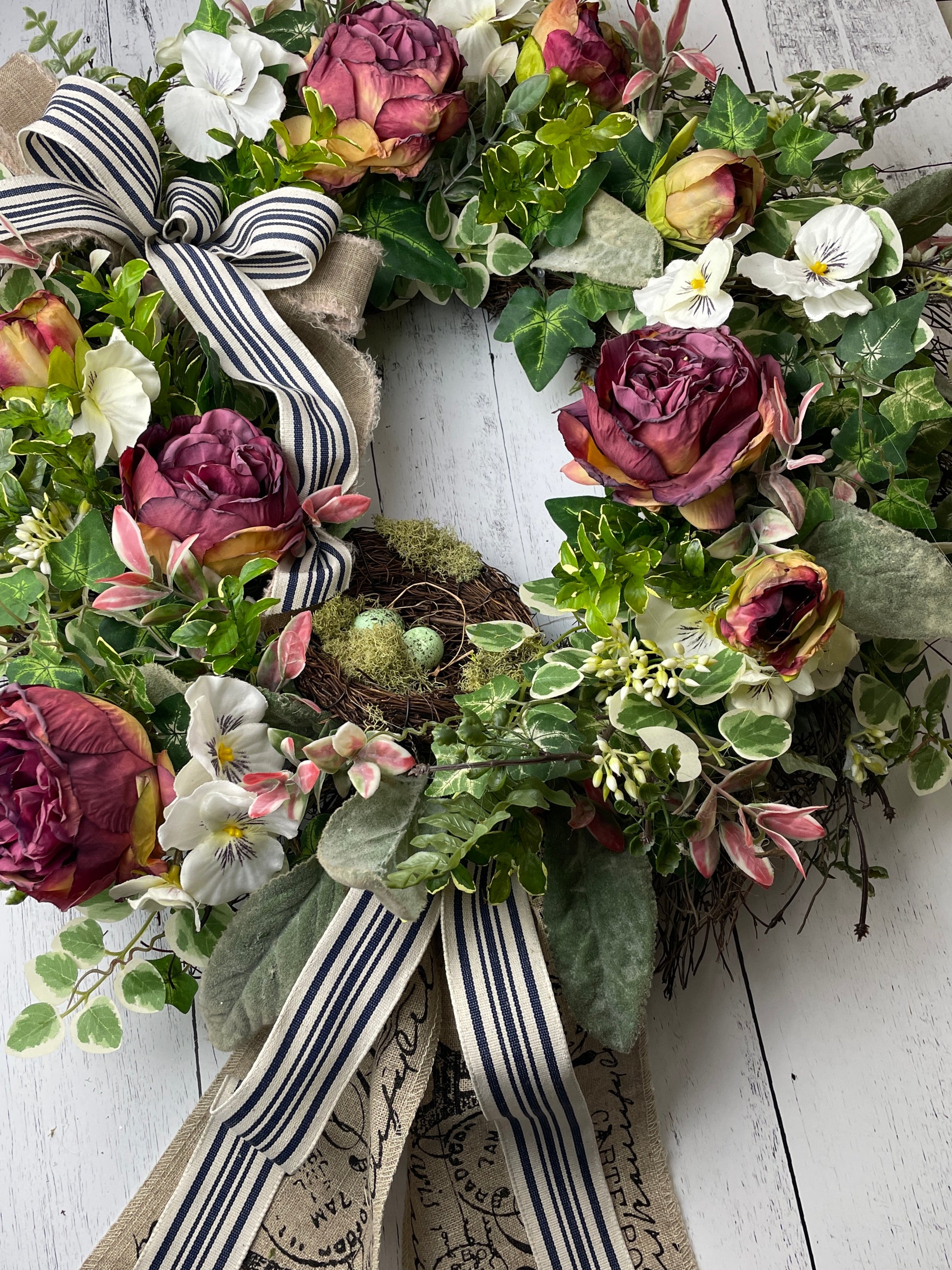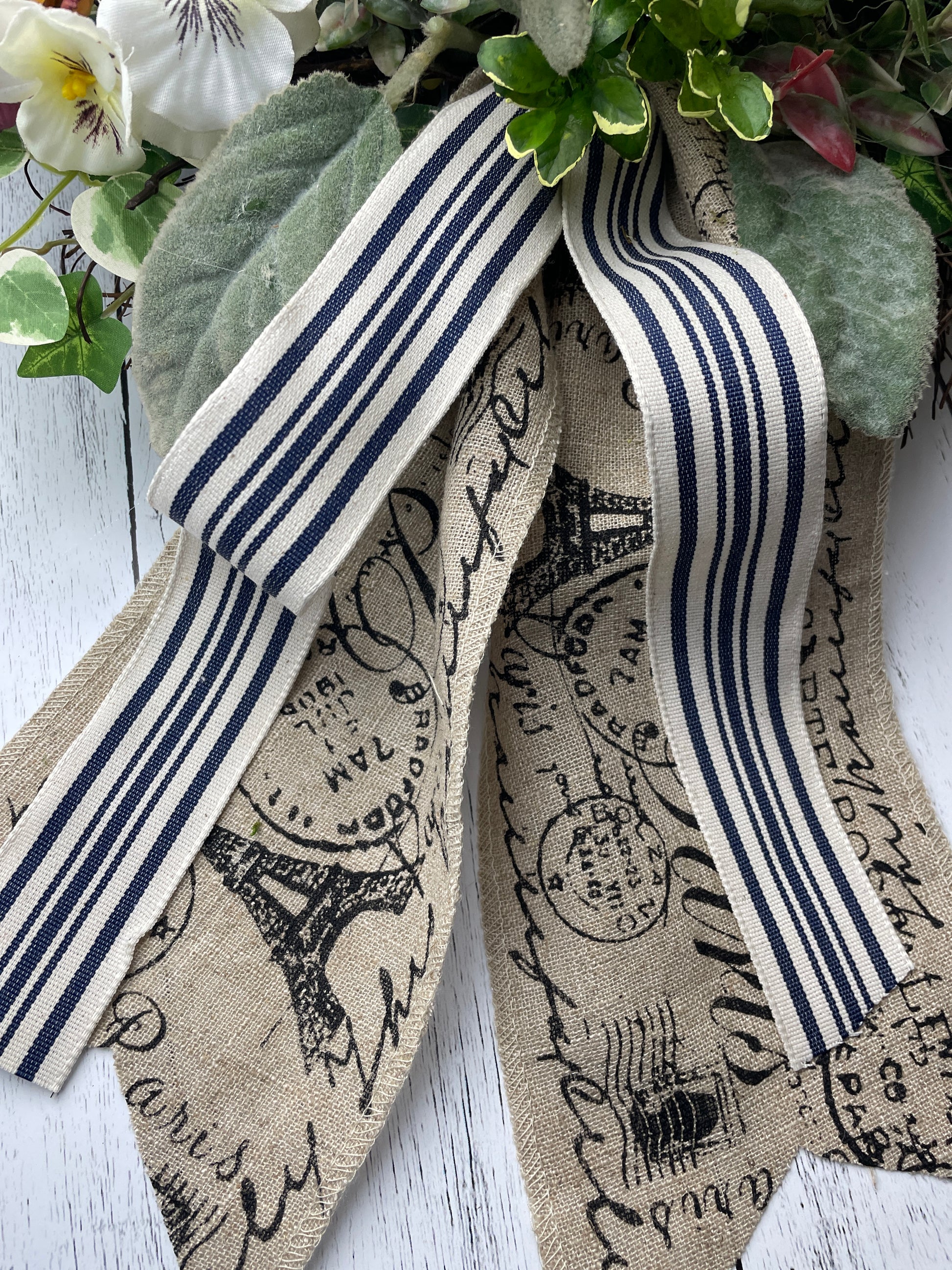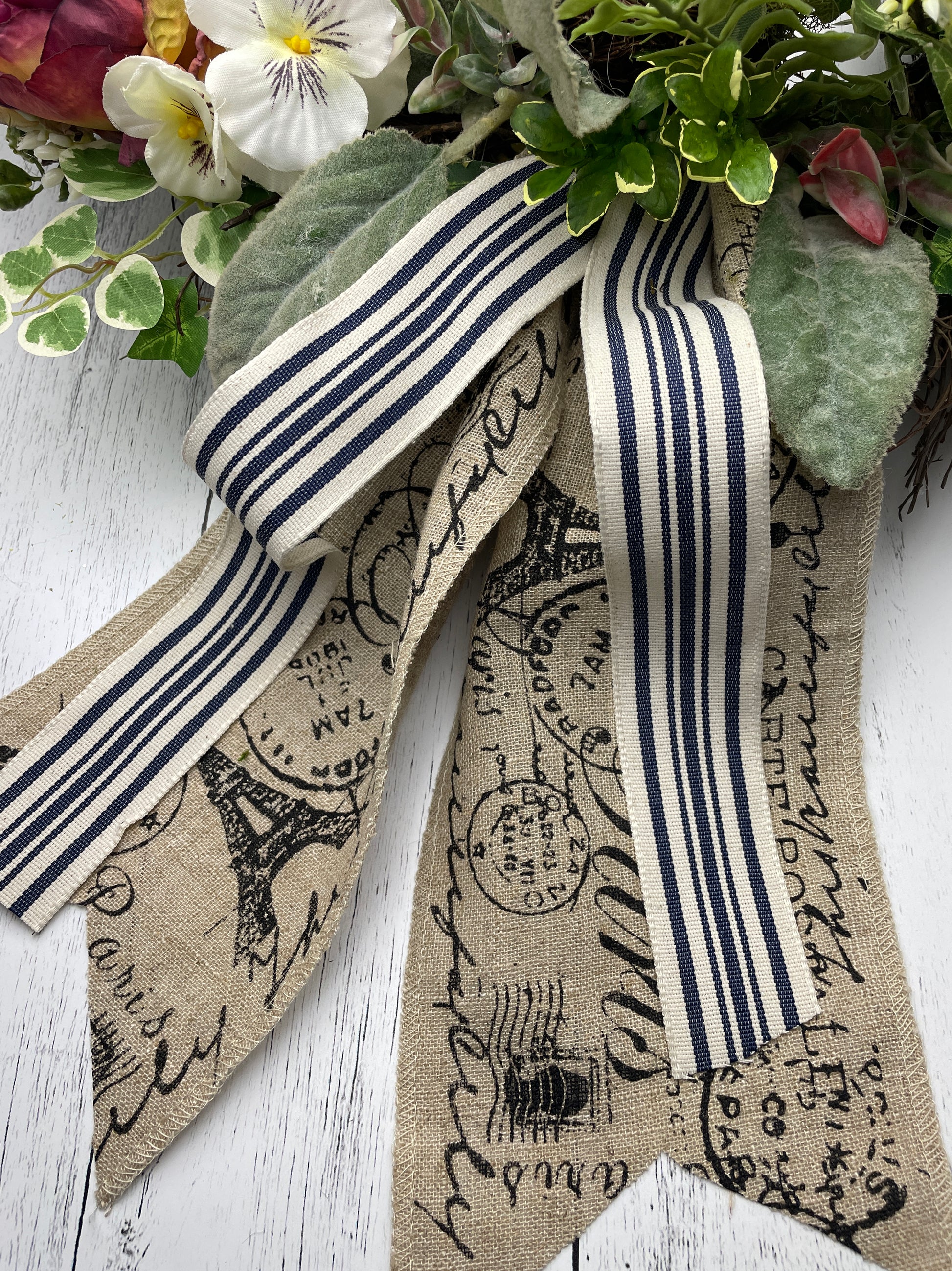 The blue ticking ribbon paired with a wide Paris motif ribbon enhances its French country charm, making it perfect for those who adore country style or French country home decor. Each element has been thoughtfully chosen to create a wreath that embodies the rustic, vintage feel of the French countryside. This wreath is not just a decoration—it's a piece of art that will bring warmth, style, and a touch of European flair to your home all year round. Perfect for everyday decor, it's a lovely way to add character and grace to your living spaces.