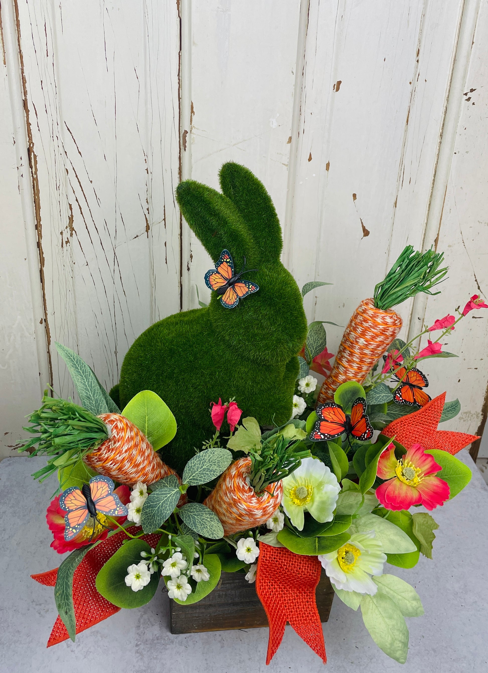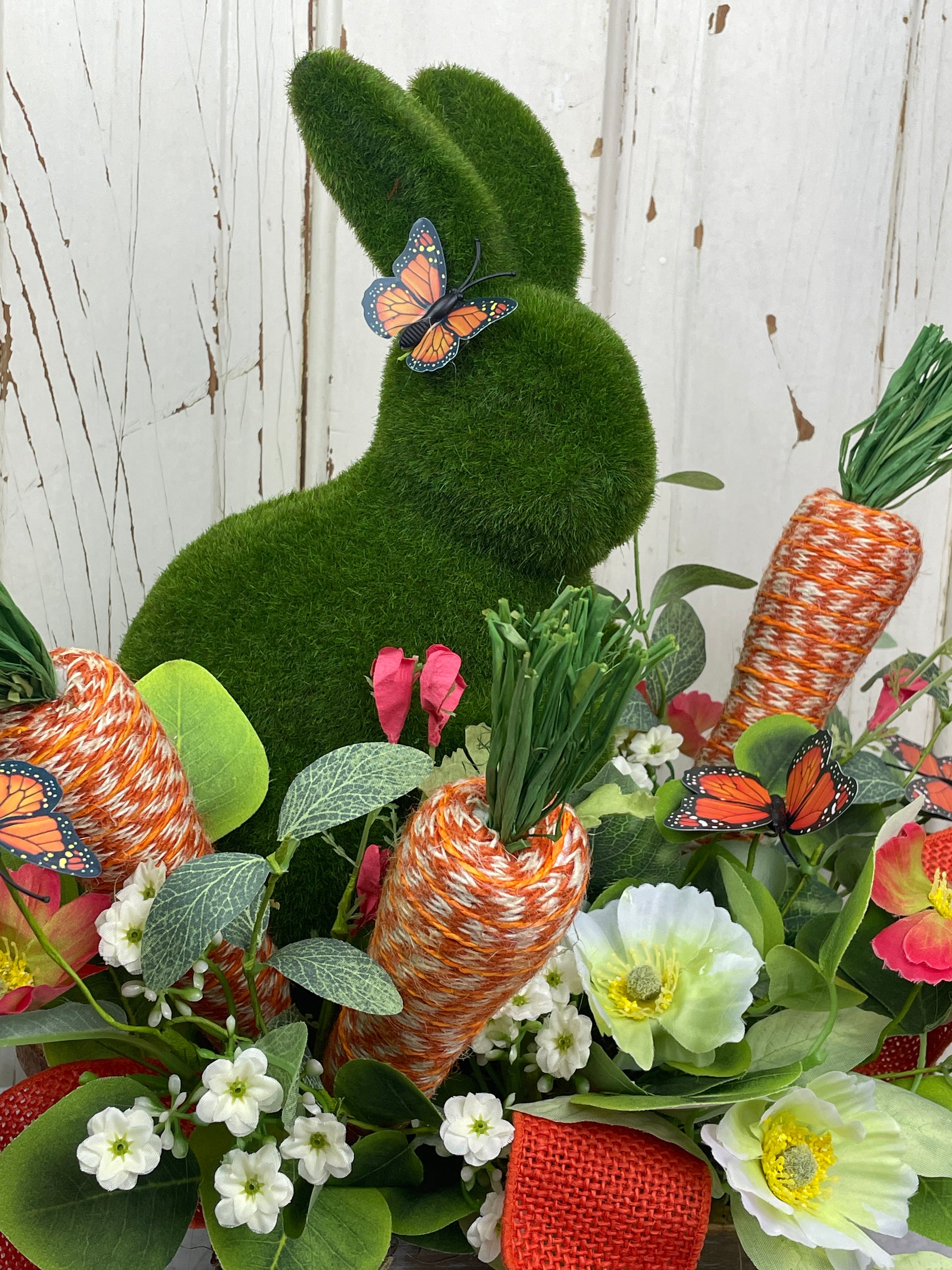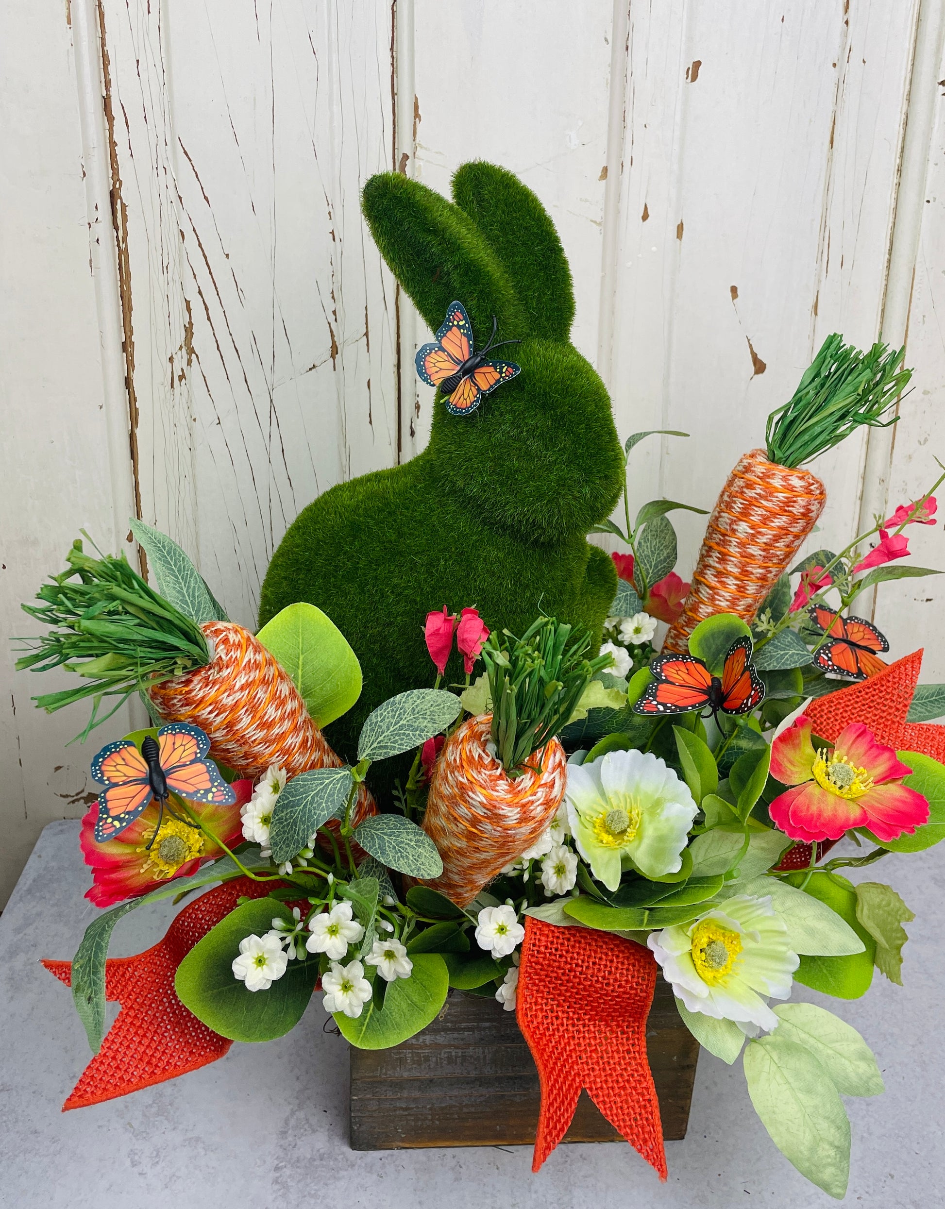 Includes a charming moss bunny and decorative carrots wrapped in twine.
