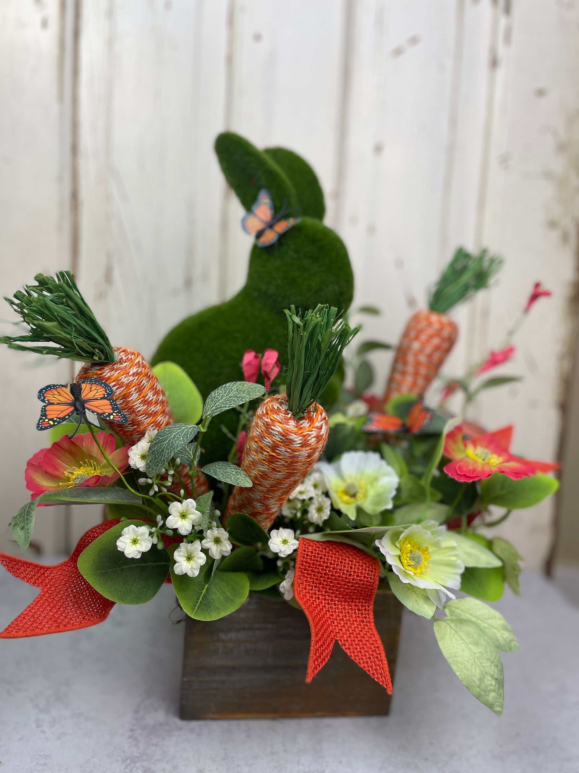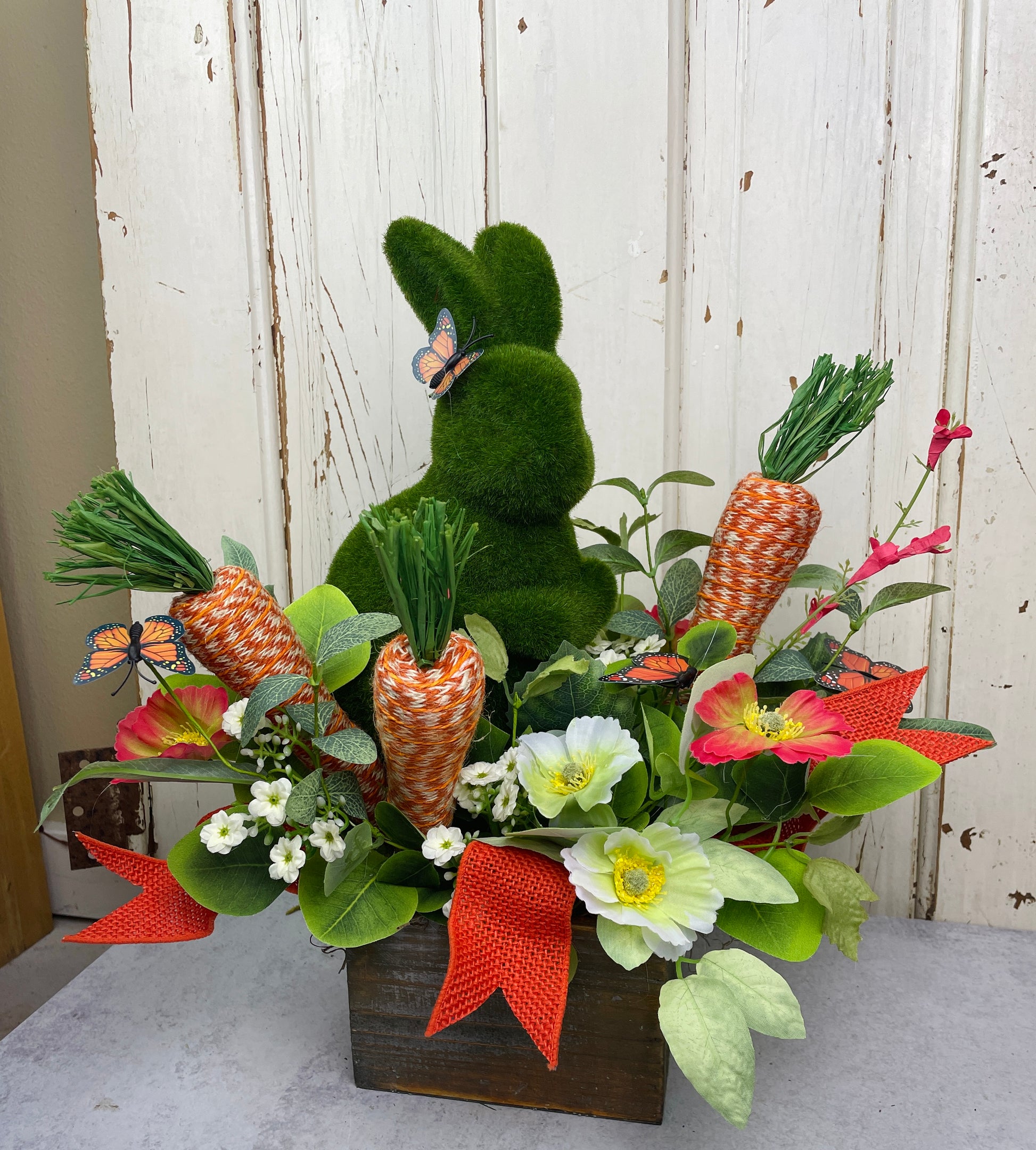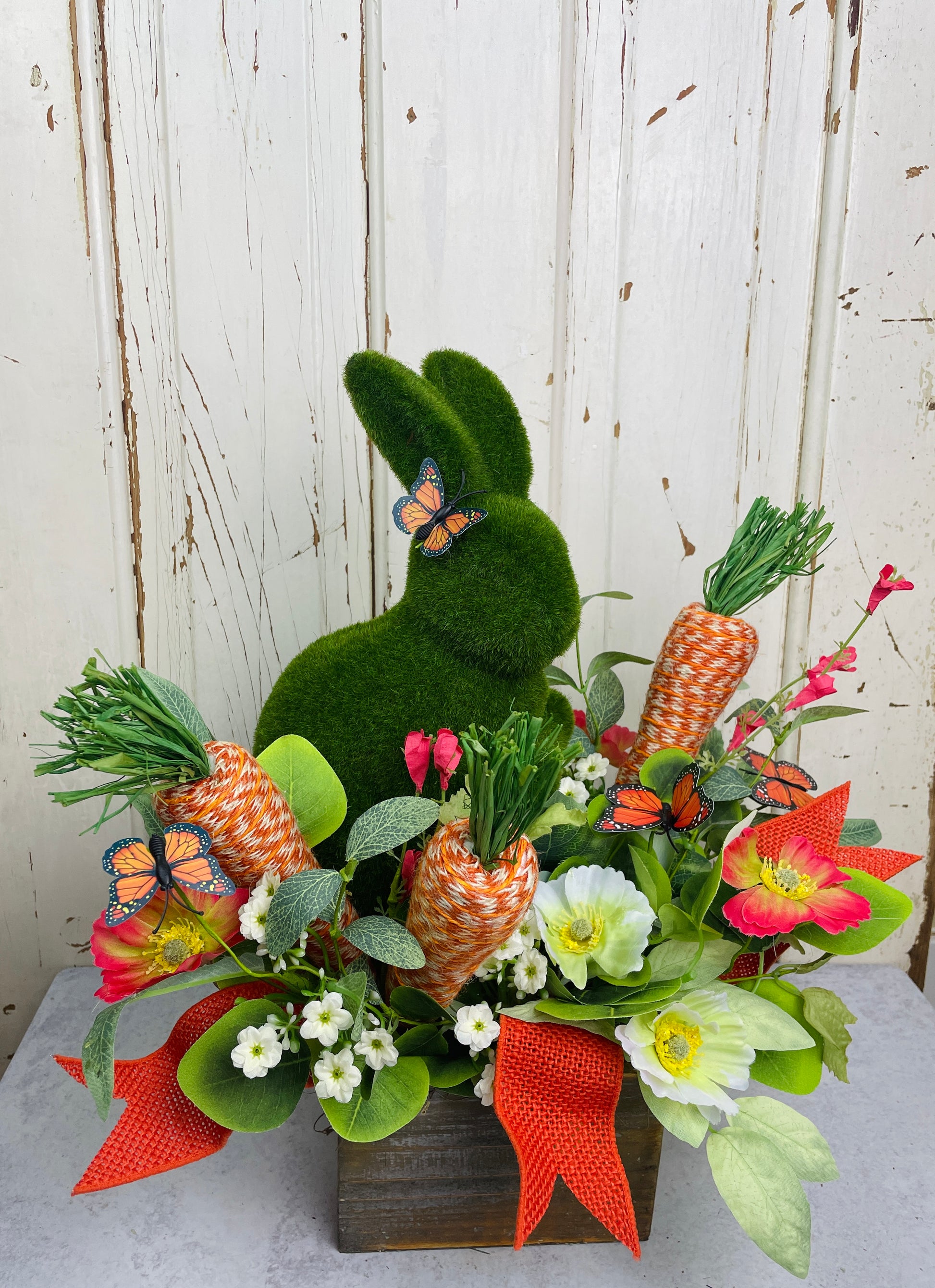 Includes a charming moss bunny and decorative carrots wrapped in twine.