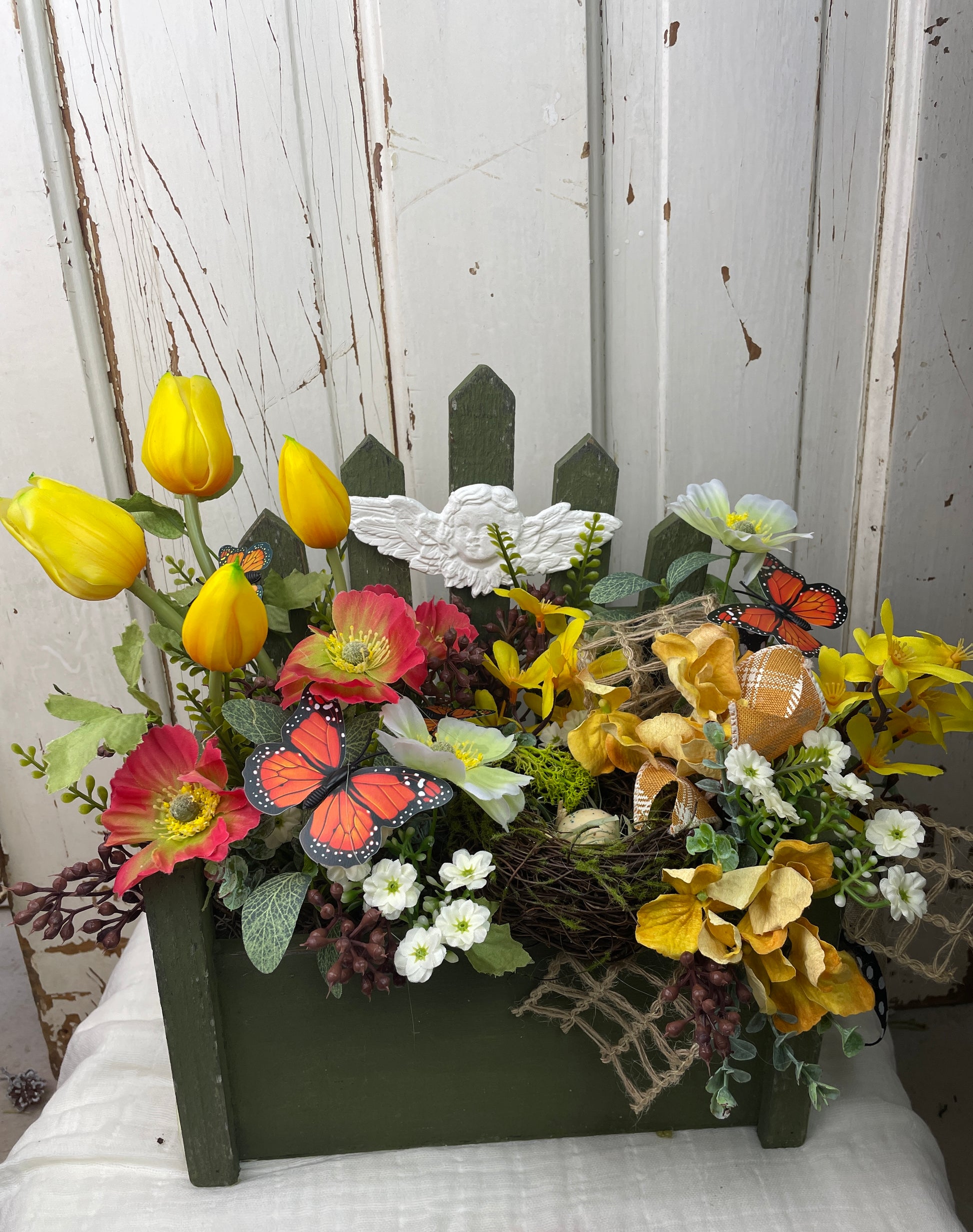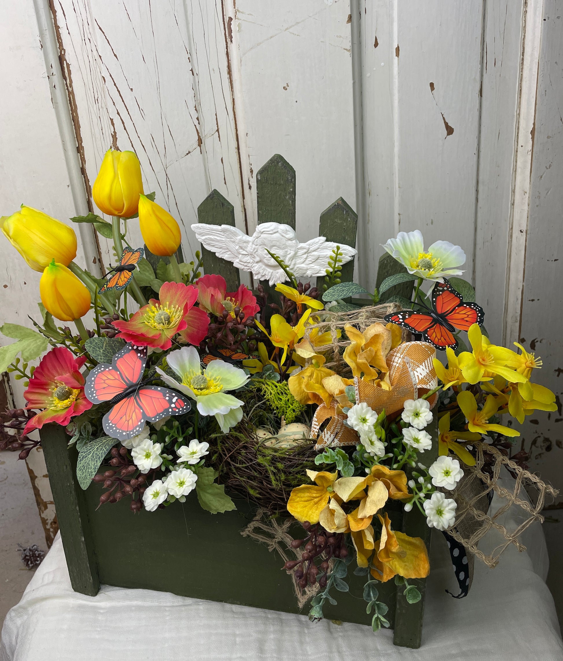 Bring the warmth of spring and summer into your home with this stunning silk floral arrangement! Featuring vibrant yellow and orange flowers, this handcrafted piece is nestled in a charming rustic-style picket fence container, making it a perfect addition to any farmhouse decor.