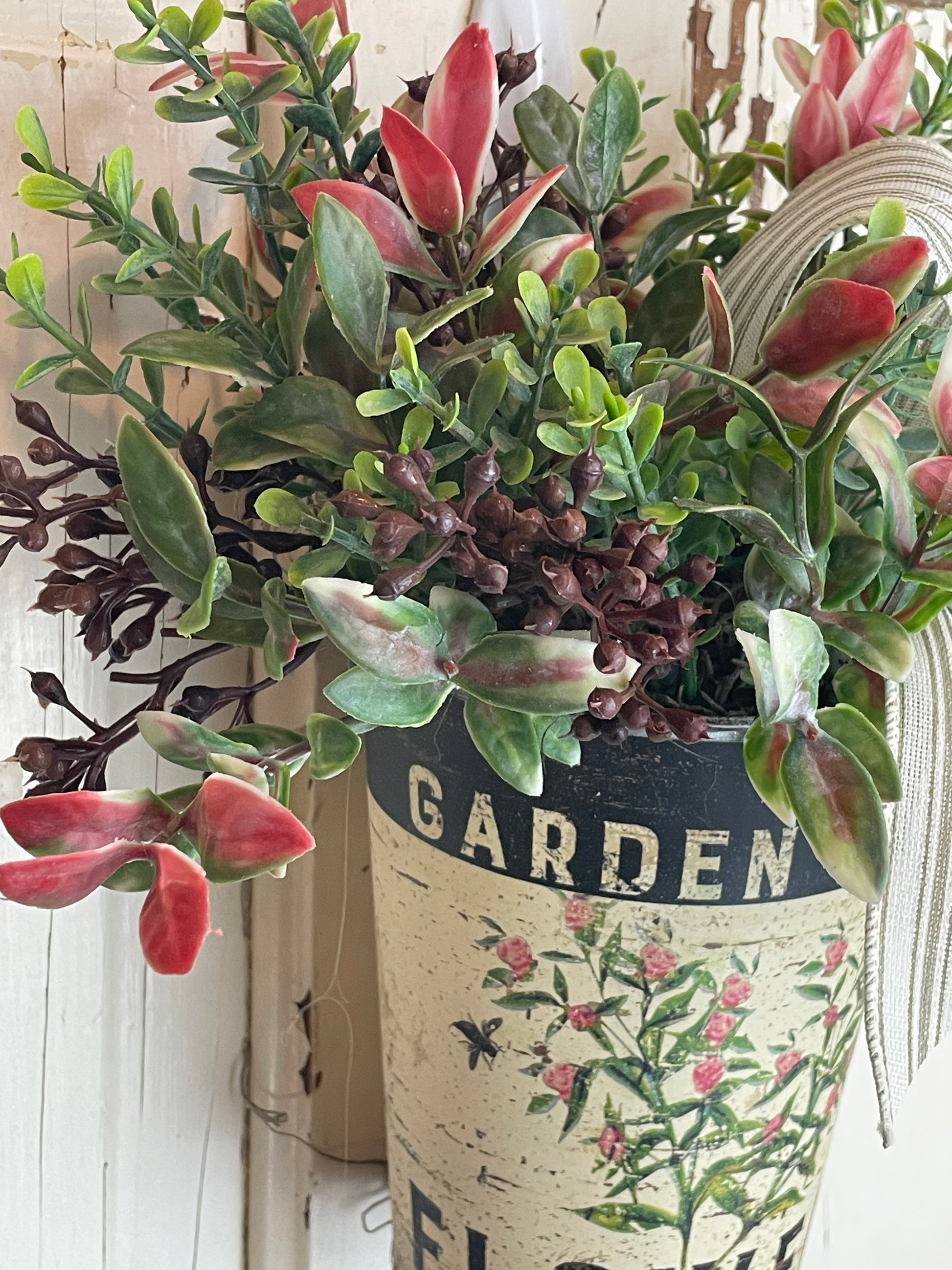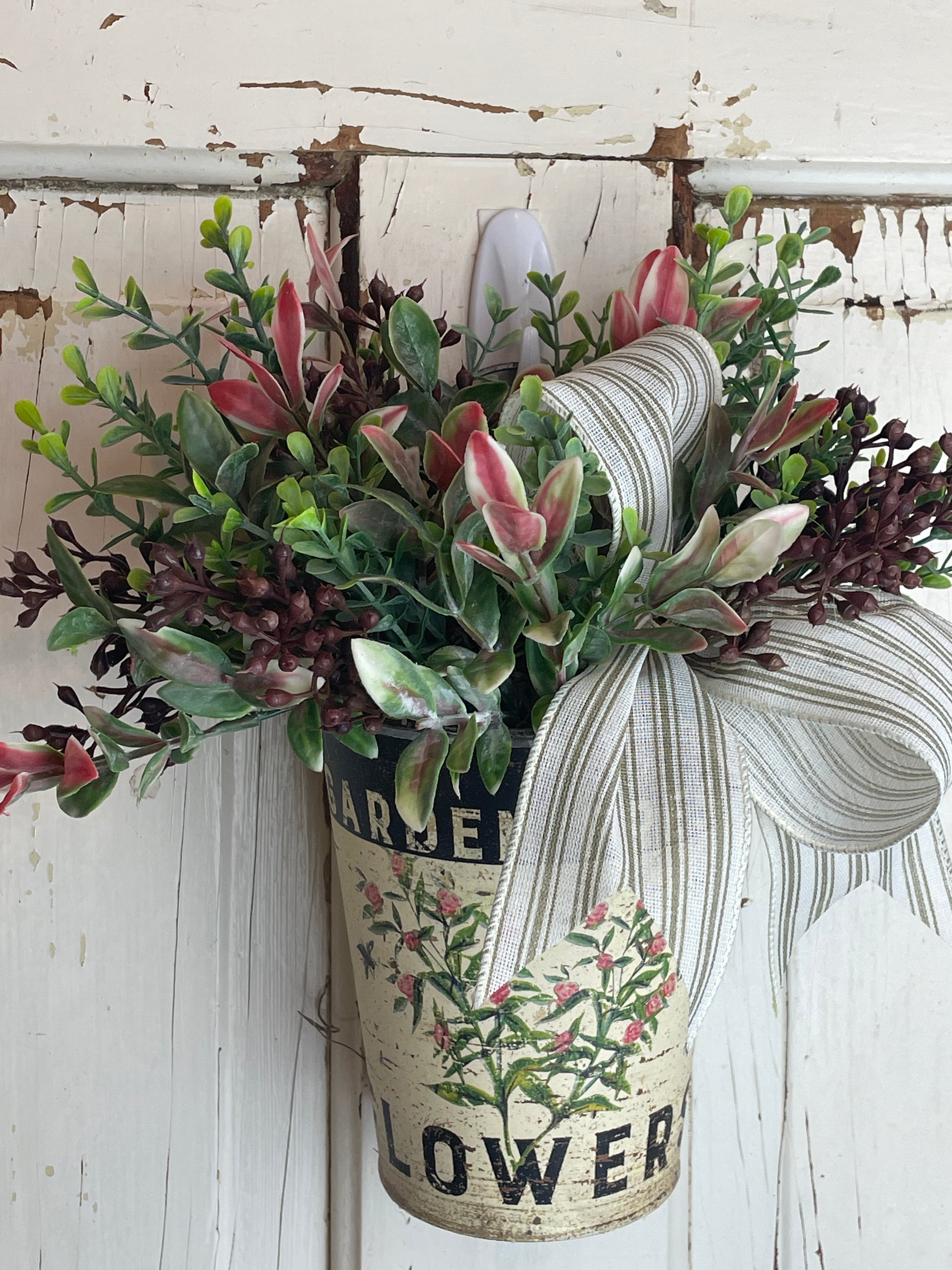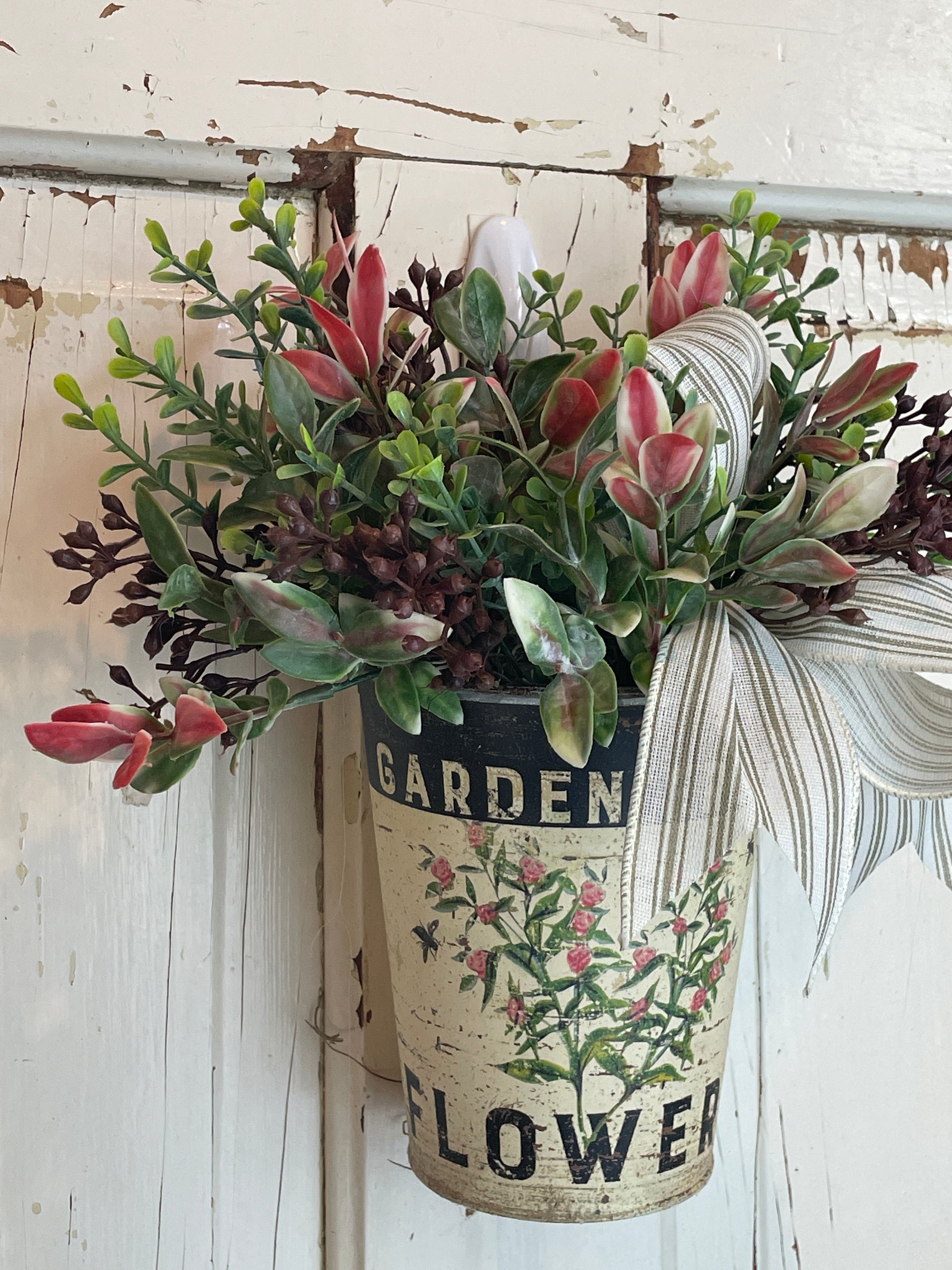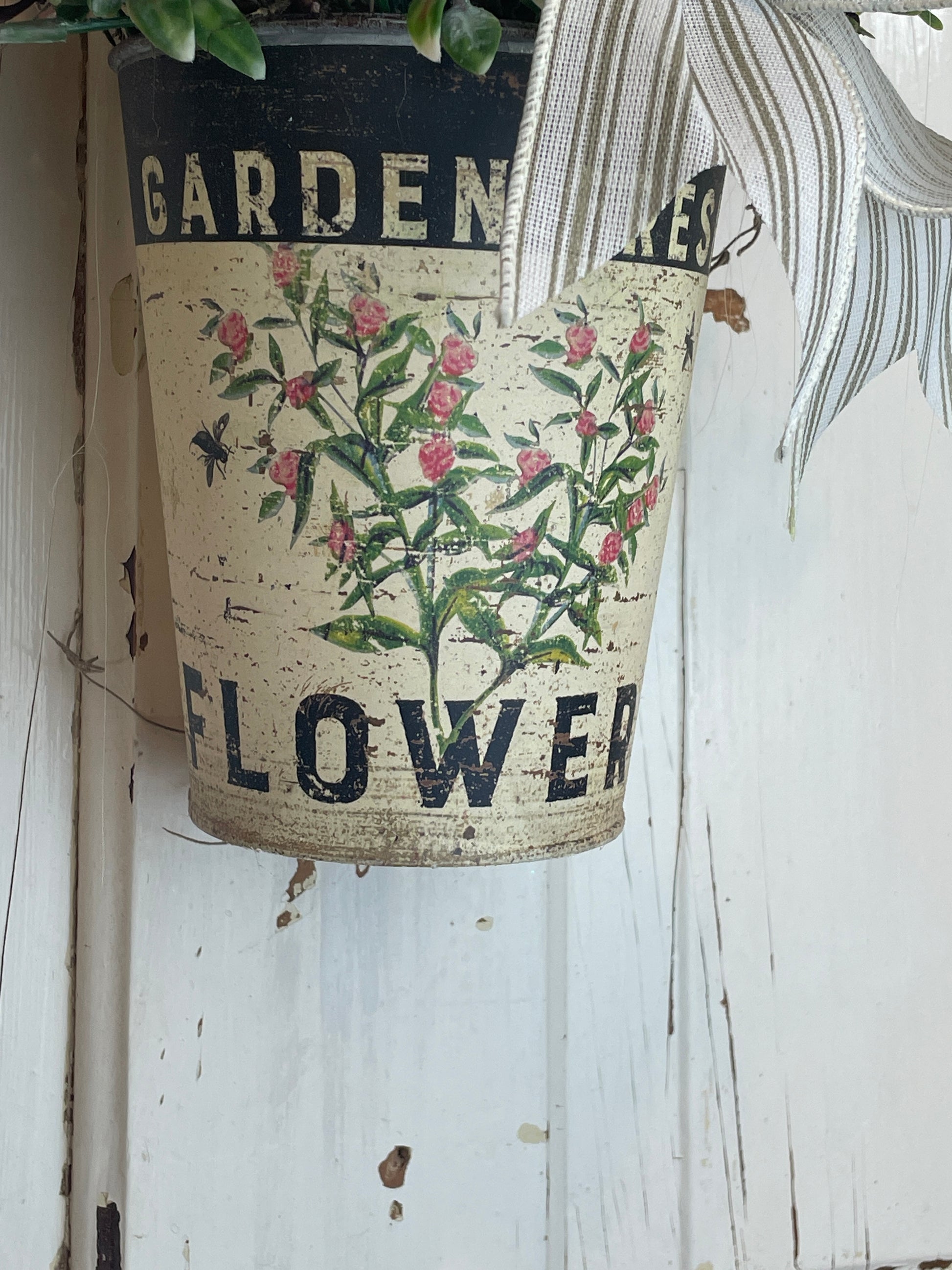 French Country Hanging Herb Basket with Faux Greenery and Rustic Metal Detail