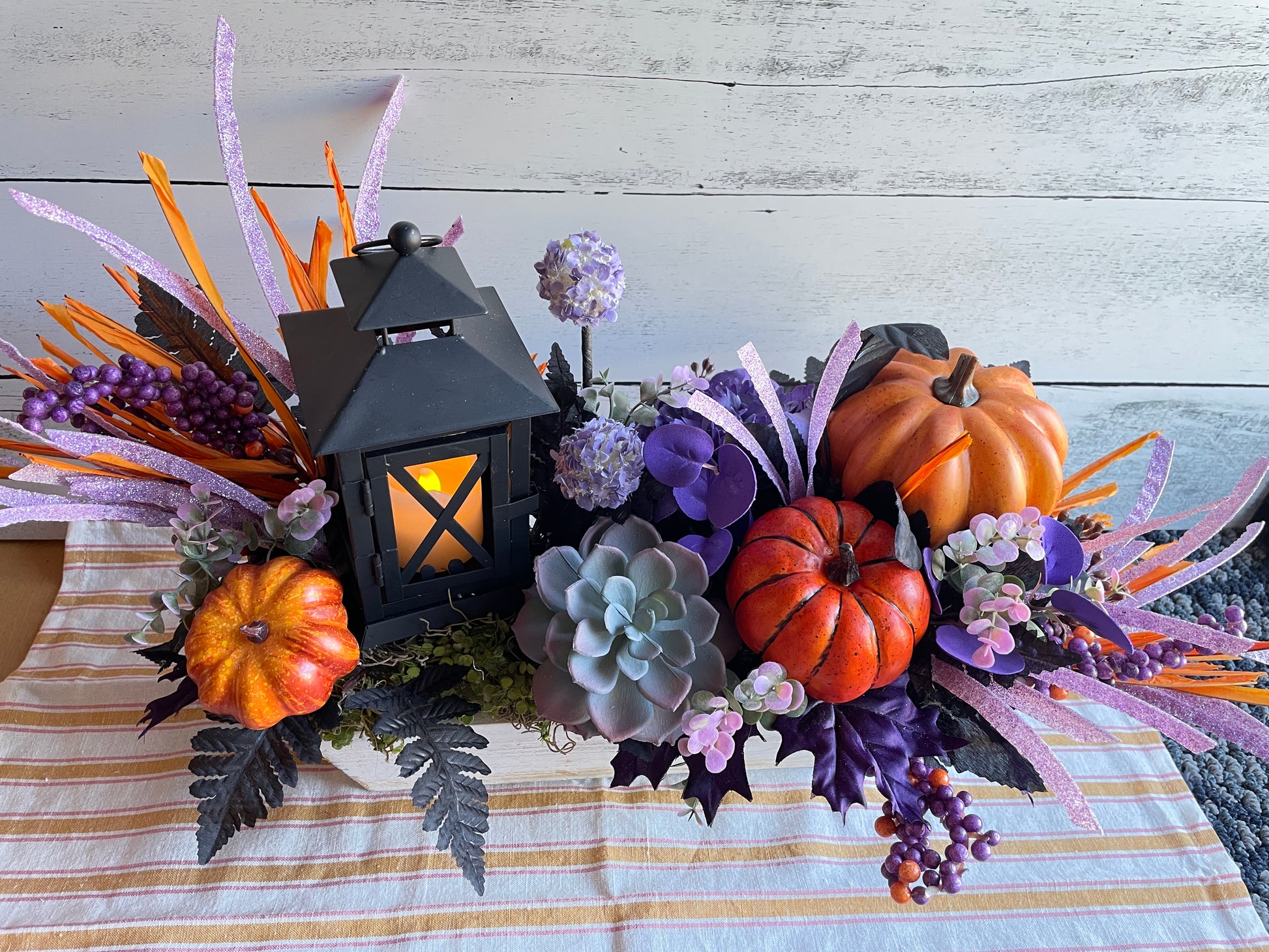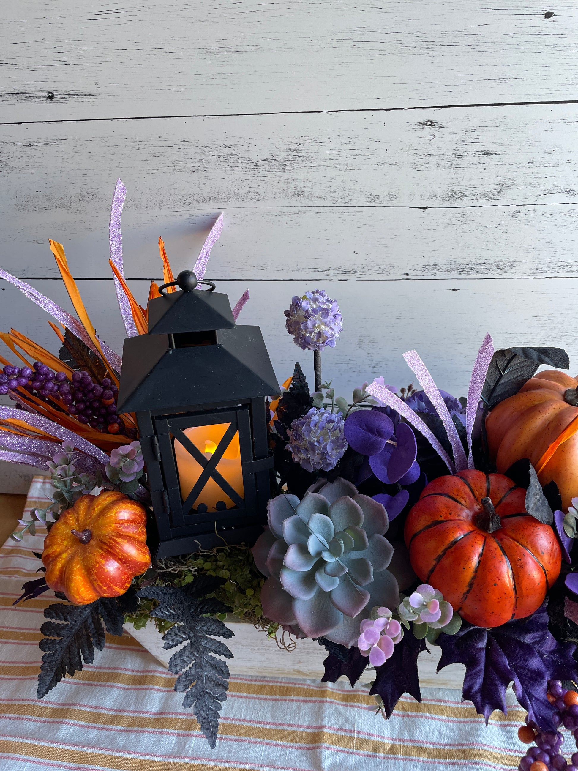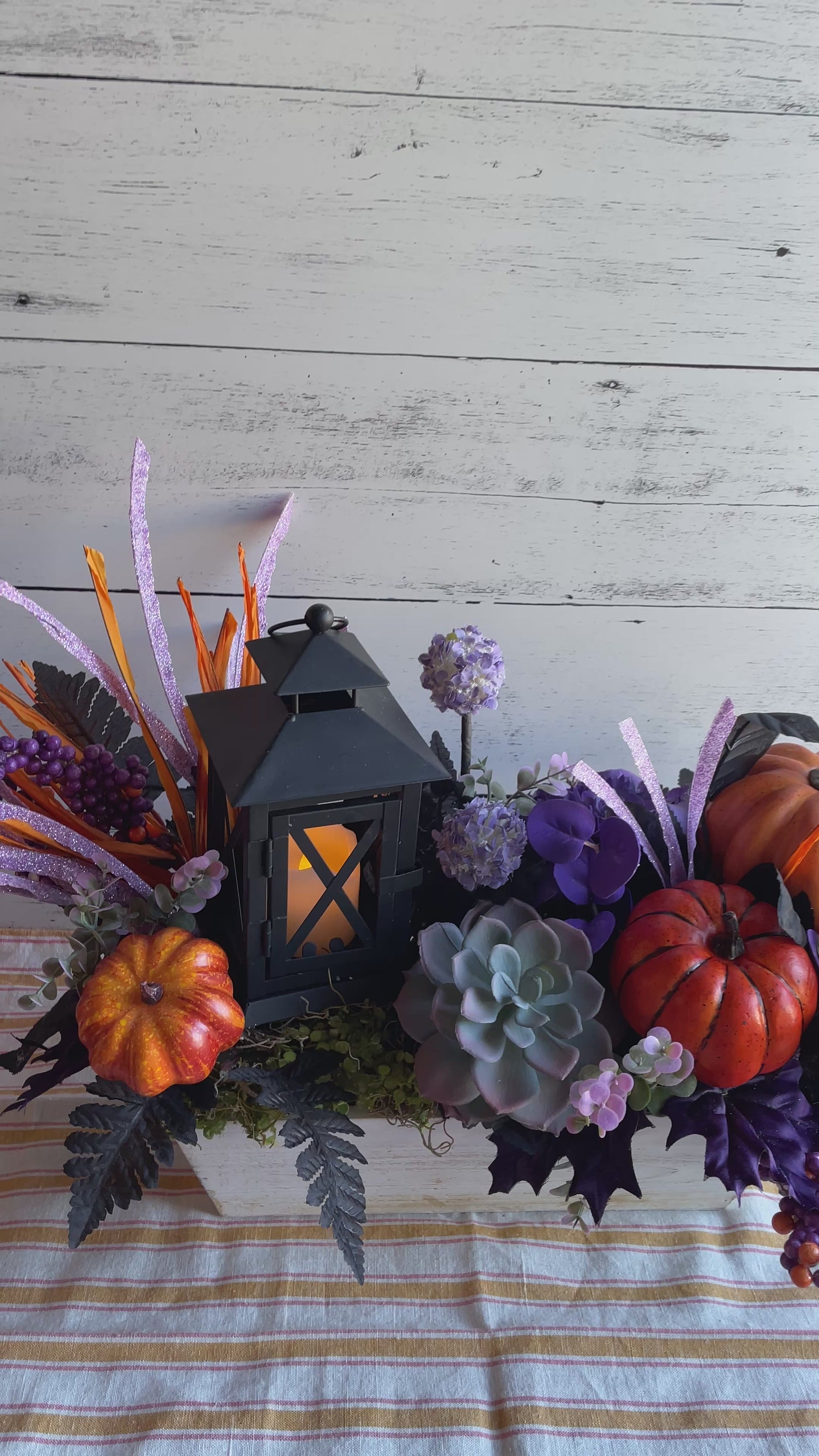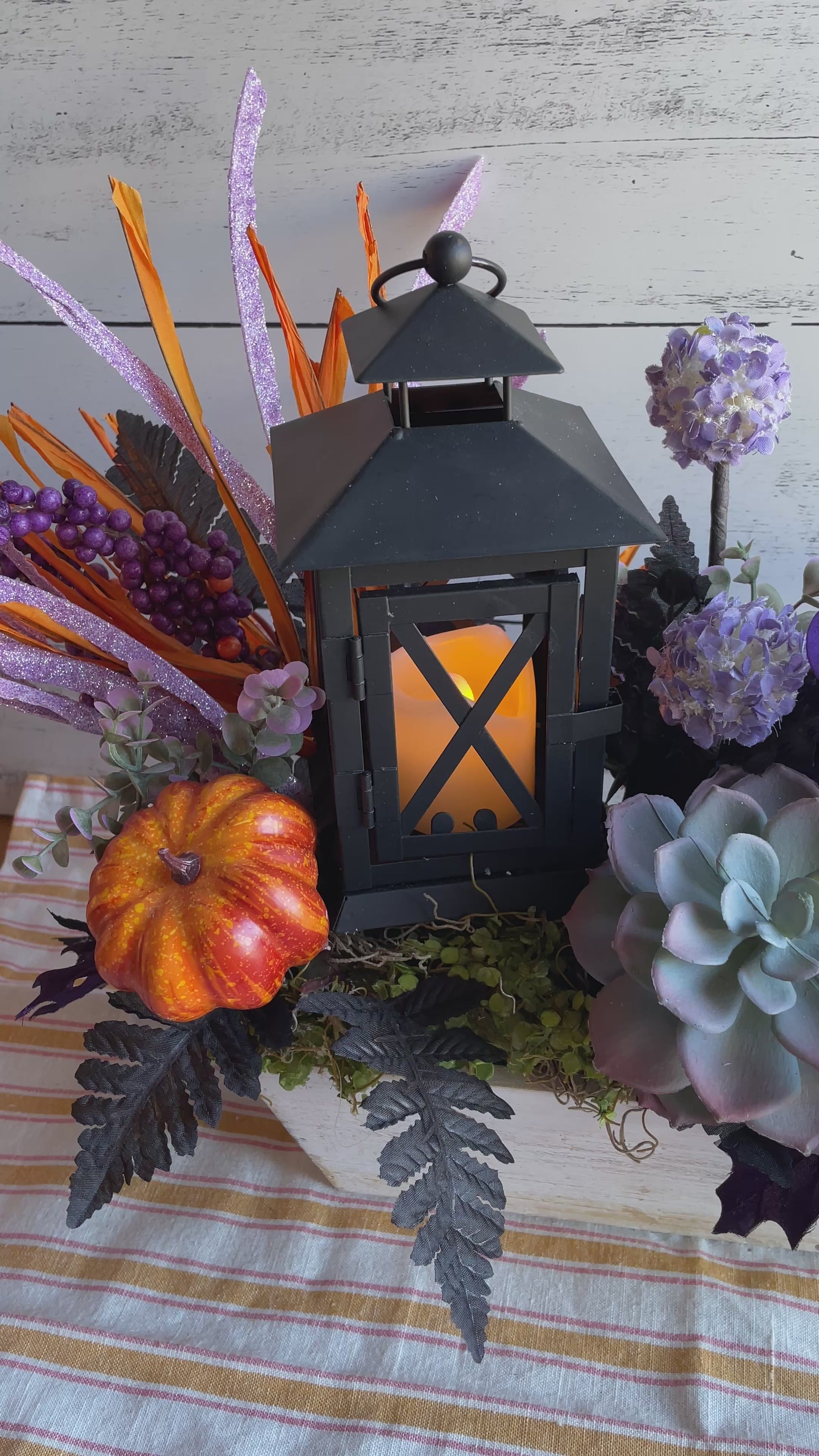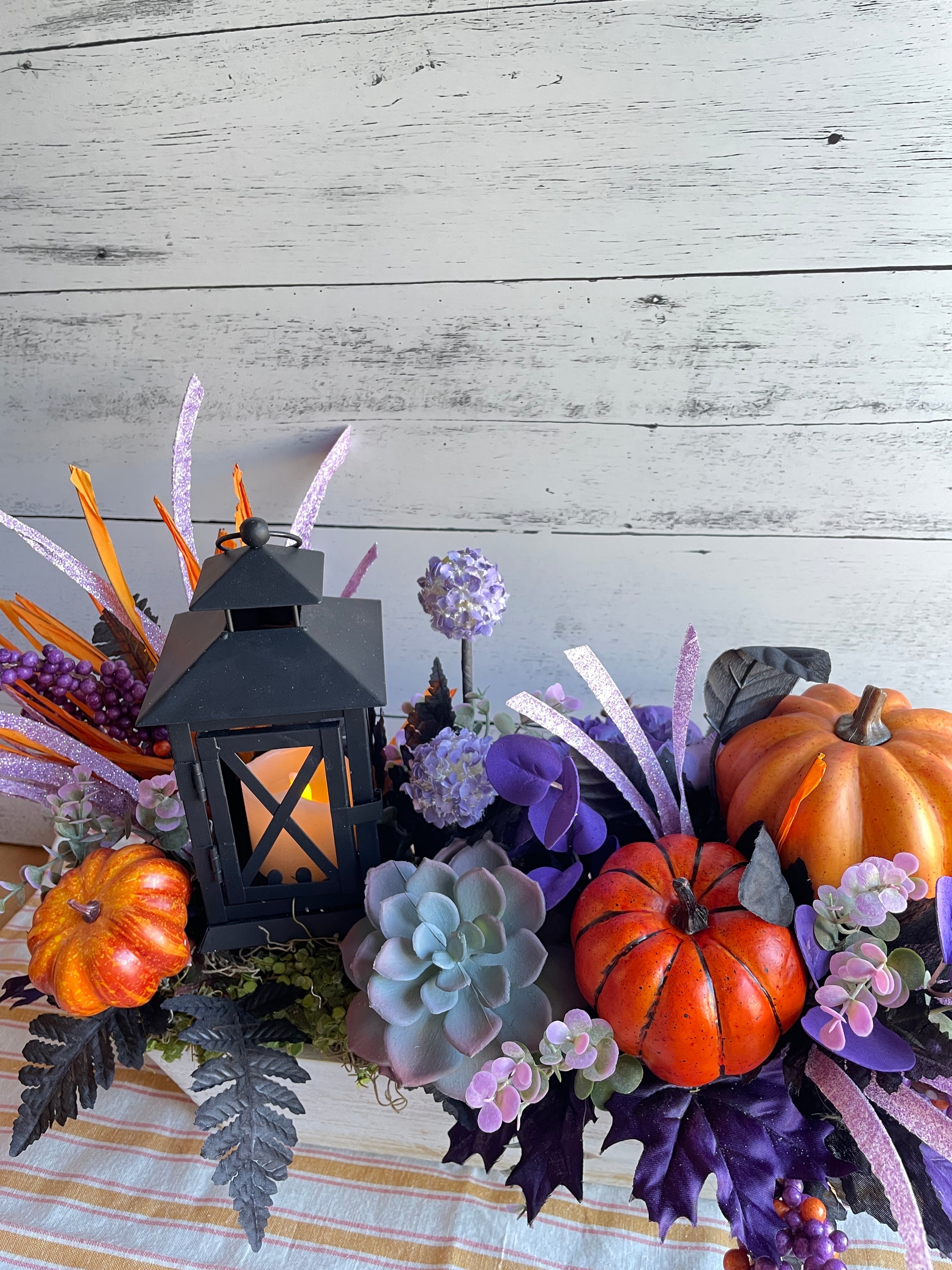 Make your autumn gatherings unforgettable with this bold and vibrant fall centerpiece. Anchored by a glowing lantern, this arrangement is brimming with harvest charm—featuring lifelike faux pumpkins, lush succulents, and dramatic black foliage. Sparkling lavender accents and orange textures add a touch of festive whimsy, while clusters of berries and hydrangeas create depth and richness.