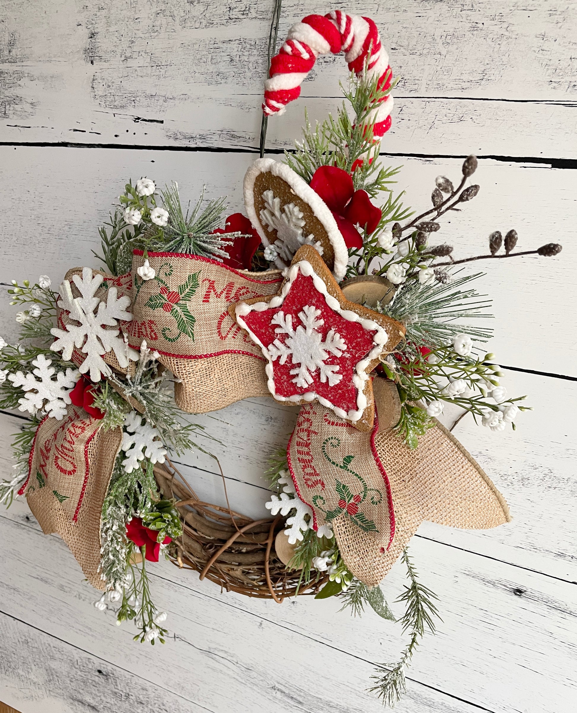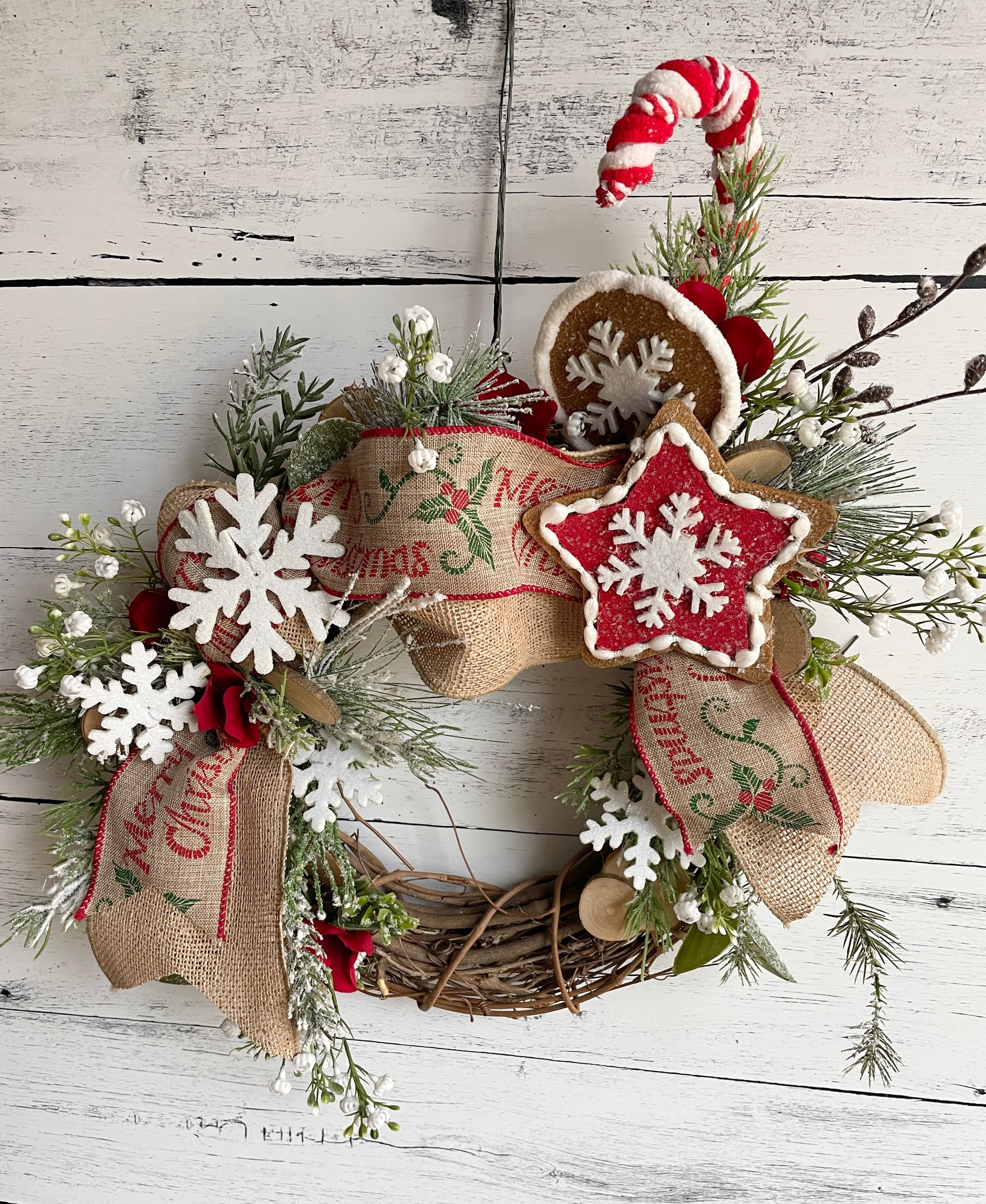 Embrace the joy of the holiday season with our delightful Whimsical Christmas Cheer Indoor Wreath. featuring a chenille candy cane and a snowflake gingerbread. This round wreath is a playful and festive addition to your Christmas decor, filled with unique elements that capture the spirit of the season.