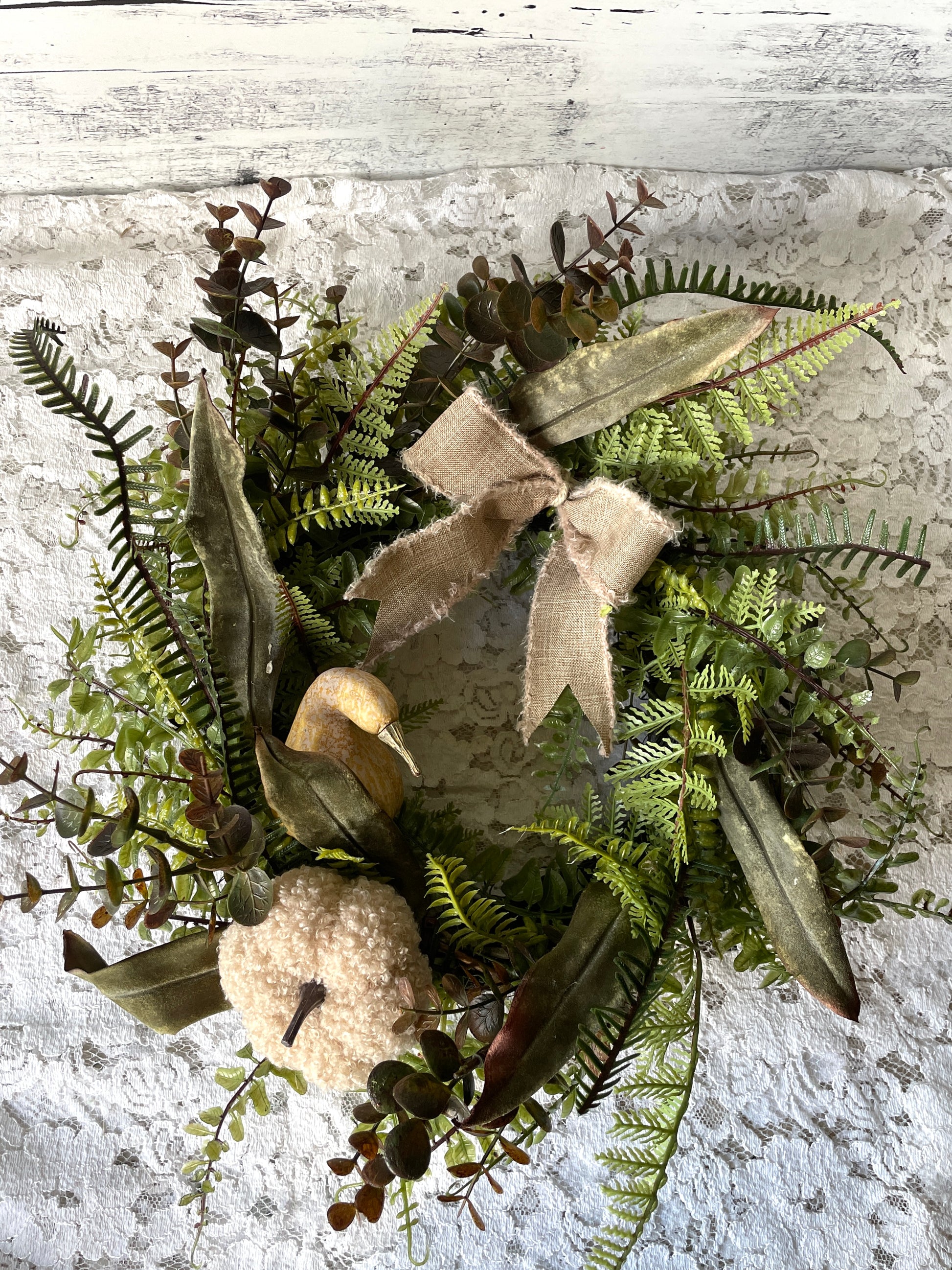 Neutral Fall Wreath with Faux Ferns, Pumpkins & Burlap Bow – Rustic Autumn Door Decor