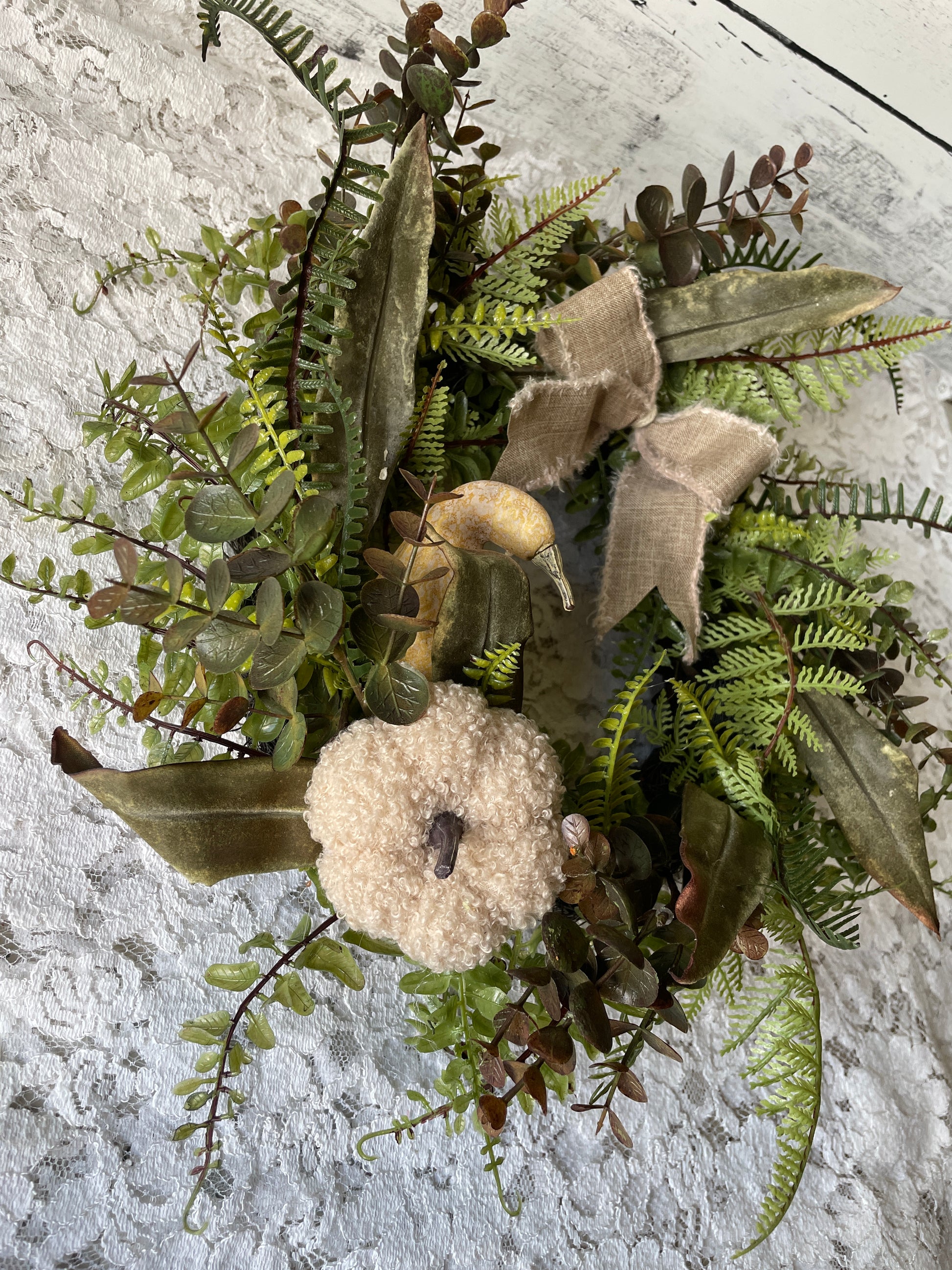 Bring the soft, earthy charm of autumn into your home with this Neutral Fall Wreath. Designed with lifelike faux ferns, preserved-looking eucalyptus, velvet leaves, and two neutral-toned pumpkins—including a cozy textured fabric pumpkin—this wreath adds a subtle seasonal touch to any space.