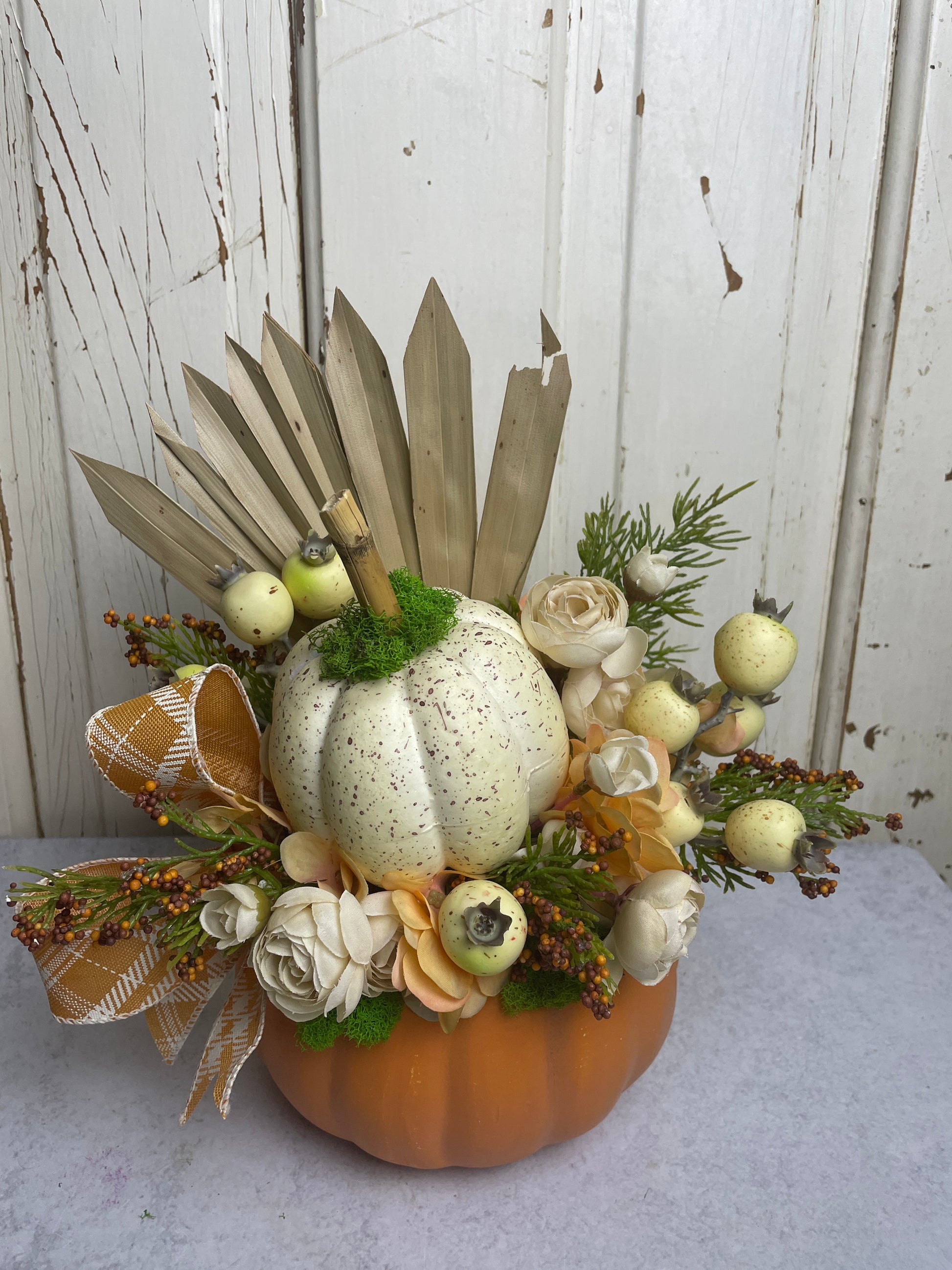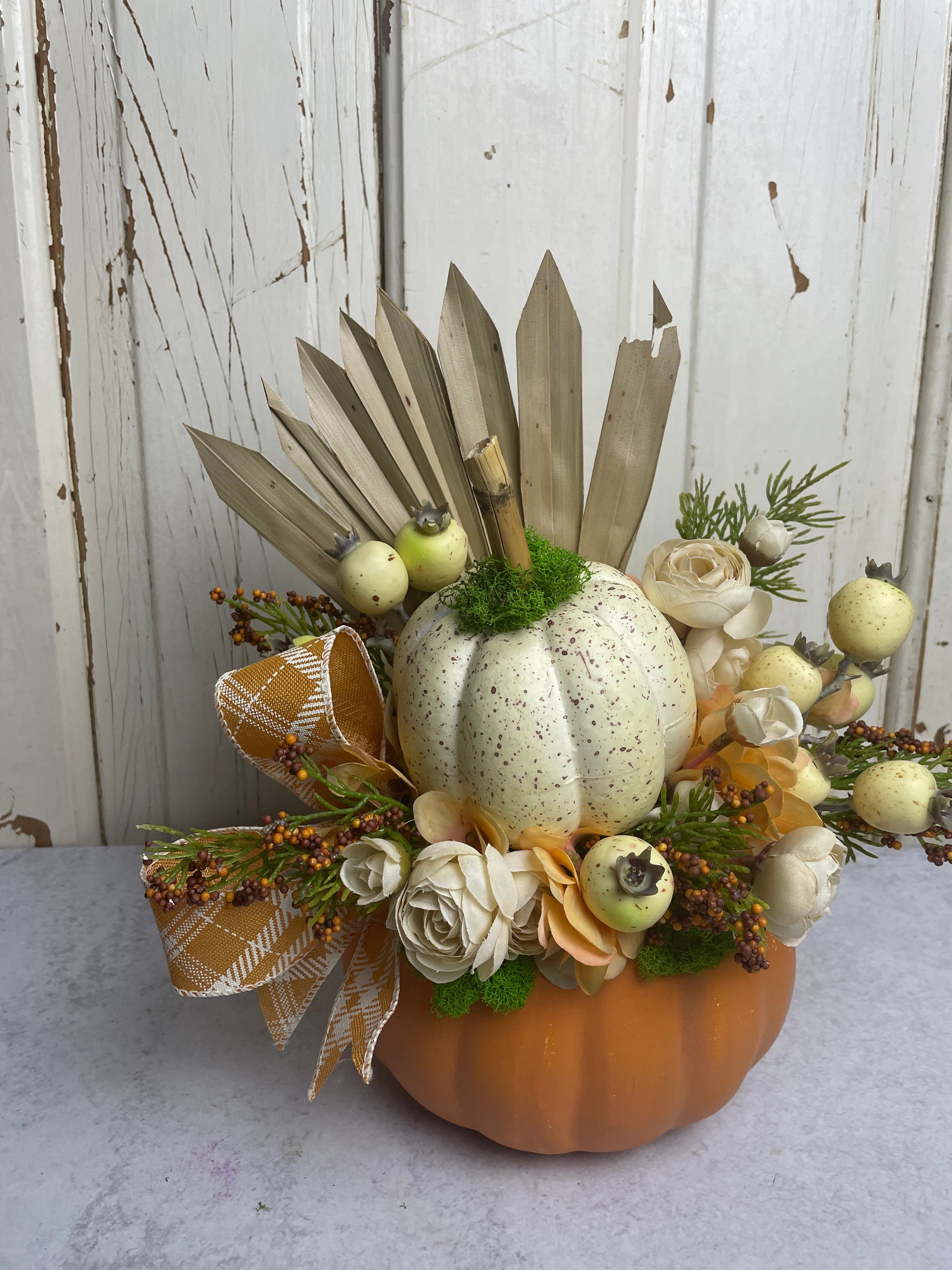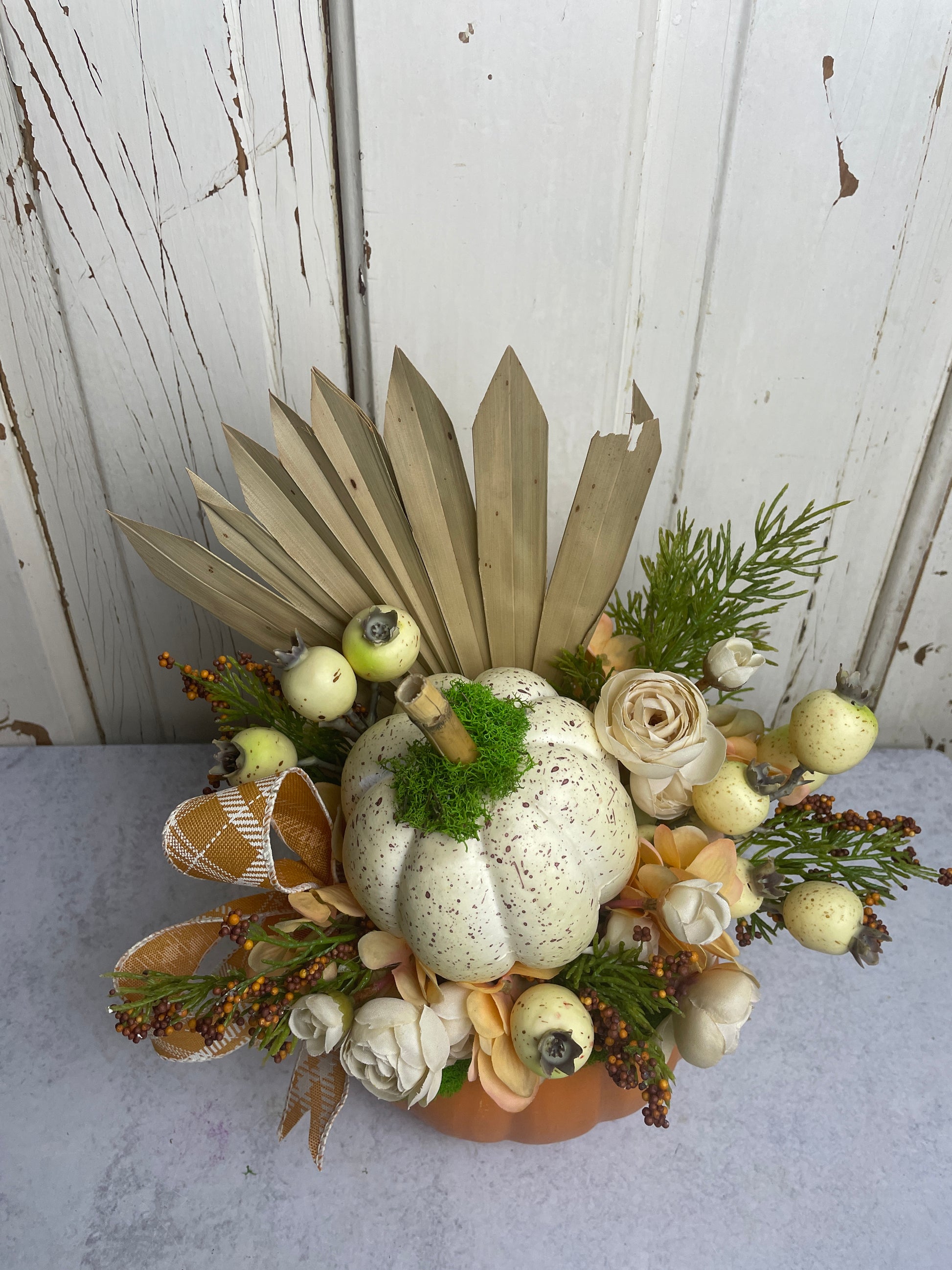 Designed inside a charming faux pumpkin base, the arrangement showcases elegant palm leaf accents, soft cream florals, and a speckled white pumpkin. The warm plaid ribbon and natural textures make it an ideal choice for seasonal decorating, whether as a statement Thanksgiving centerpiece or as an accent for your mantel or entryway.