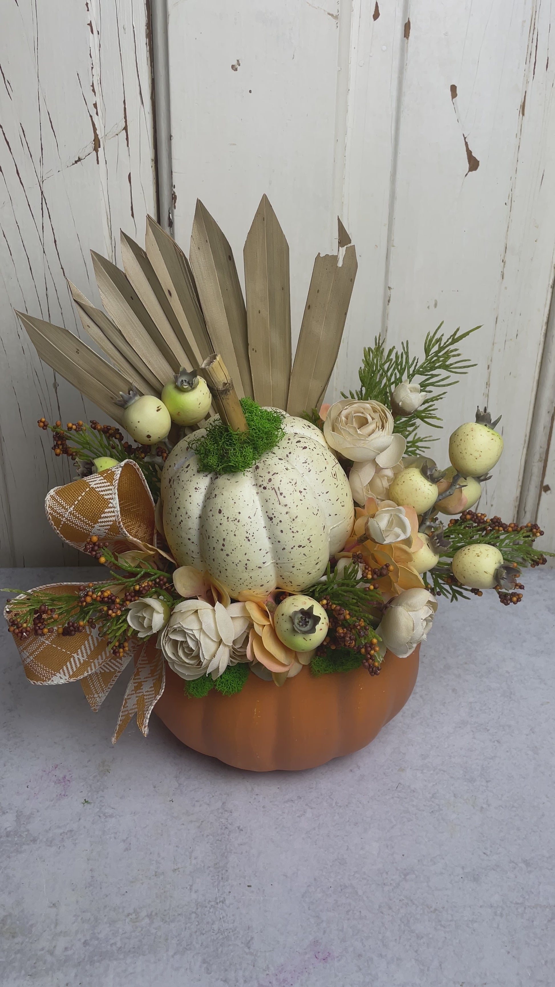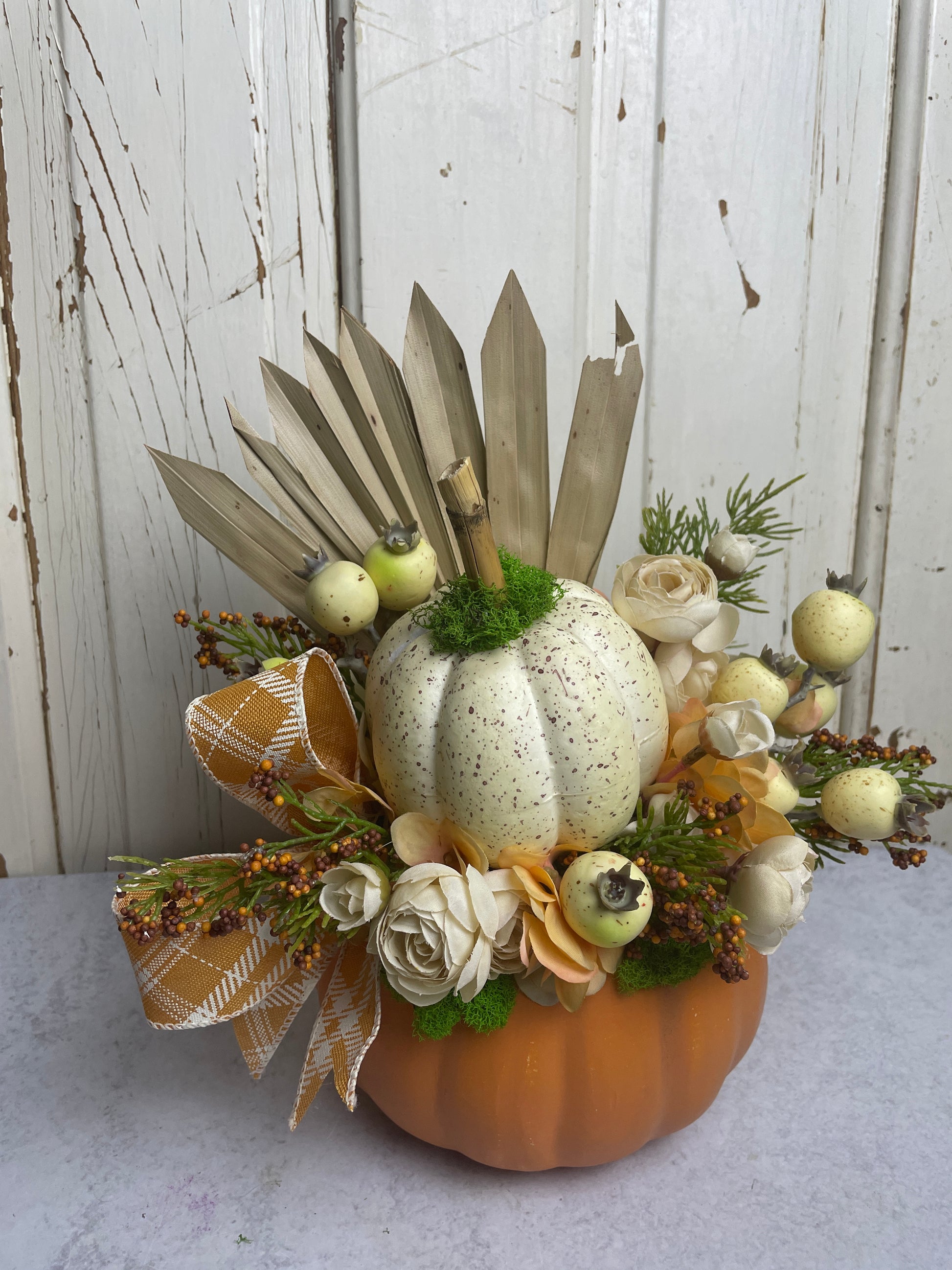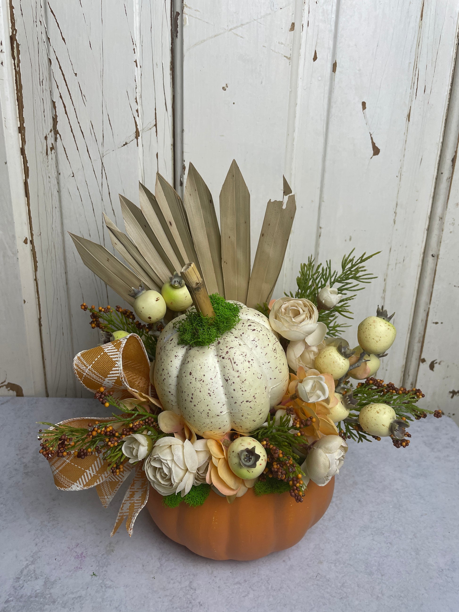 Designed inside a charming faux pumpkin base, the arrangement showcases elegant palm leaf accents, soft cream florals, and a speckled white pumpkin. The warm plaid ribbon and natural textures make it an ideal choice for seasonal decorating, whether as a statement Thanksgiving centerpiece or as an accent for your mantel or entryway.